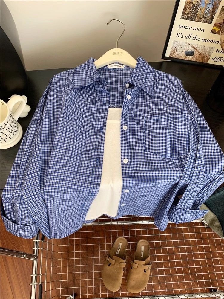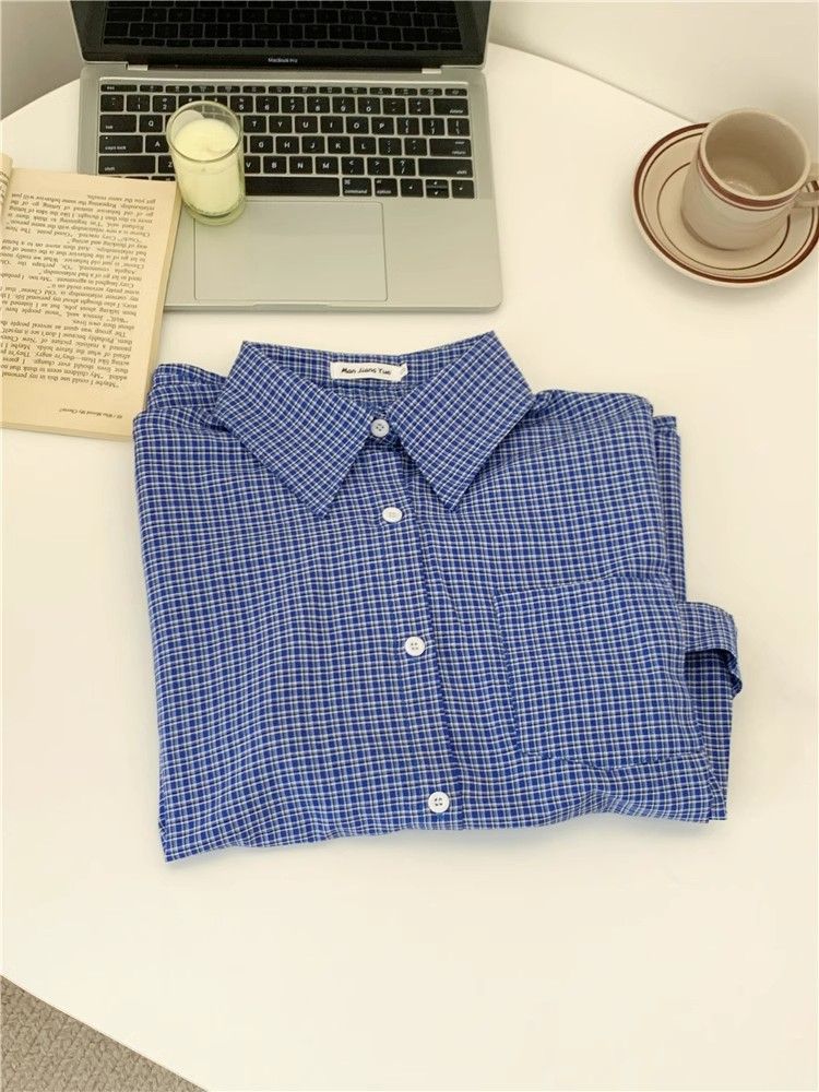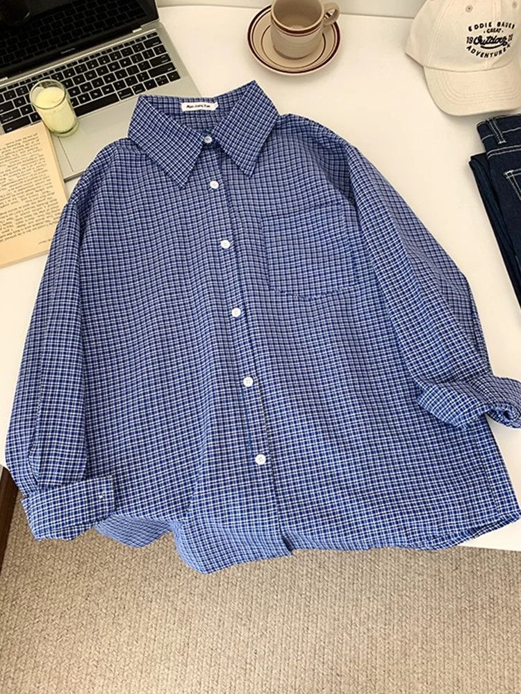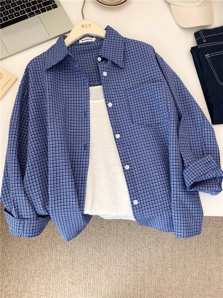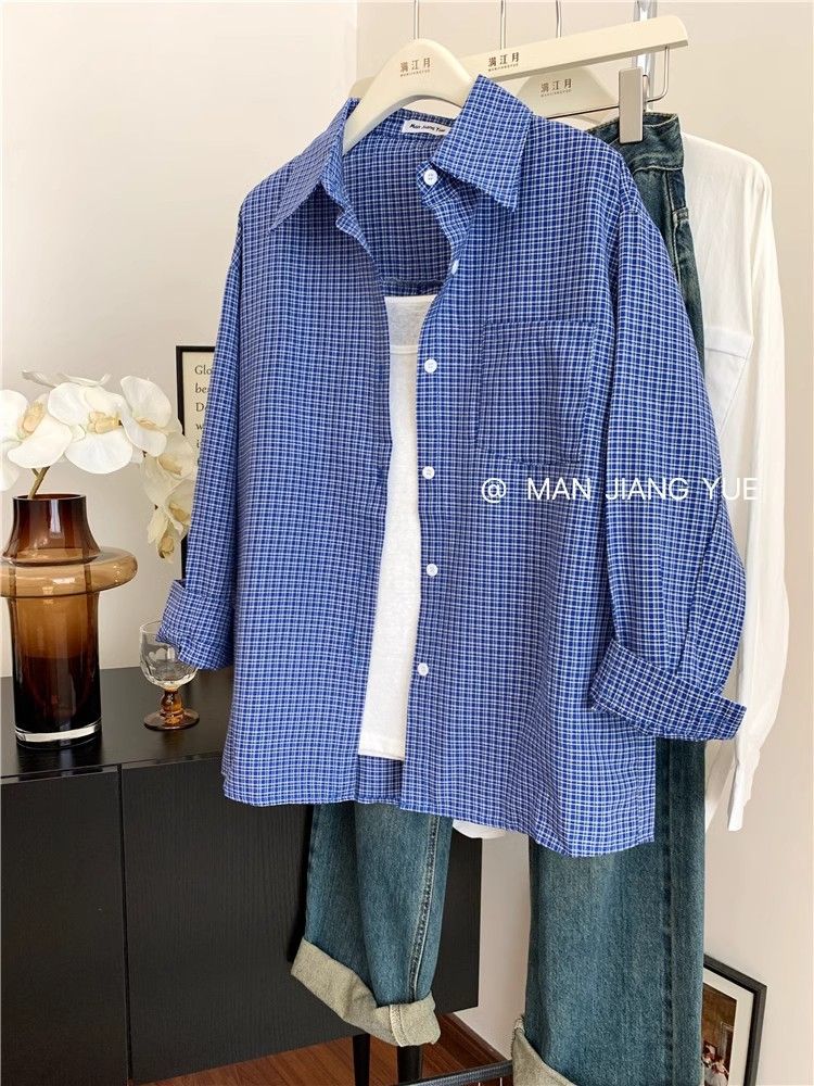 여성을위한 파란색 격자 무늬 긴팔 셔츠 코트 탑 초가을 복고풍 게으른 스타일 느슨한 캐주얼 슬림 격자 무늬 셔츠스토어 가기