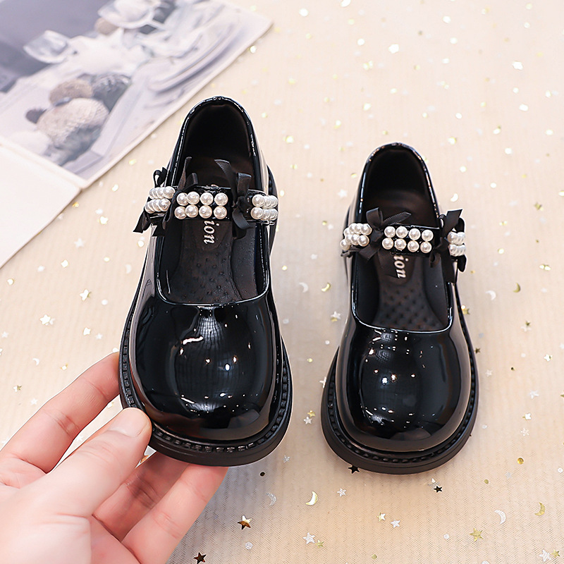 어린이 검은 캐주얼 신발 2025 가을 새로운 여자 패션 구슬 장식 나비 꽃 에나멜 가죽 공주 작은 가죽 신발