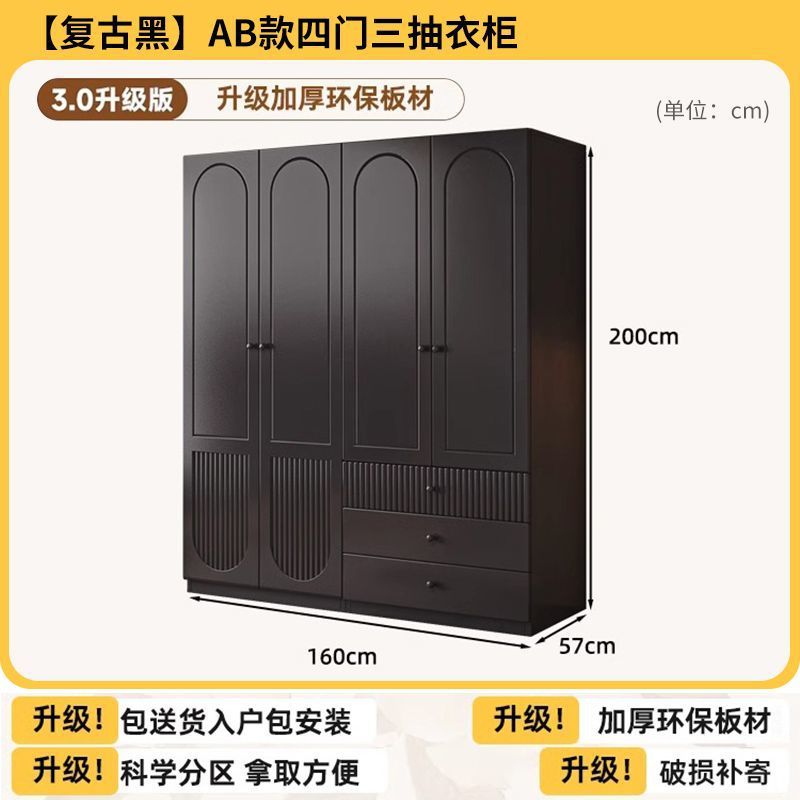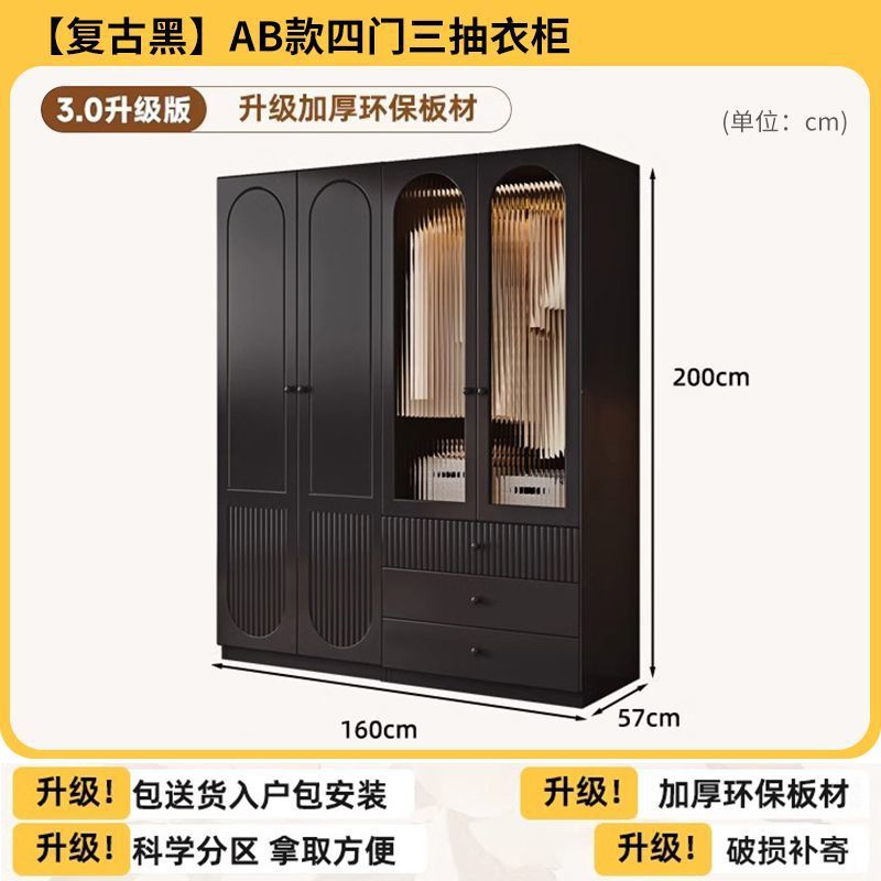 • 레트로 블랙 우드 도어-AB 스타일 160cm 옷장 + 상단 캐비닛