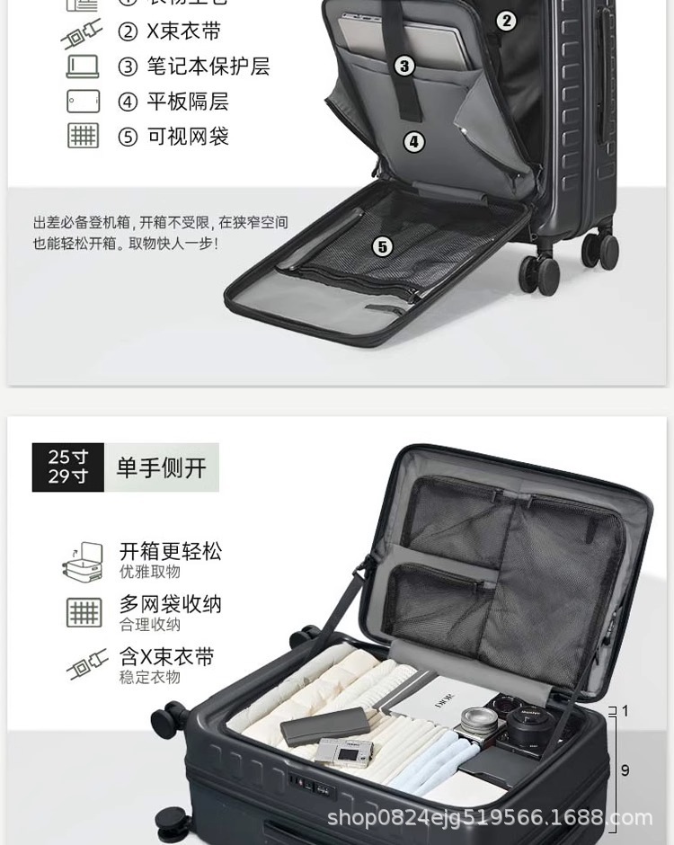 ASSODA2025 새로운 전면 개방 확장 가능한 가방 여성 20inch 탑승 케이스 유니버설 휠 29 트롤리 케이스