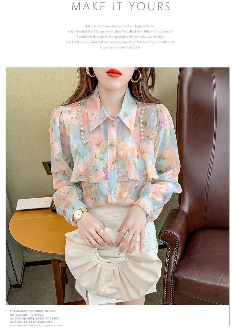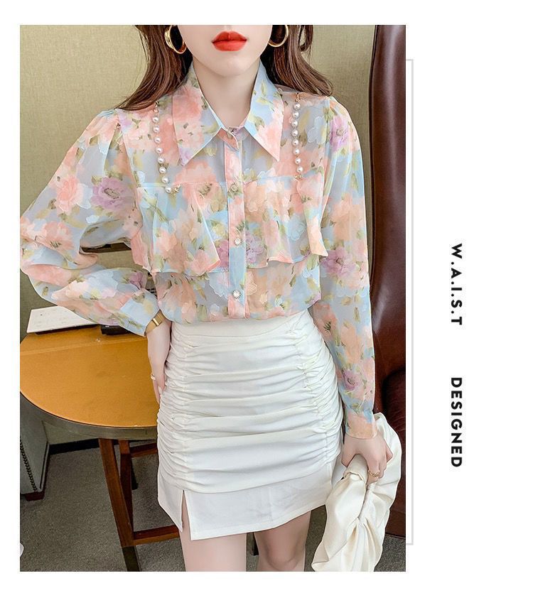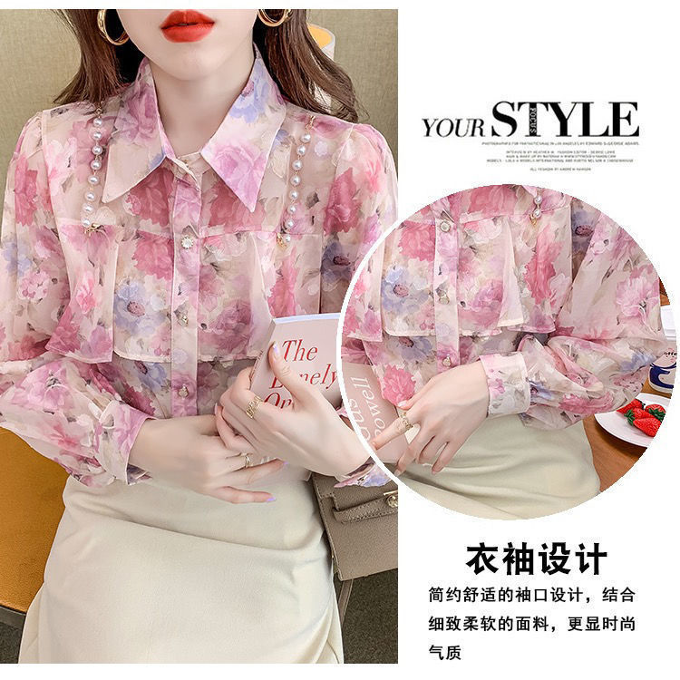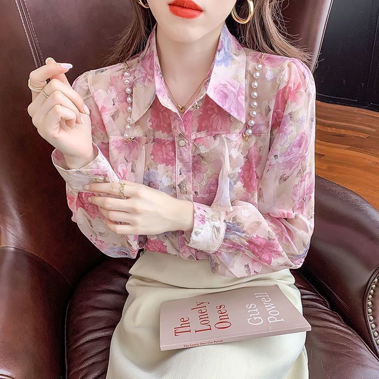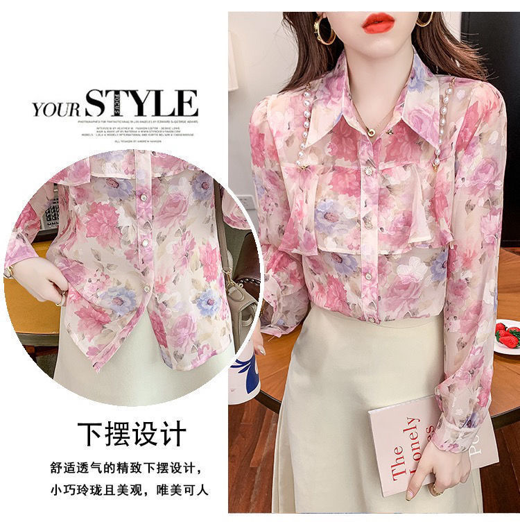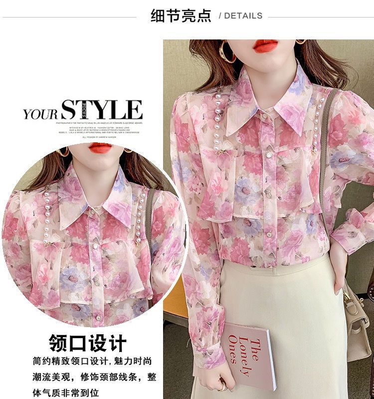 2025년 새로운 여름 스타일, 다재다능한 디자인, 진주 러플 꽃무늬 쉬폰 패셔너블하고 달콤한 긴팔 셔츠스토어 가기