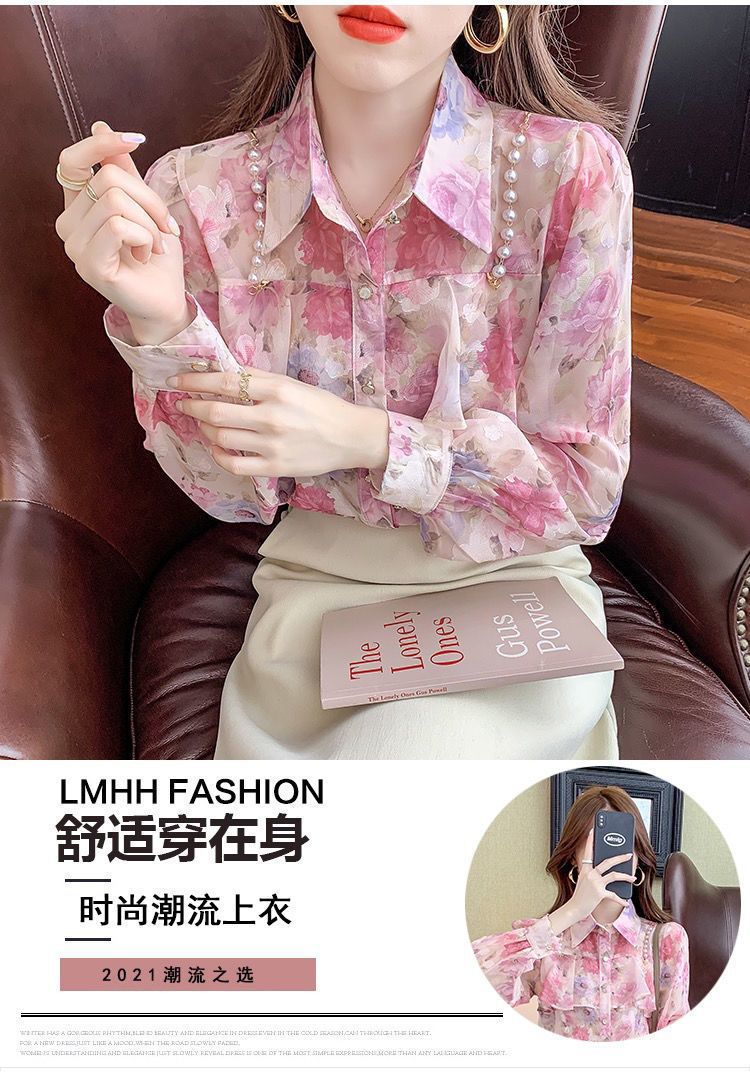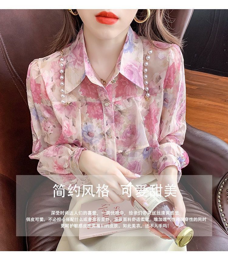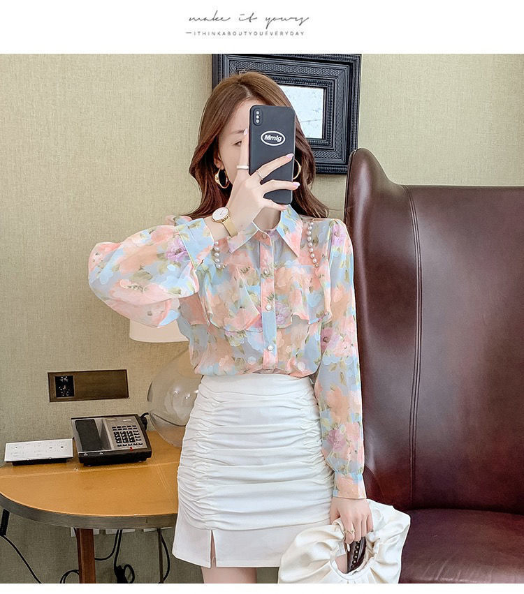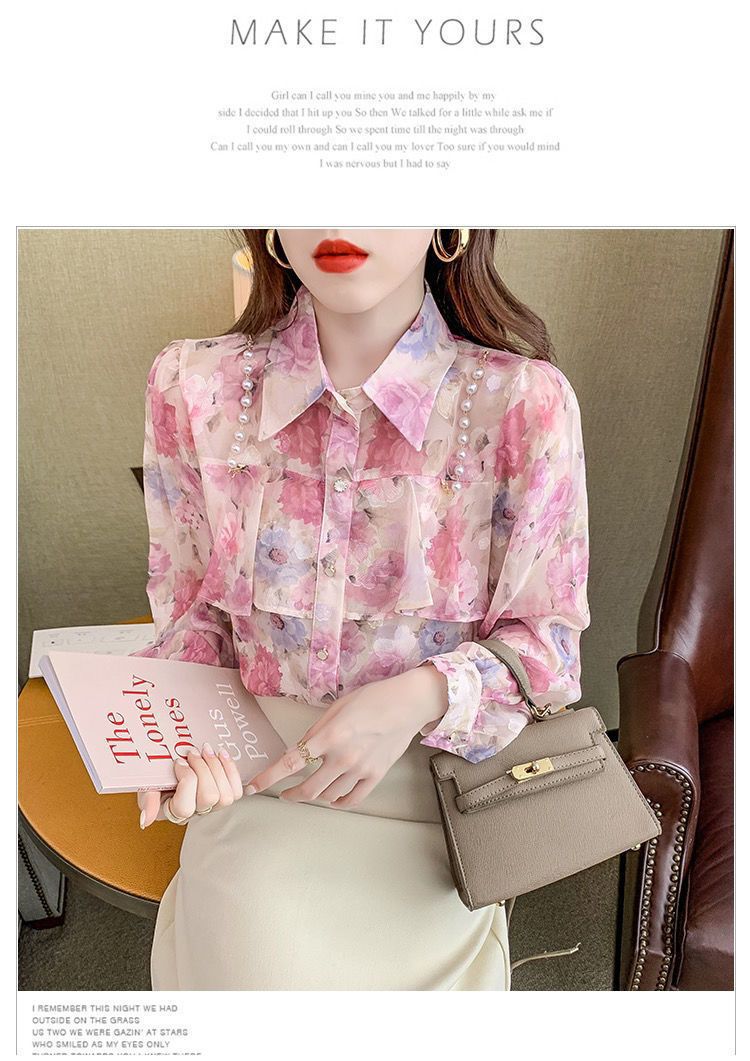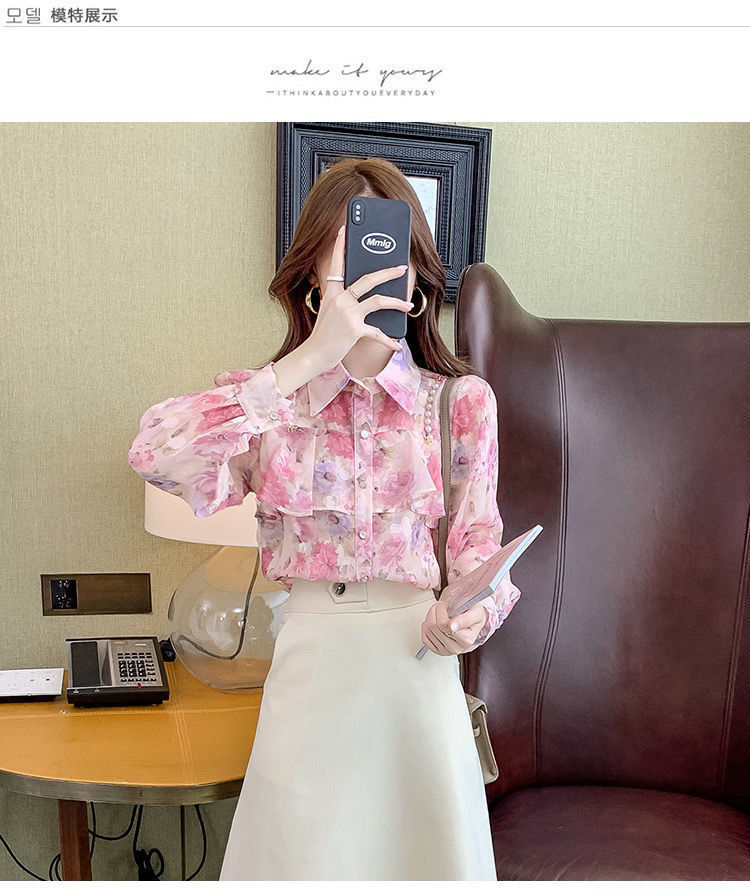 2025년 새로운 여름 스타일, 다재다능한 디자인, 진주 러플 꽃무늬 쉬폰 패셔너블하고 달콤한 긴팔 셔츠스토어 가기