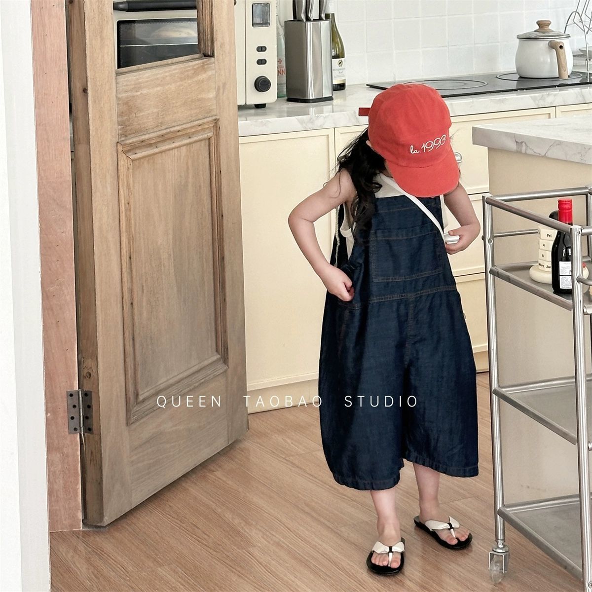 한국 스타일 아동복 소녀 느슨한 데님 작업복 2025 여름 새로운 중립 아기 유행 가벼운 작업복