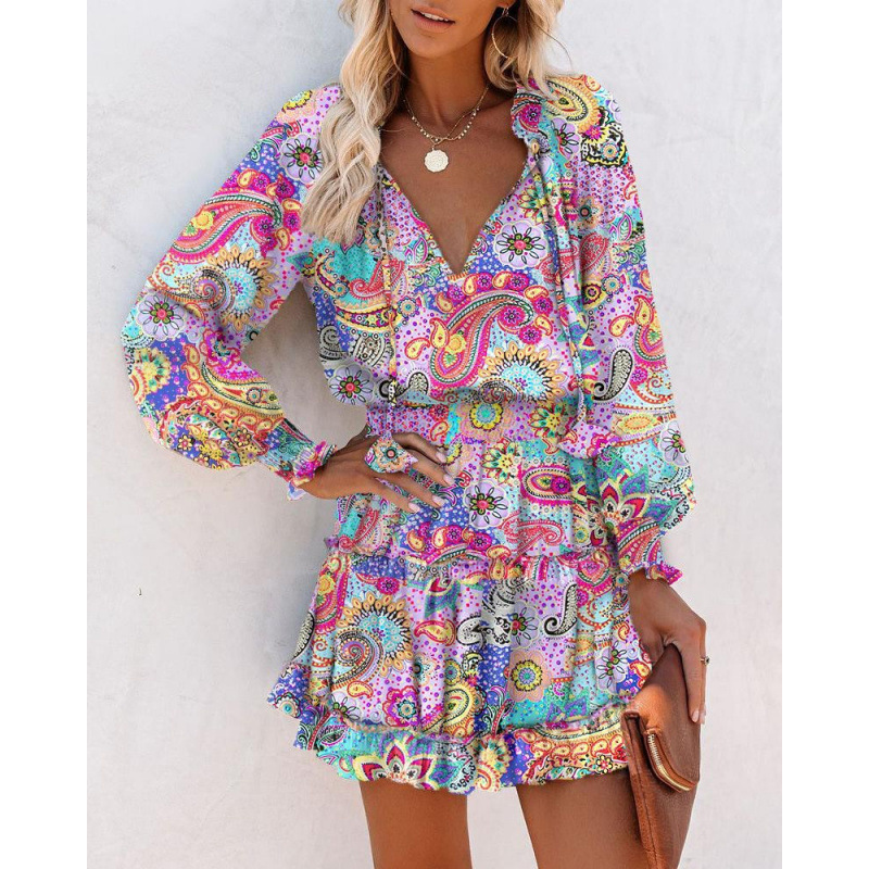 2025 독립 웹사이트 wish 인기 봄 여름 긴팔 v 넥 패션 프린트 허리 드레스 여성 의류스토어 가기
