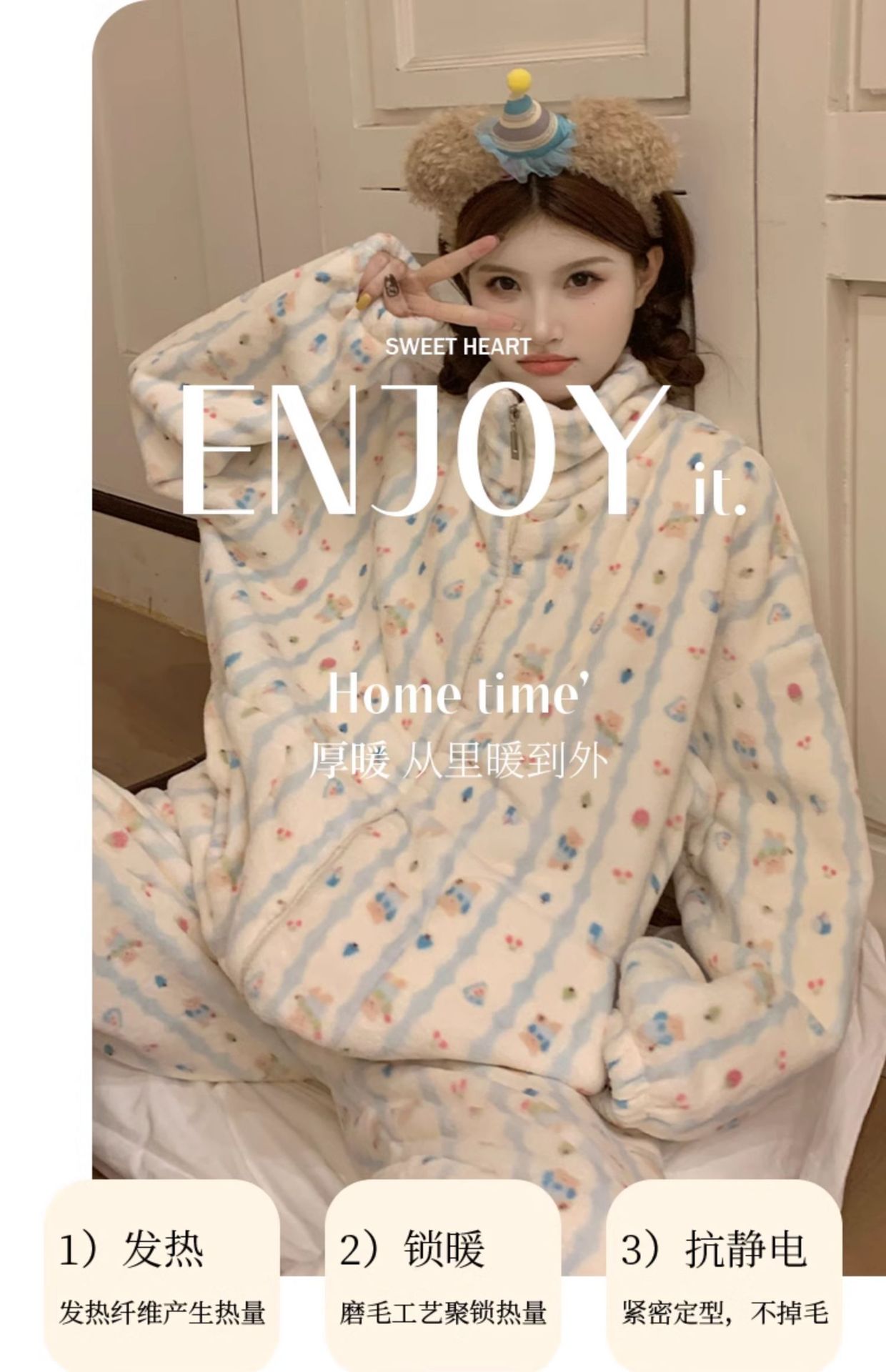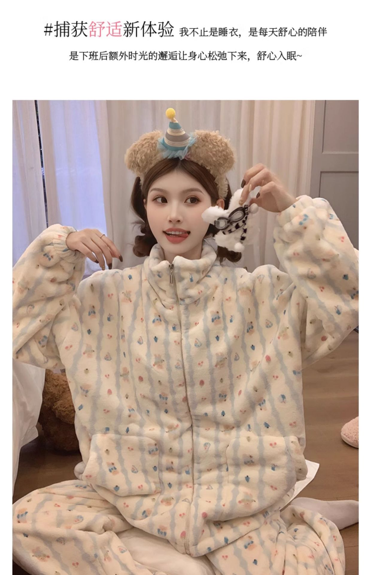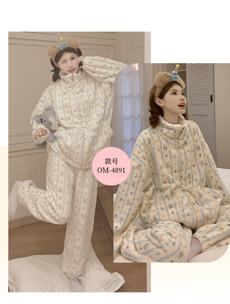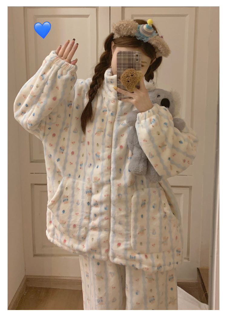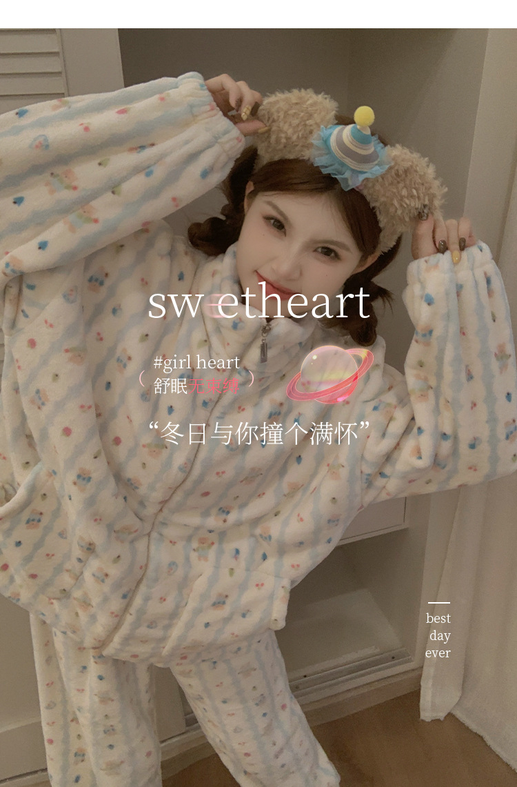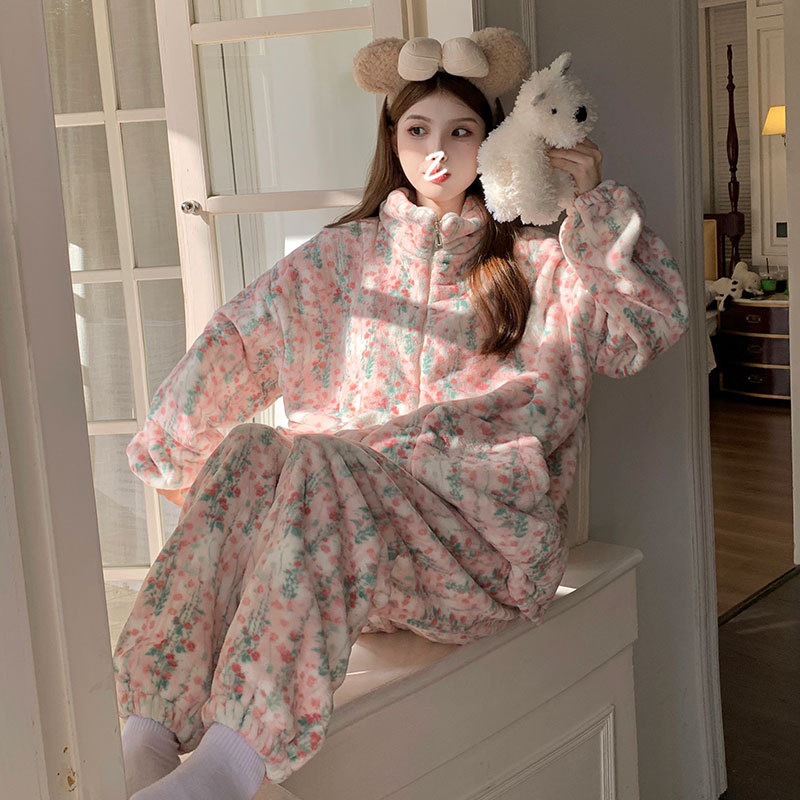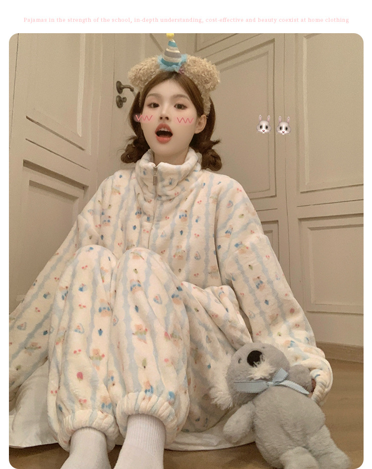 봄, 가을, 겨울 여성용 산호 벨벳 잠옷, 두껍고 따뜻한 지퍼, 귀여운 스타일의 가정복 투피스 슈트, 인터넷 연예인 곰스토어 가기