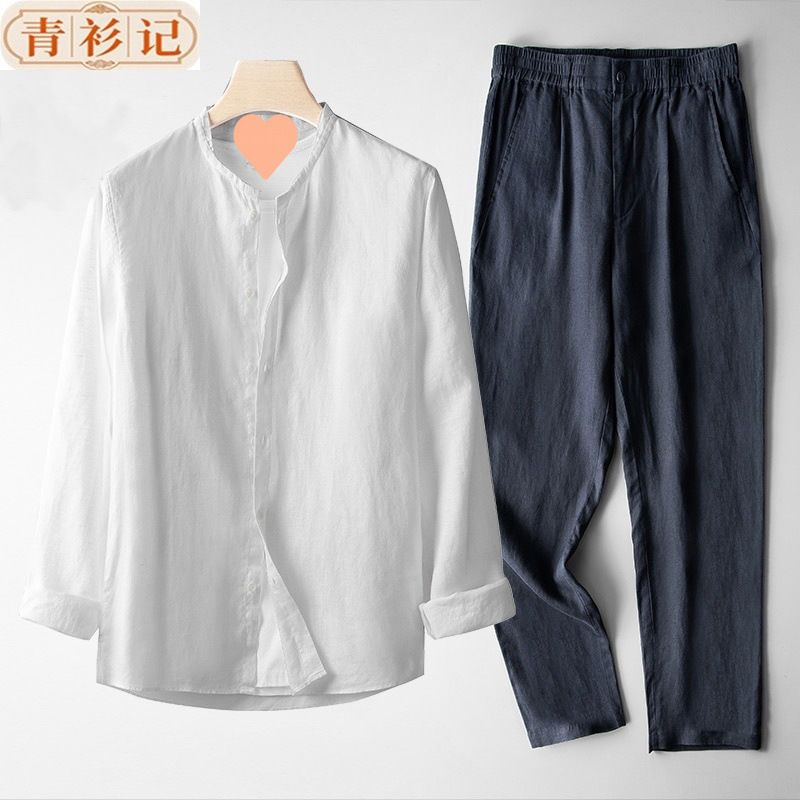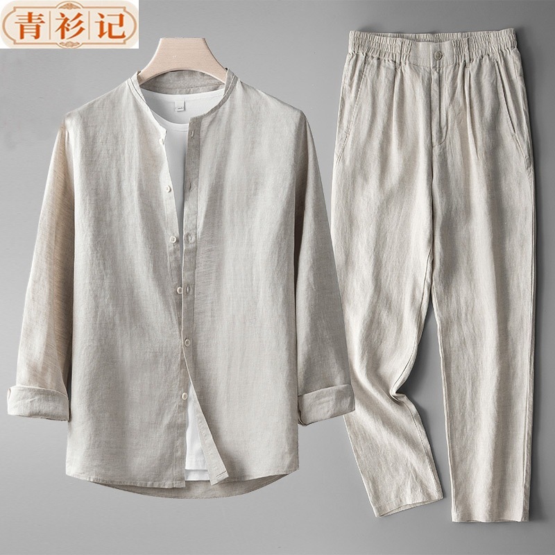 남성용 새로운 중국 스타일 린넨 당나라 정장 정장 복고풍 얇은 긴팔 중국 스타일 면화 및 린넨 통기성 캐주얼 셔츠 투피스 세트