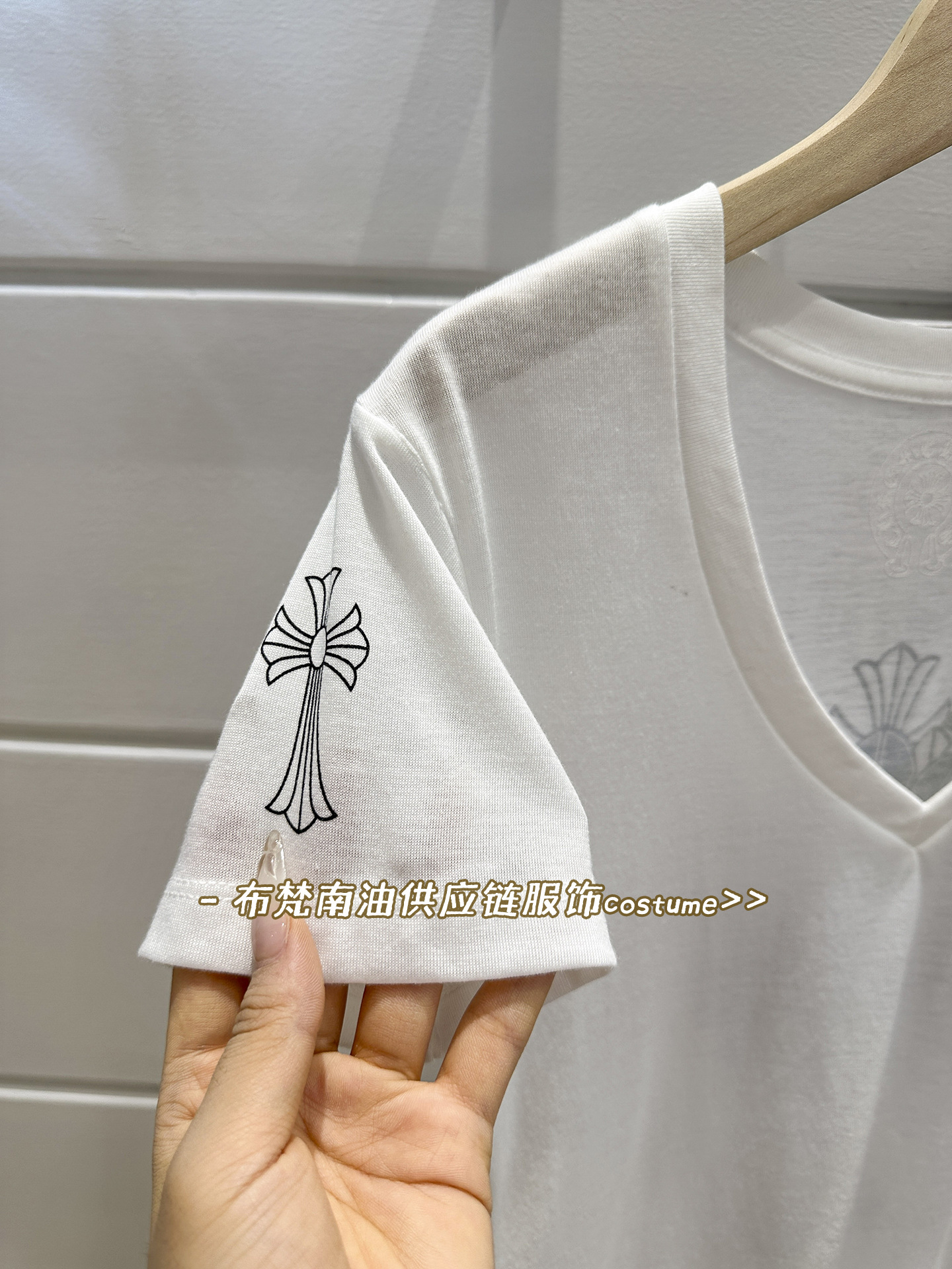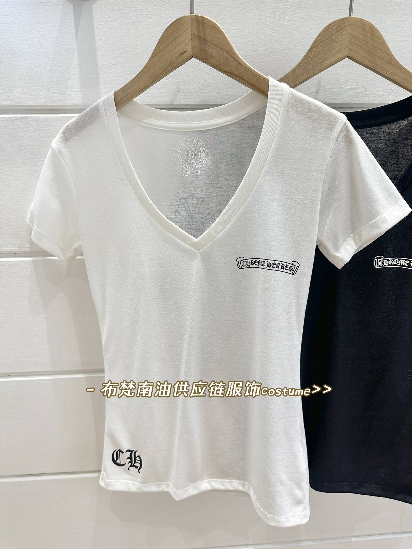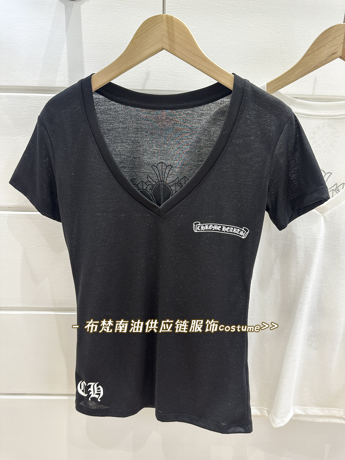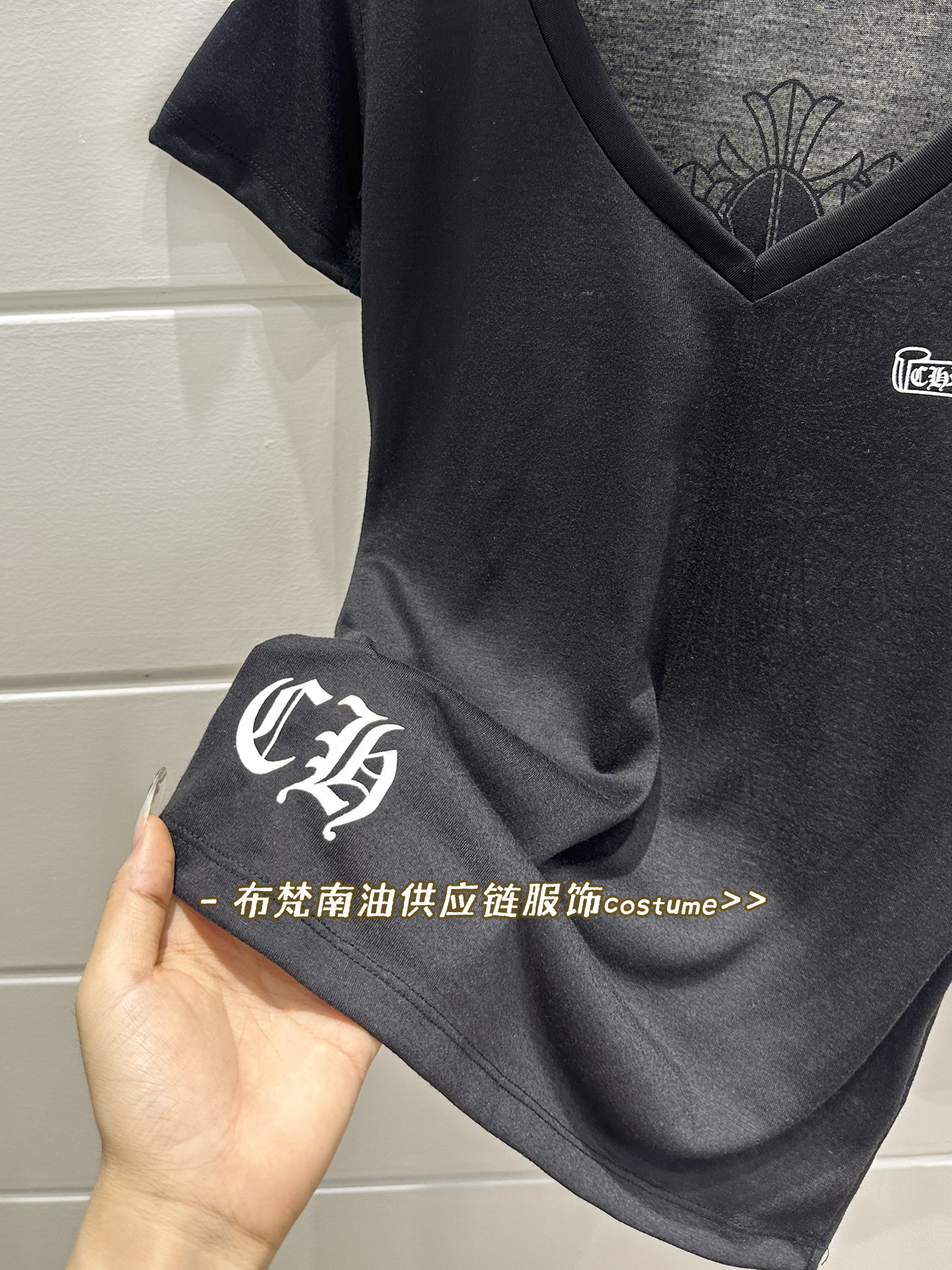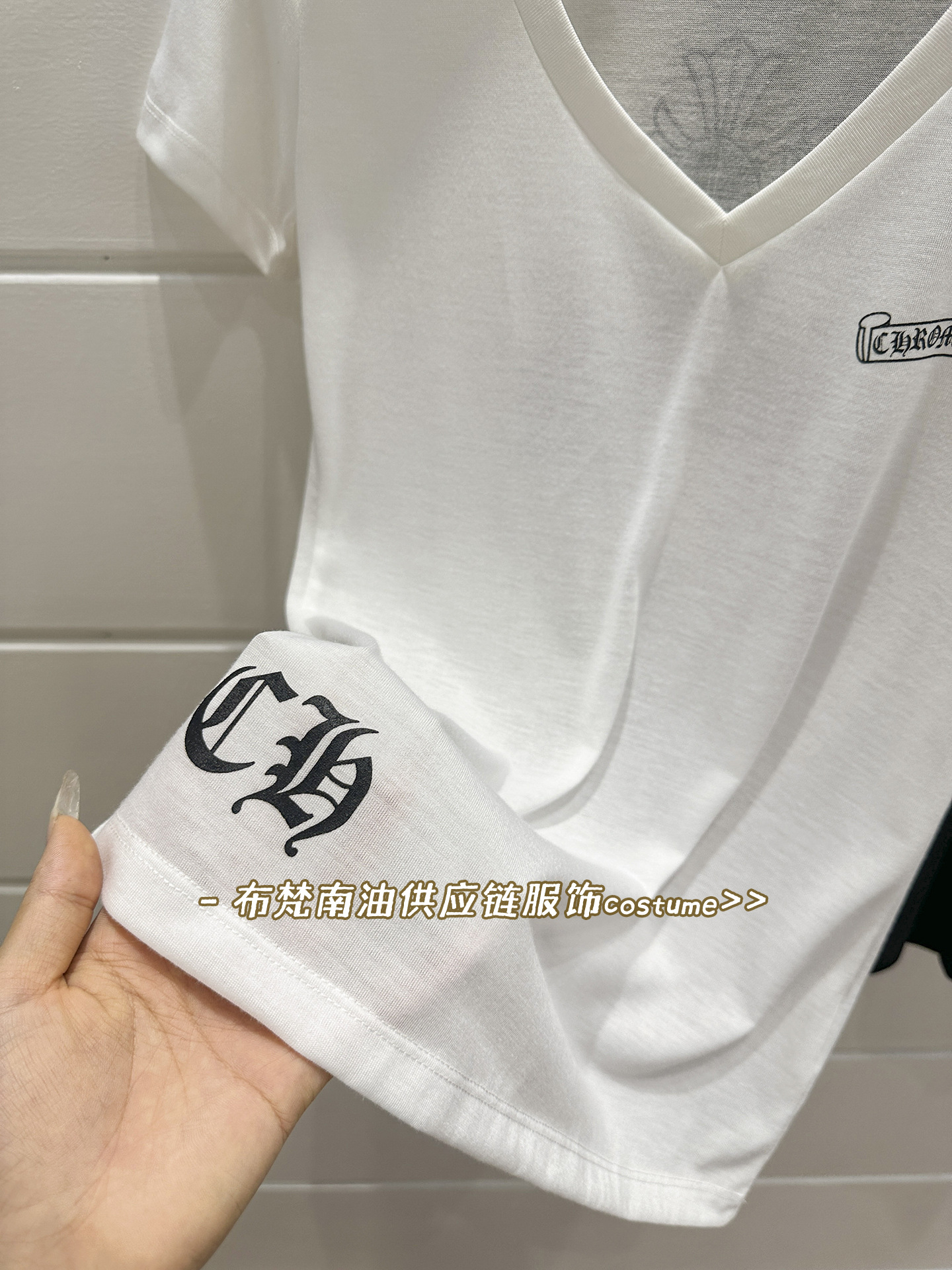 Shenzhen Nanyou Correct Edition CH 산스크리트 크로스 프린트 V 넥 반팔 티셔츠 여성용 25 여름 신작 코튼 탑스토어 가기