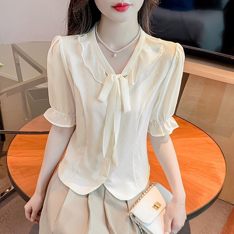 여성을위한 프렌치 보우 타이 반팔 셔츠 2025 여름 새로운 틈새 디자인 라이트 럭셔리 시크 탑 트렌디