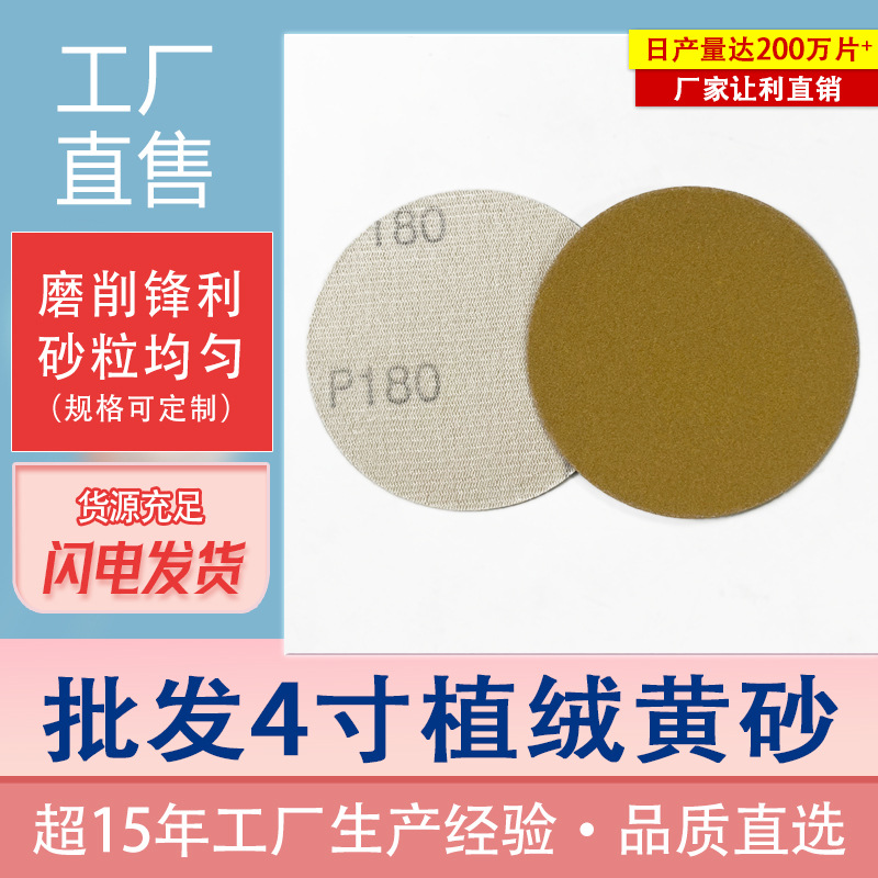 플록킹 4inch 노란색 모래 4inch 구멍이 없는 원형 사포 자동차 페인트 연마 노란색 모래 반부서진 커런덤