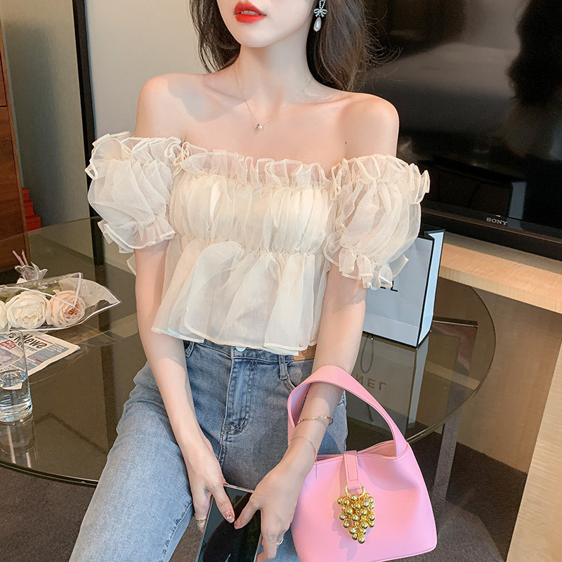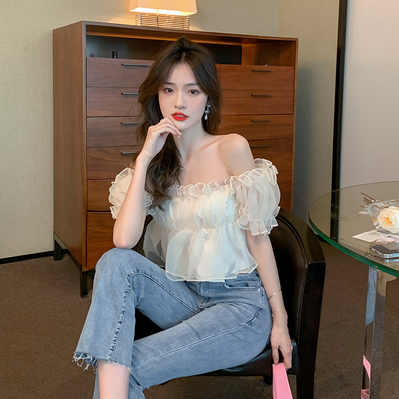 프렌치 스위트 원 숄더 쉬폰 셔츠 2025 여름 시크하고 고급스러운 퍼프 슬리브 슬리밍 쇼트 탑스토어 가기