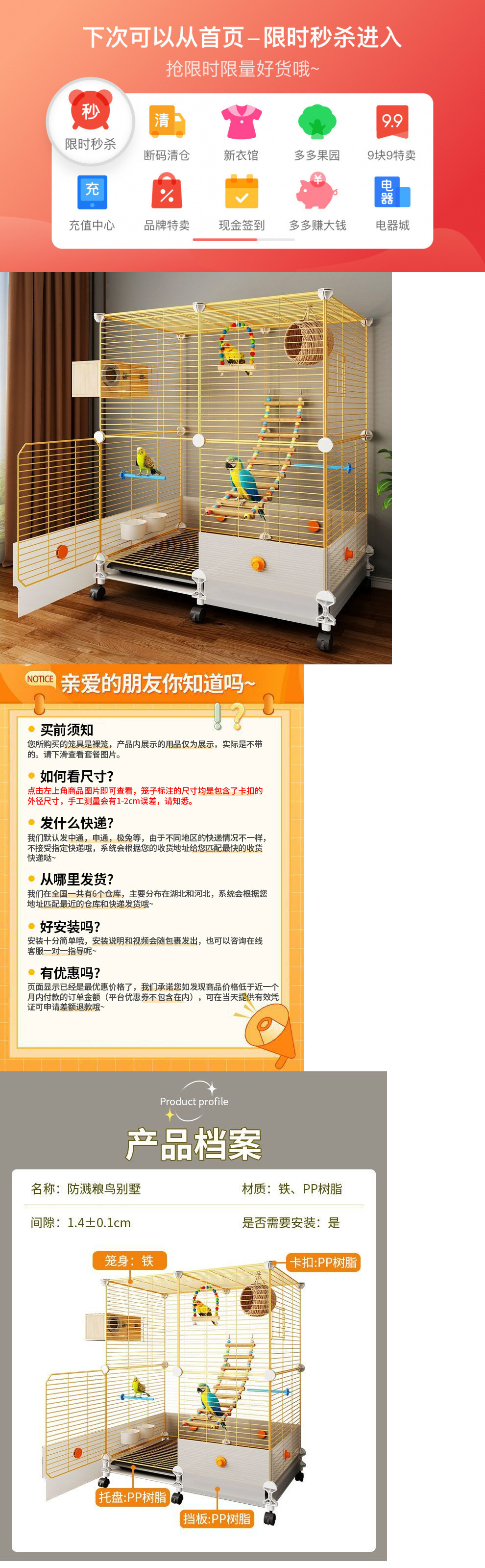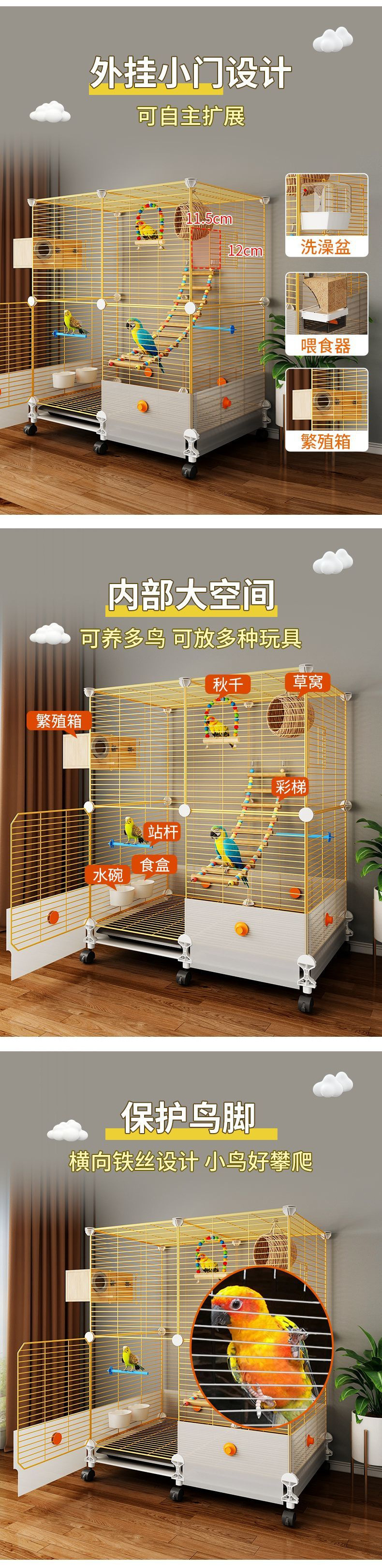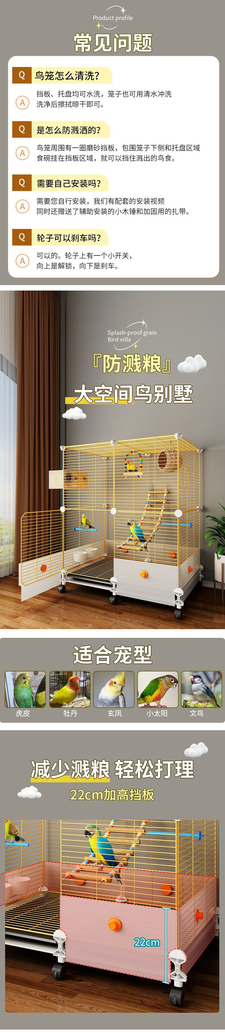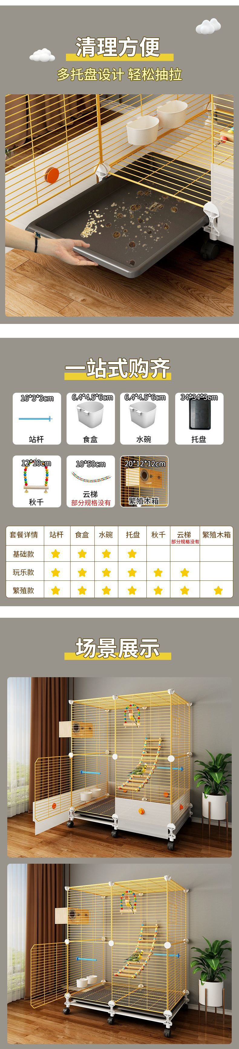 • 기본 모델: 스탠딩 폴 + 먹이 상자 + 물그릇 + 새 배설물 트레이