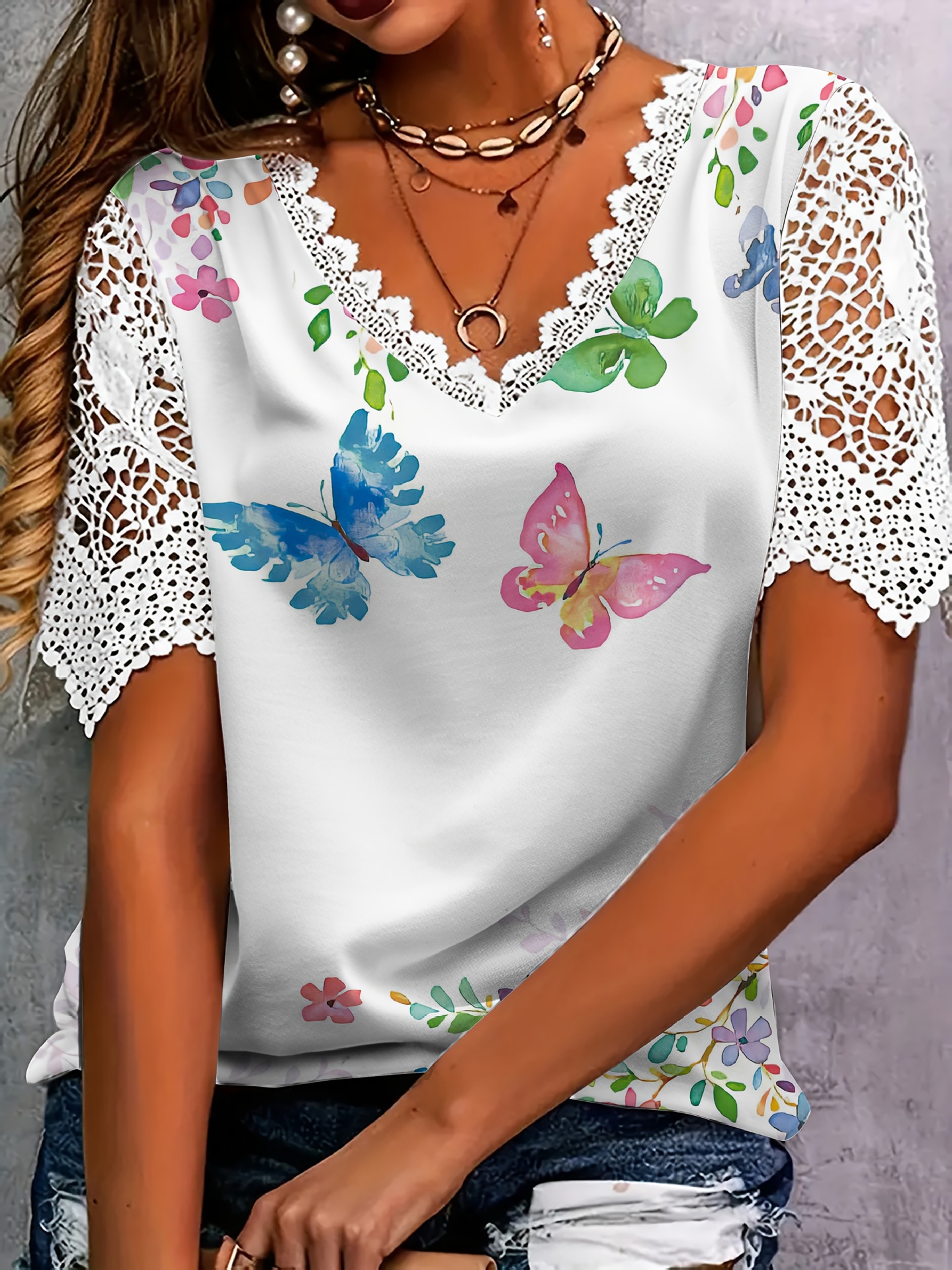 2025 크로스 보더 우아한 레이스 스티치 패션 숙녀 컬러 꽃 나비 꽃 프린트 반팔 티셔츠