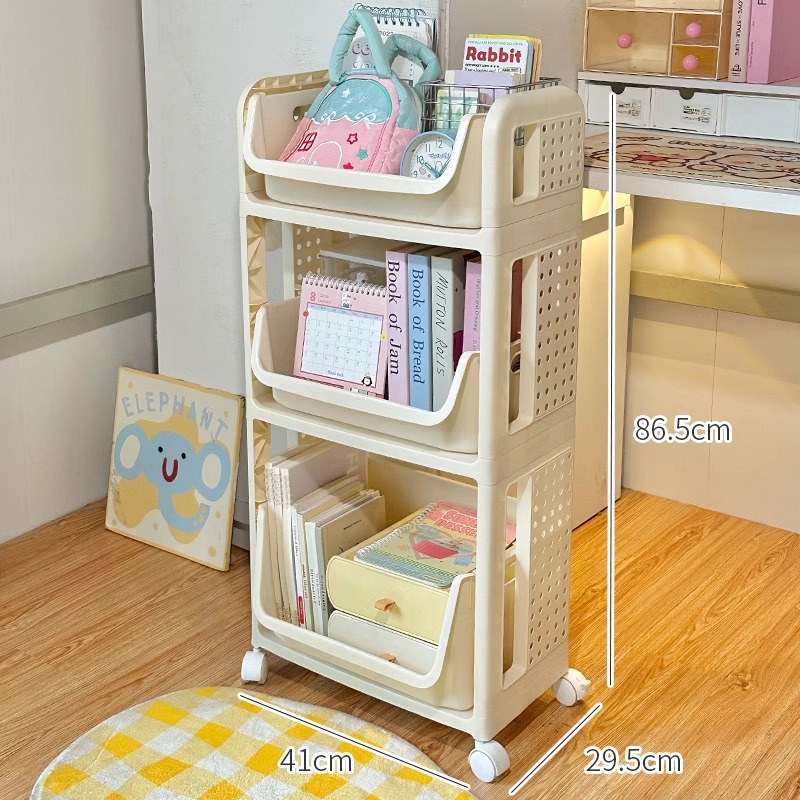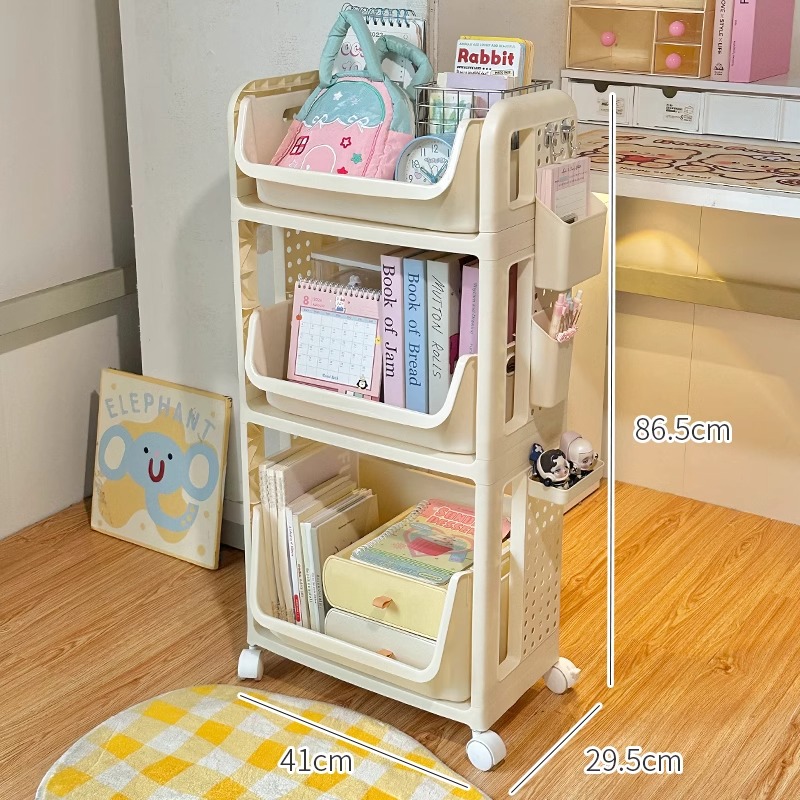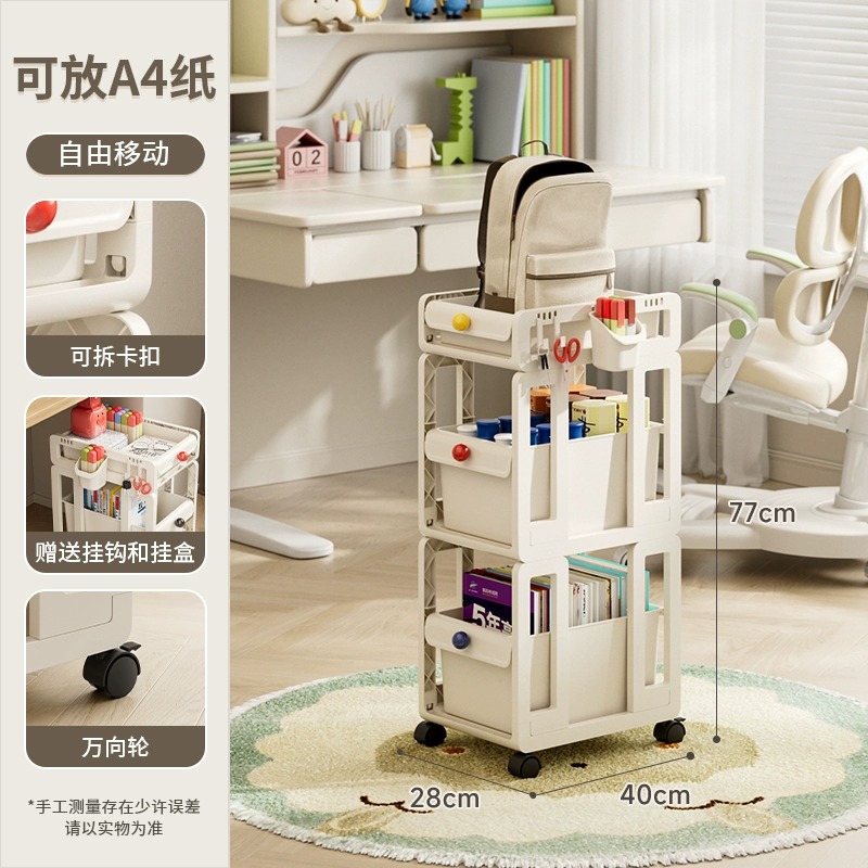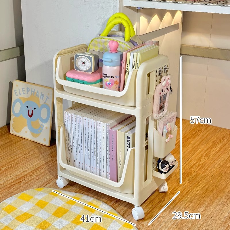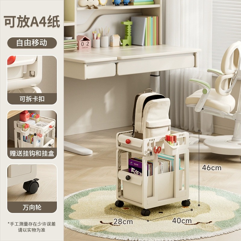 책장, 책상, 카트, 소형 수납선반, 학생교실, 테이블 아래 이동식, 바닥에 책가방, 책수납, 수납정리
