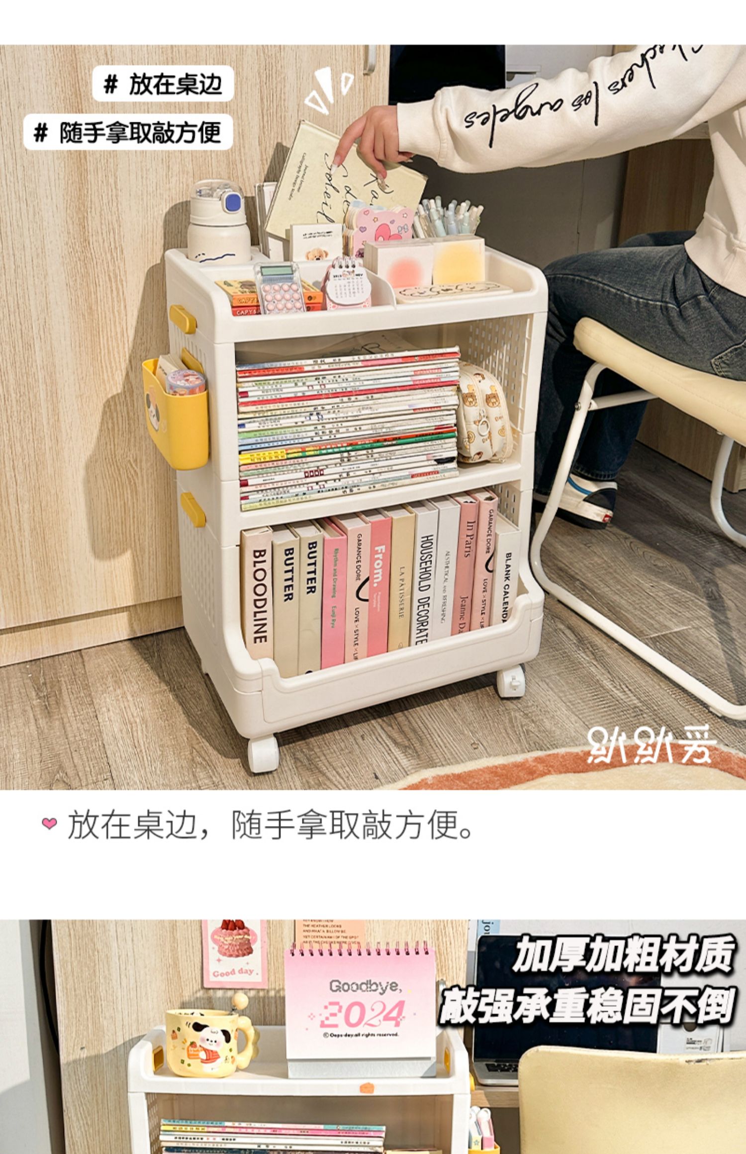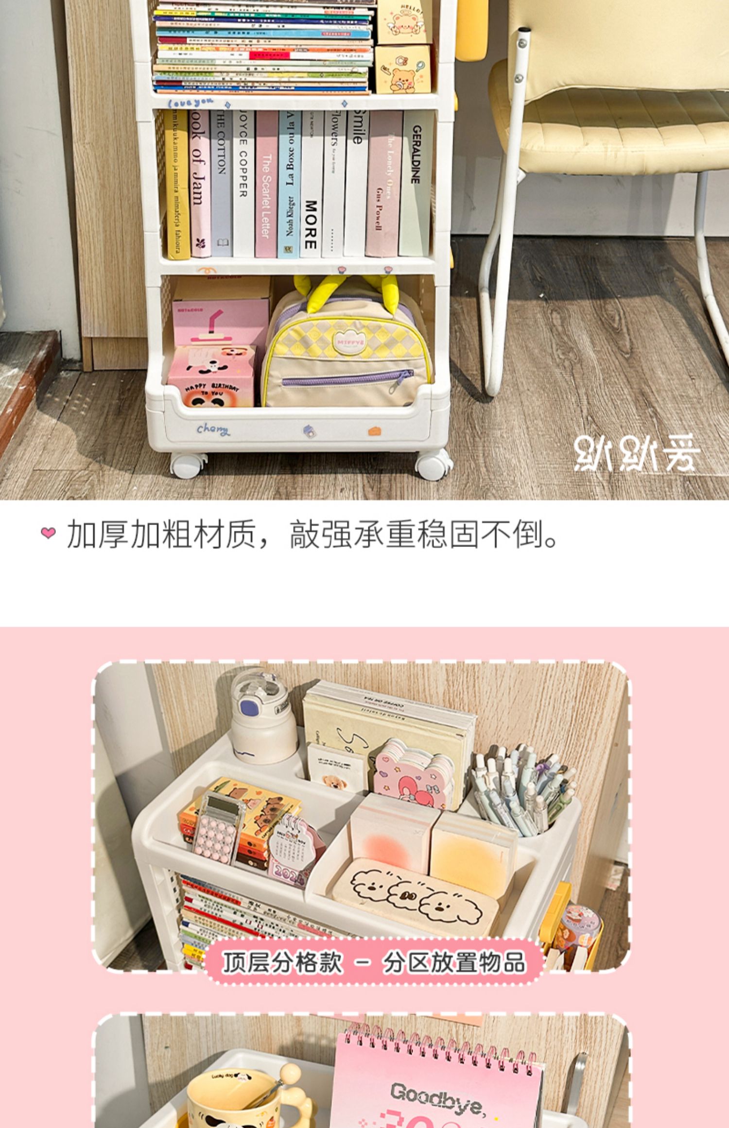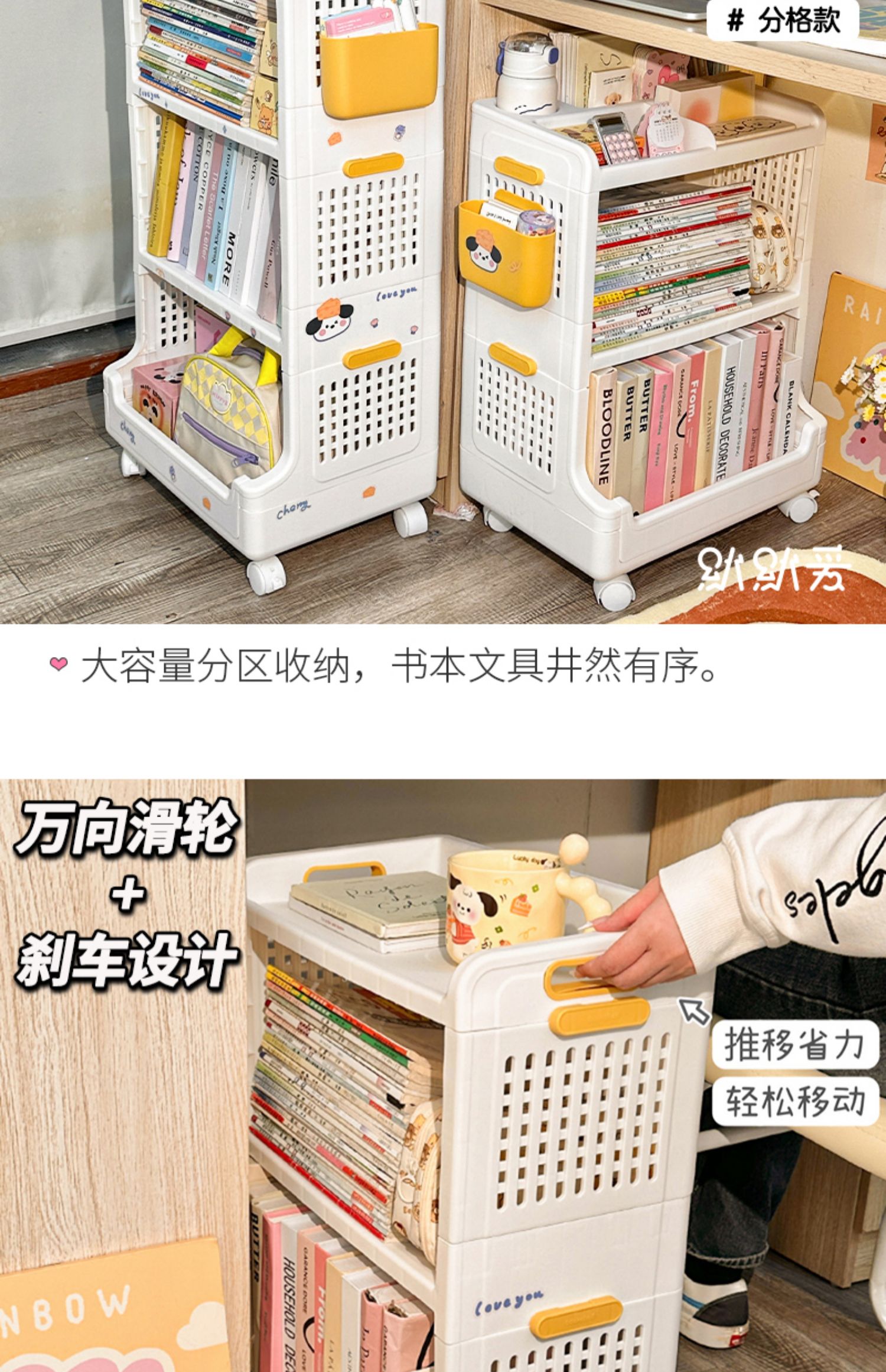 책장, 책상, 카트, 소형 수납선반, 학생교실, 테이블 아래 이동식, 바닥에 책가방, 책수납, 수납정리