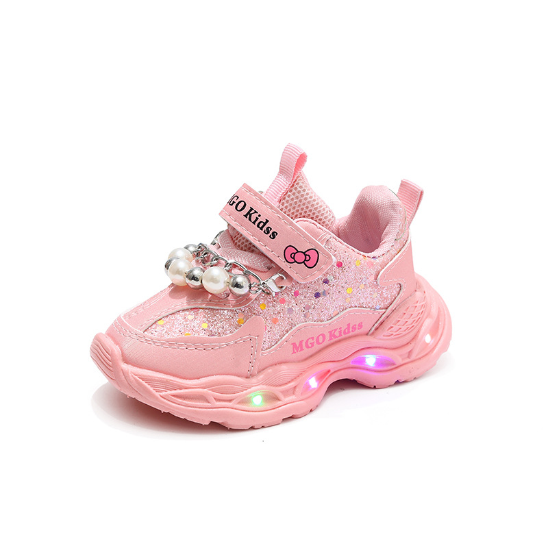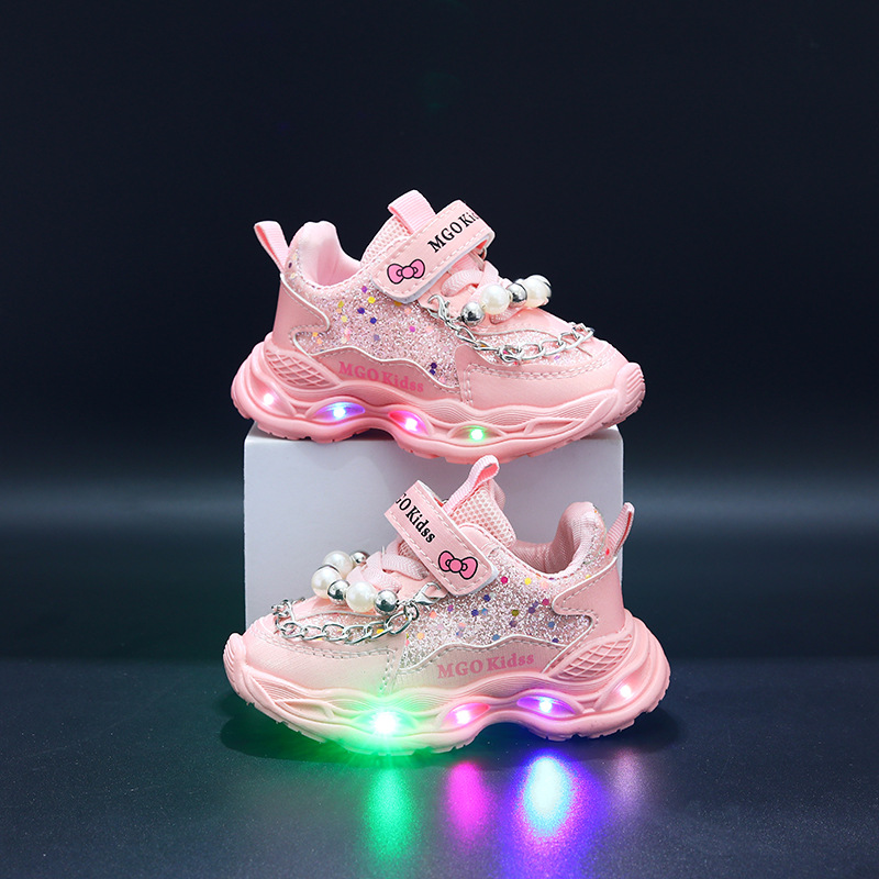 빛나는 2025 새로운 빛나는 공주 신발 캐주얼 야외 소녀 스포츠 신발 진주 체인스토어 가기