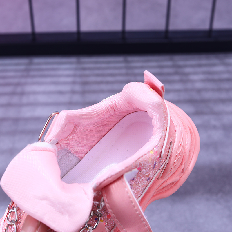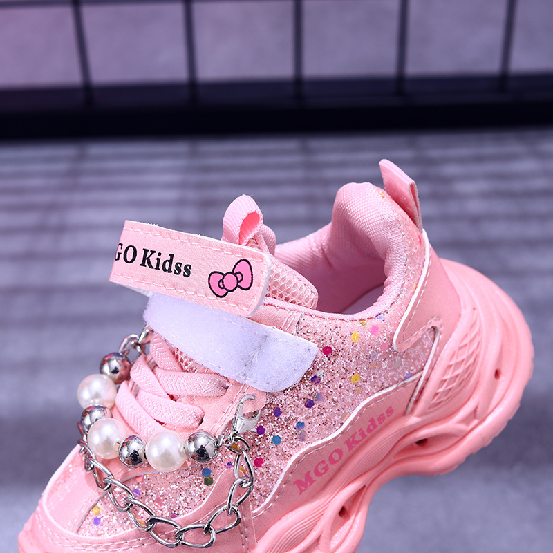 빛나는 2025 새로운 빛나는 공주 신발 캐주얼 야외 소녀 스포츠 신발 진주 체인