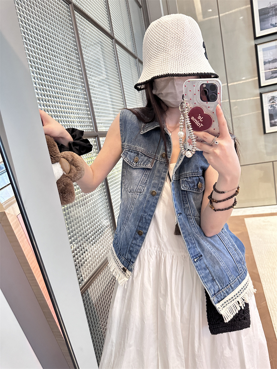 "소울 아이템" 디자이너 레트로 데님 스플라이스 태슬 엣지 그라데이션 데님 조끼 여성용스토어 가기