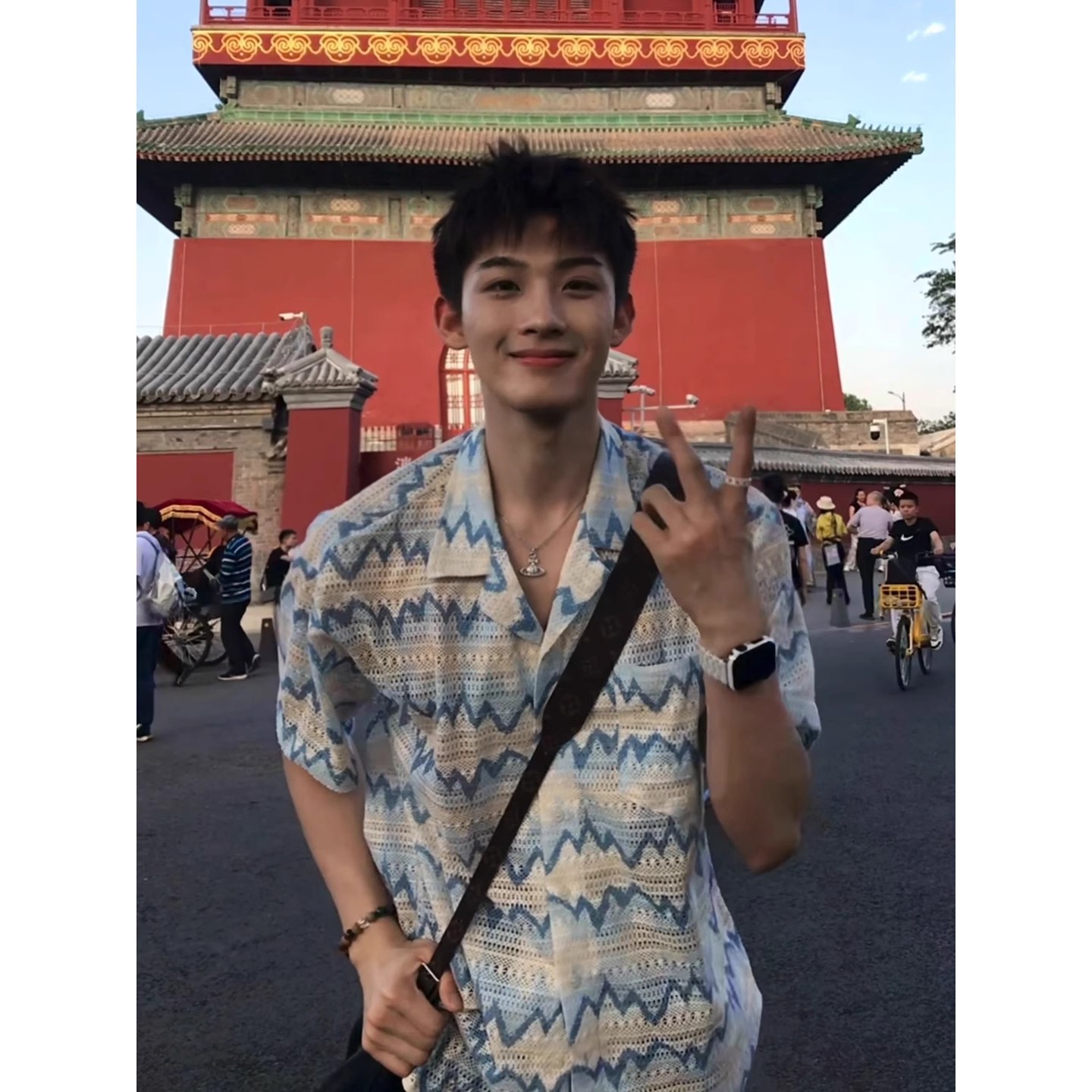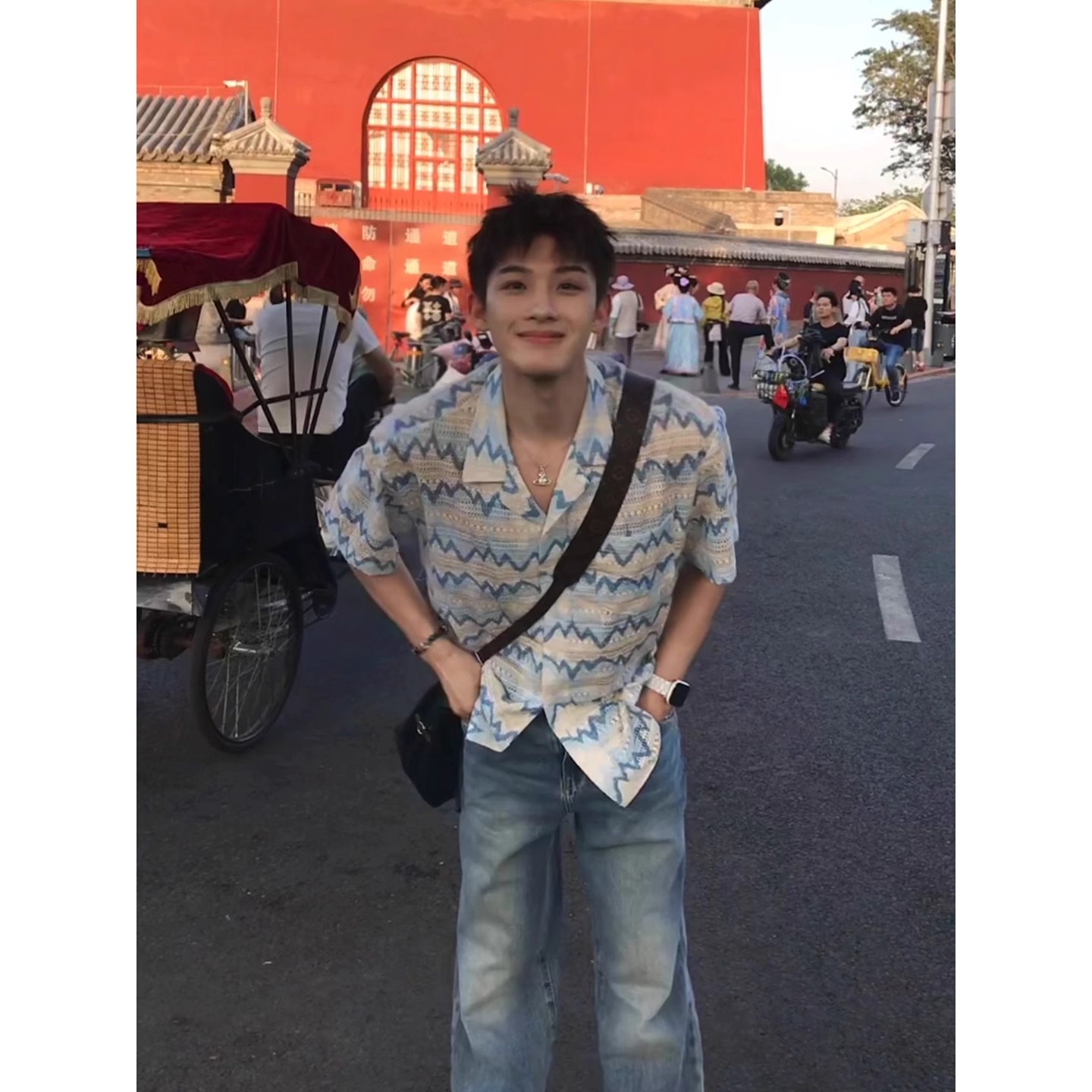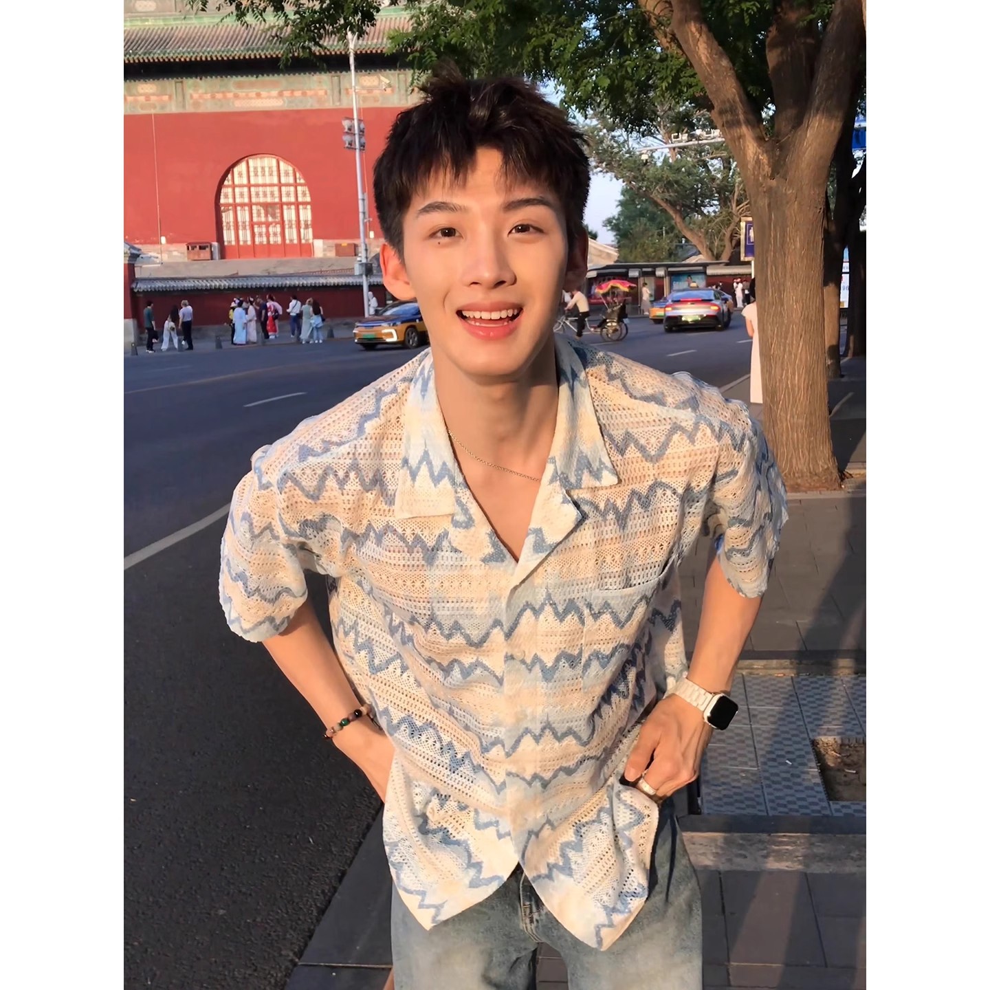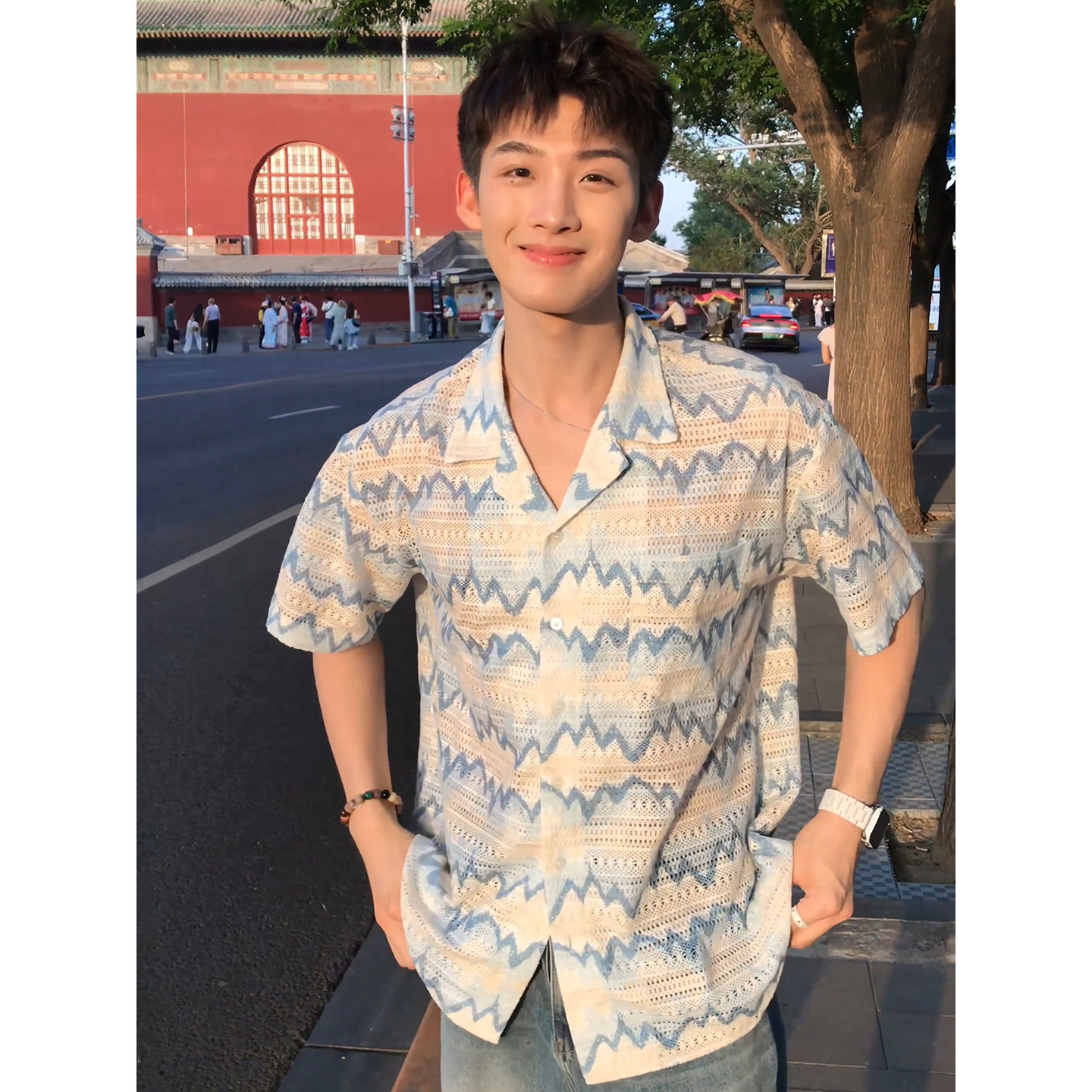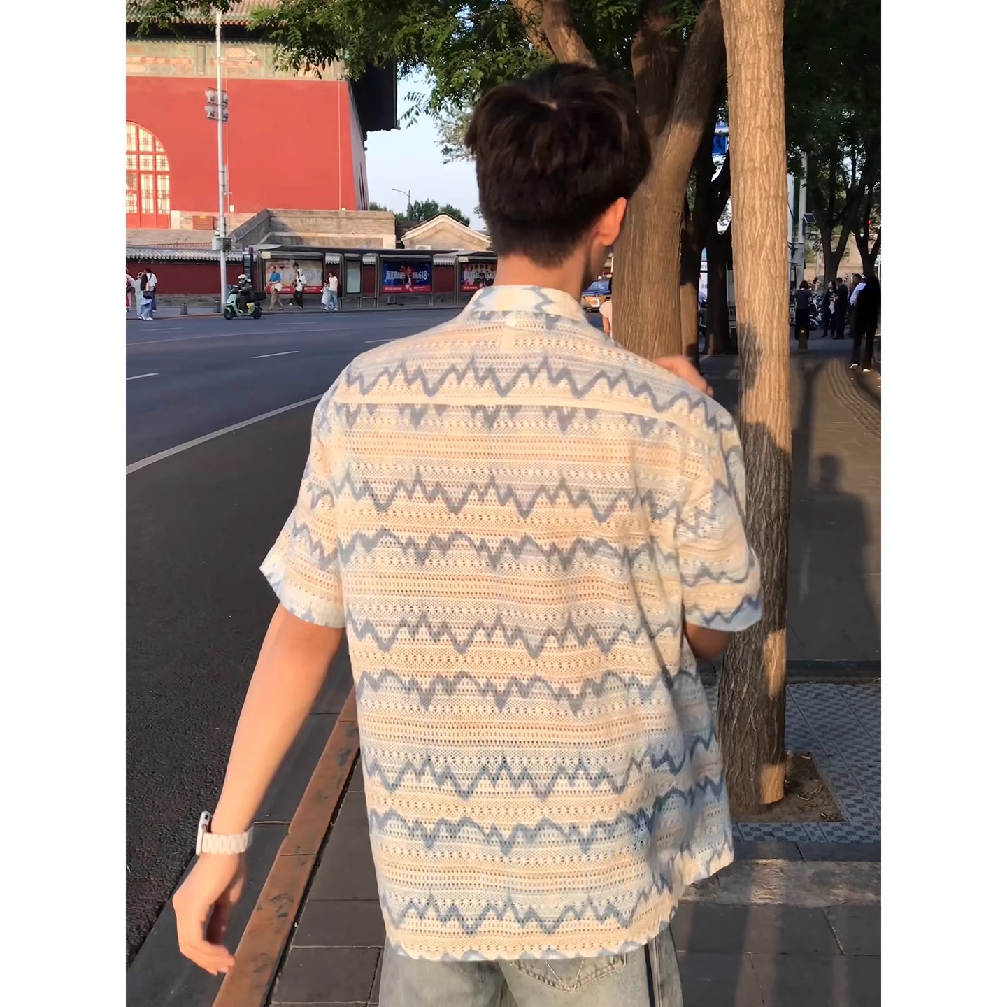 휴가 스타일 쿠바 칼라 중공 니트 반팔 셔츠 남성 여름 해변 착용 컬러 스트라이프 셔츠스토어 가기