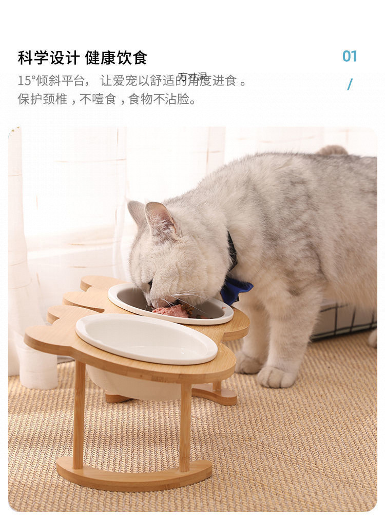 세라믹 고양이 그릇, 높은 발, 목 보호대, 이중 그릇 고정 랙, 뒤집힘 방지 애완 동물 고양이 및 개 먹이 그릇, 물 그릇, 기울어진 고양이 용품