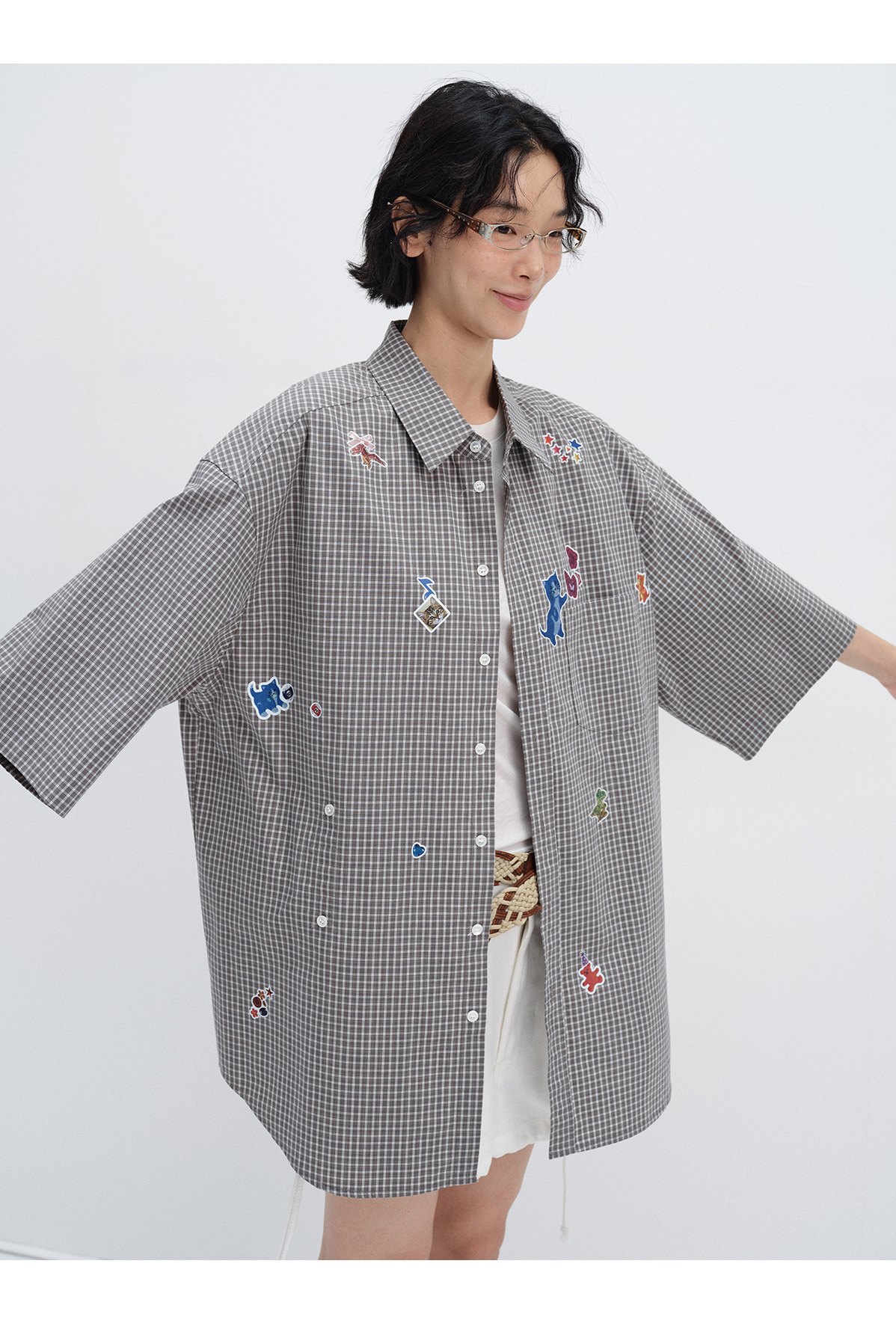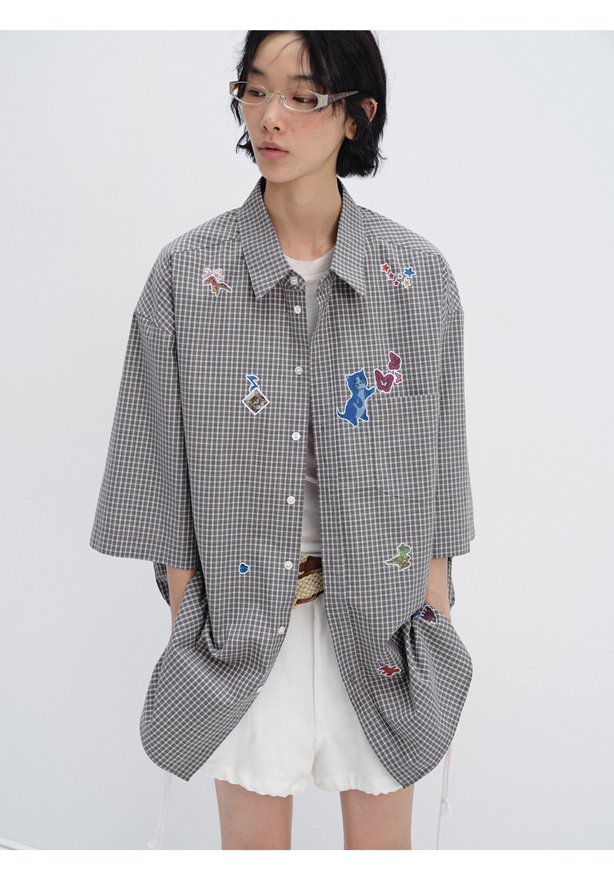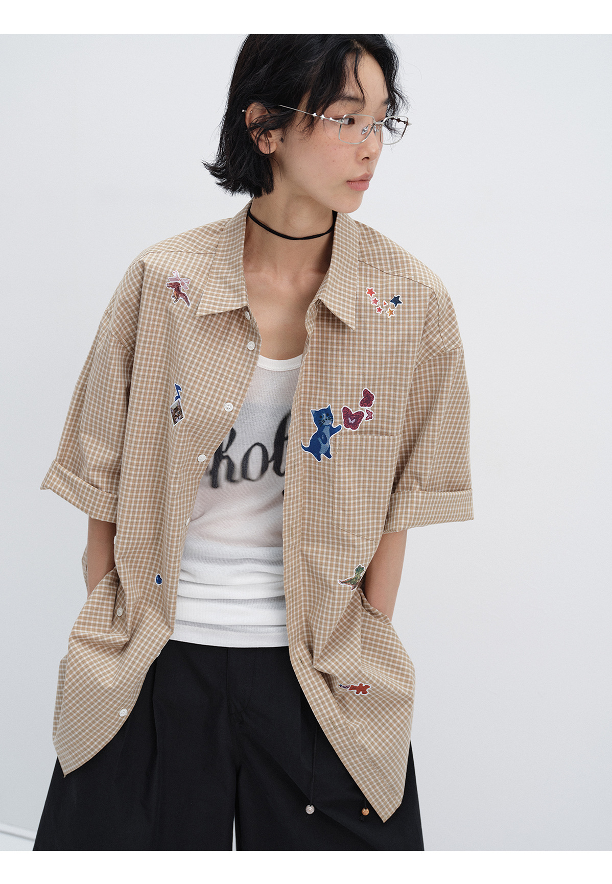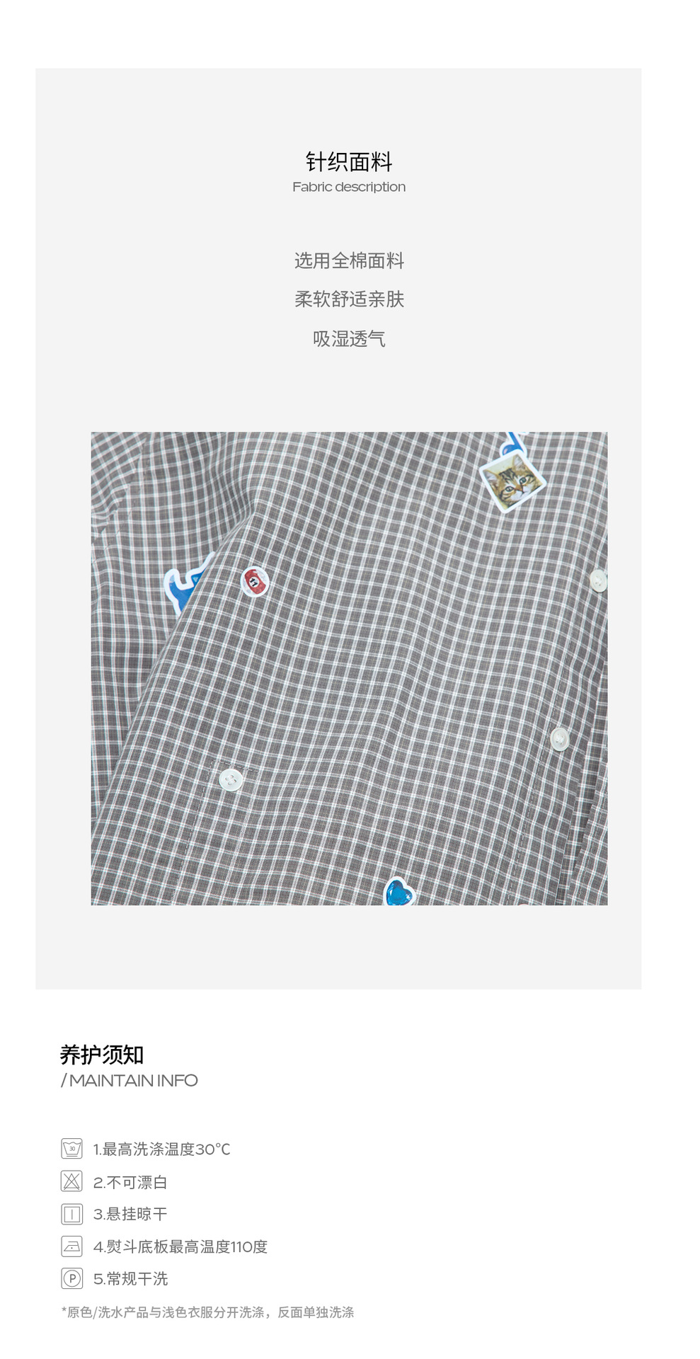 [시시] 신상품 순면 스티커 프린트 싱글 버튼 캐주얼 루즈핏 라펠 체크 셔츠 여성용 V8979