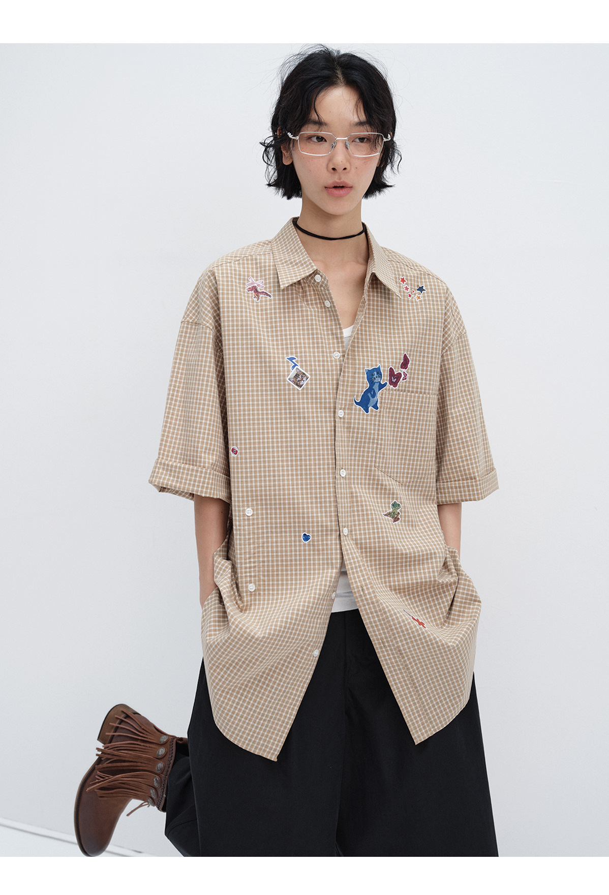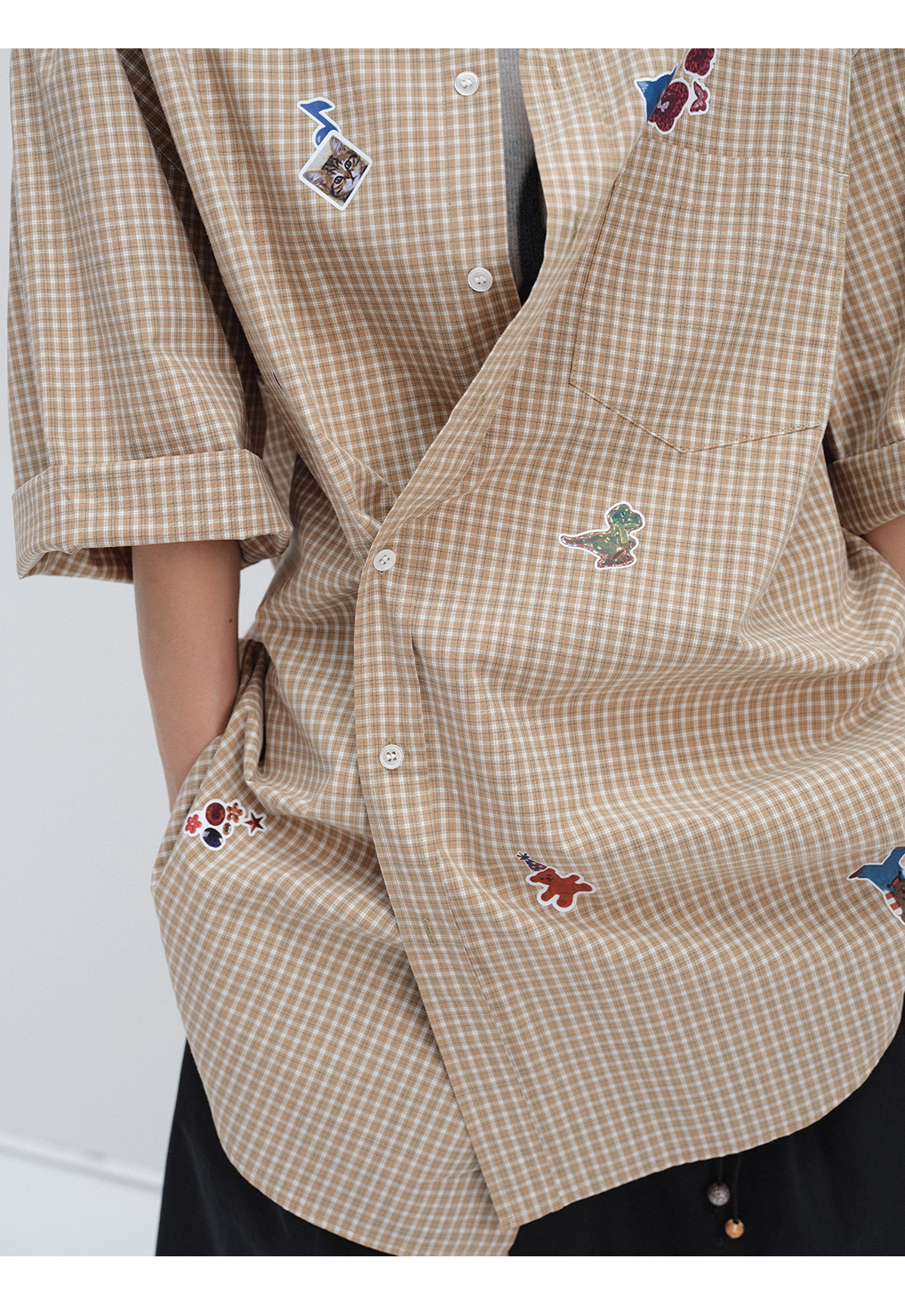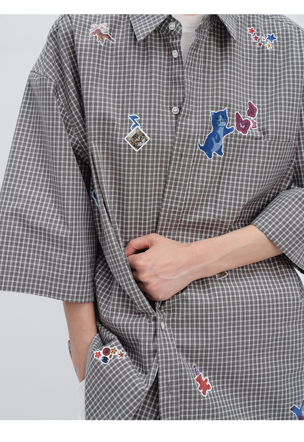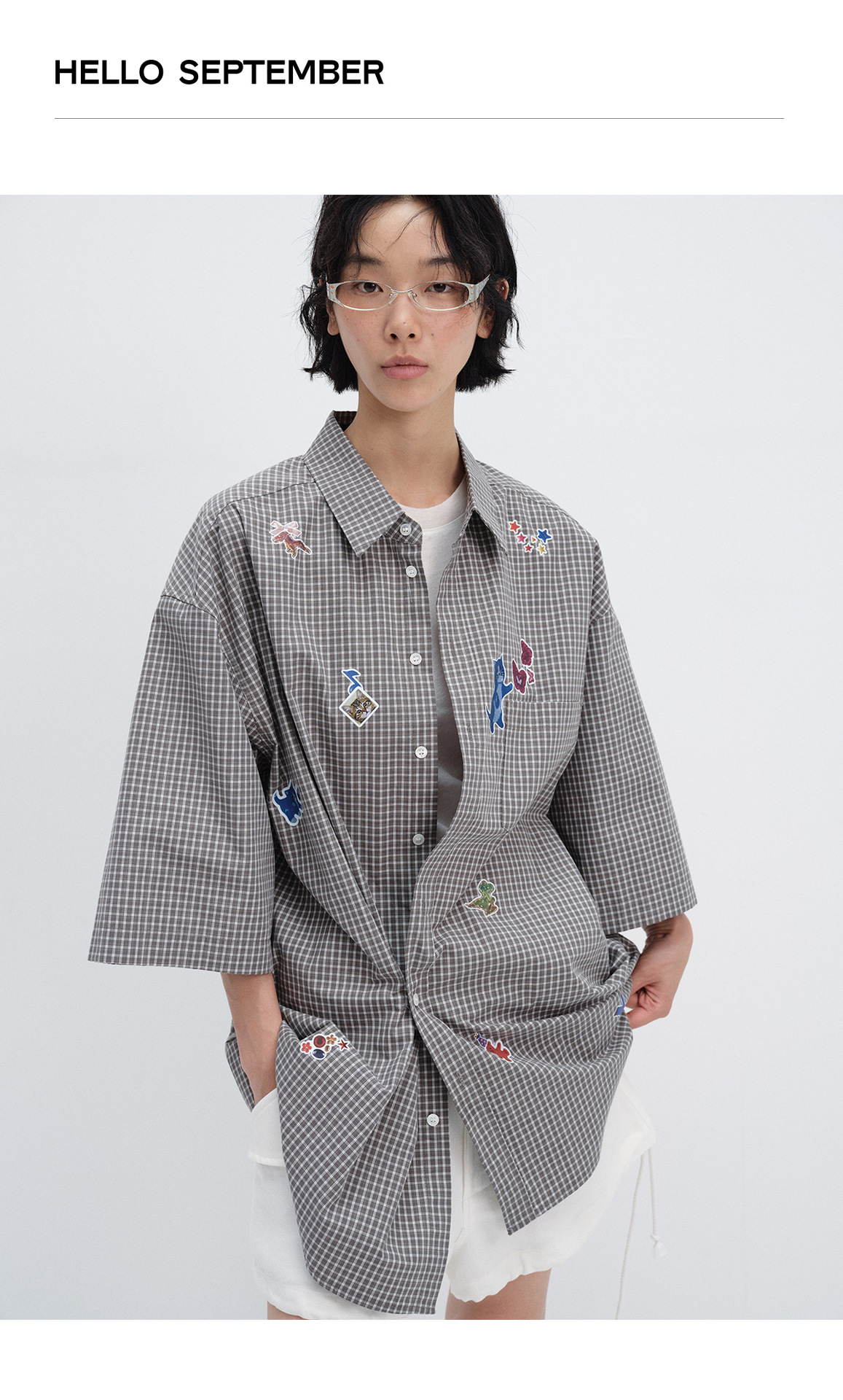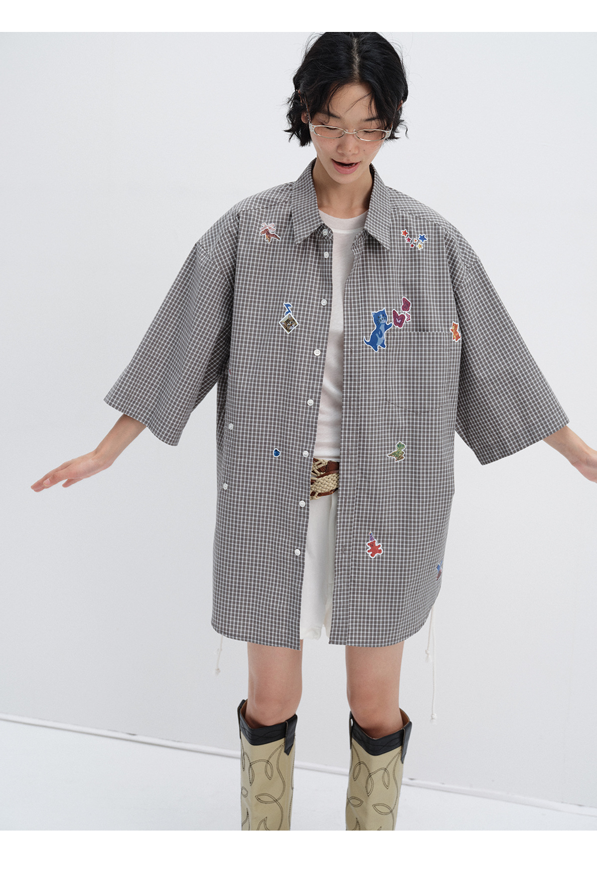 [시시] 신상품 순면 스티커 프린트 싱글 버튼 캐주얼 루즈핏 라펠 체크 셔츠 여성용 V8979
