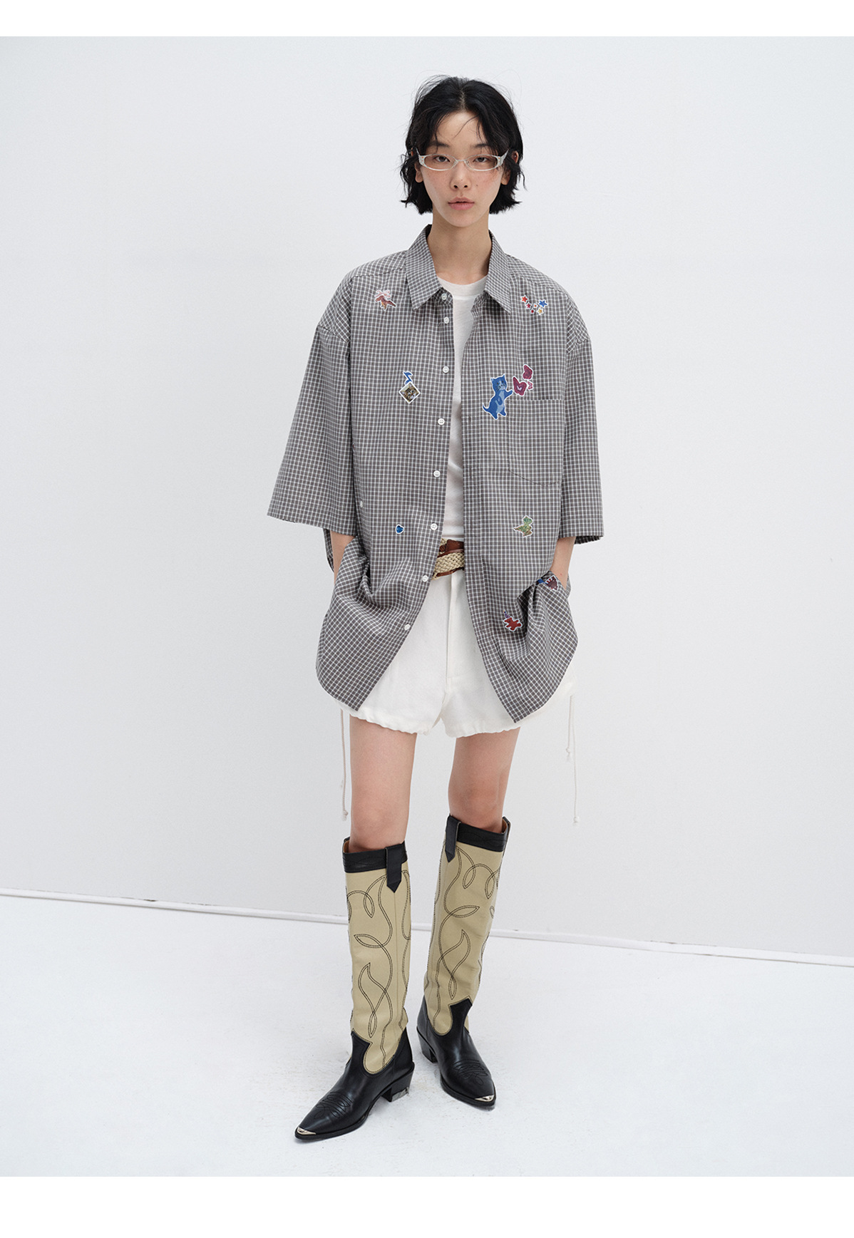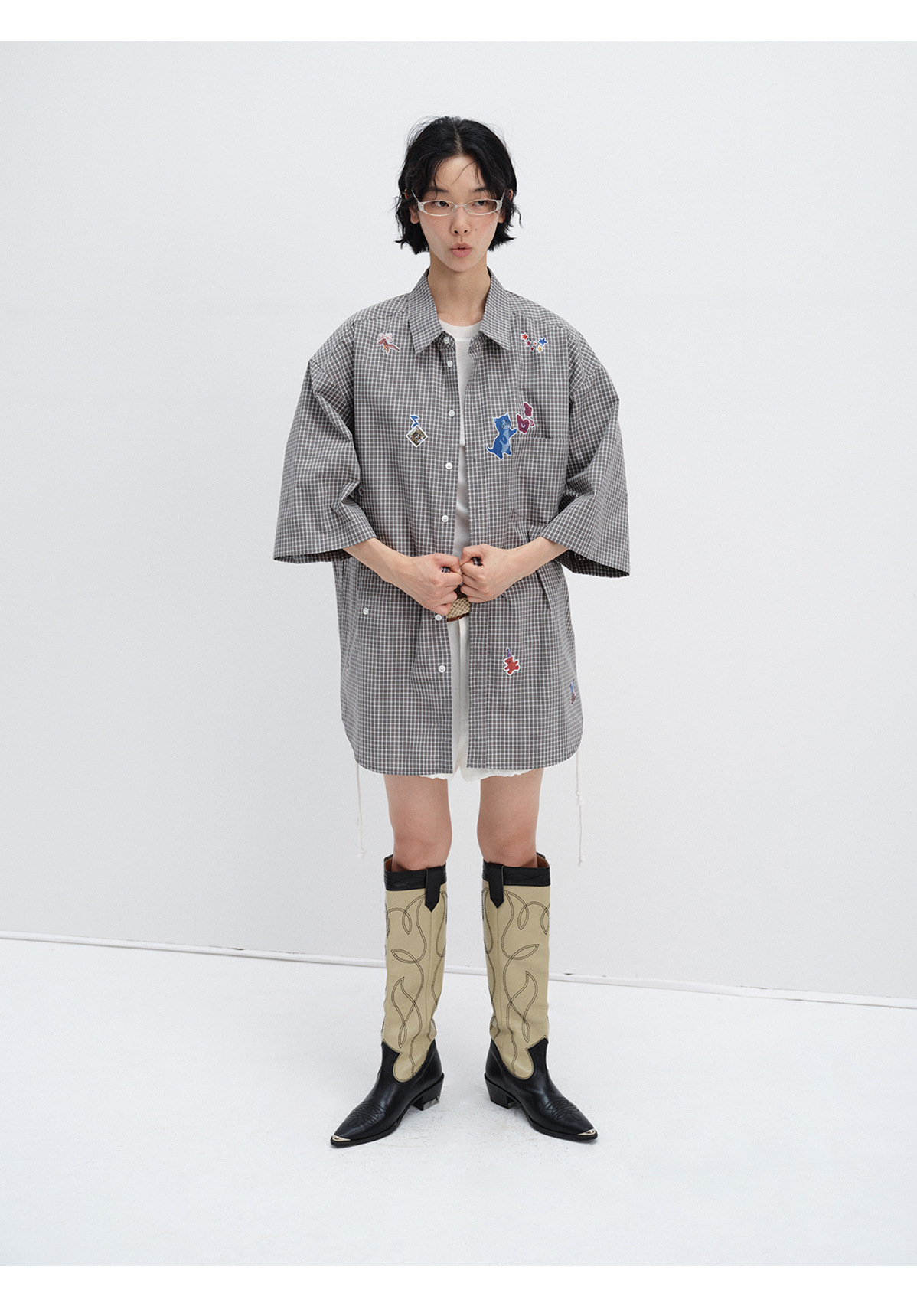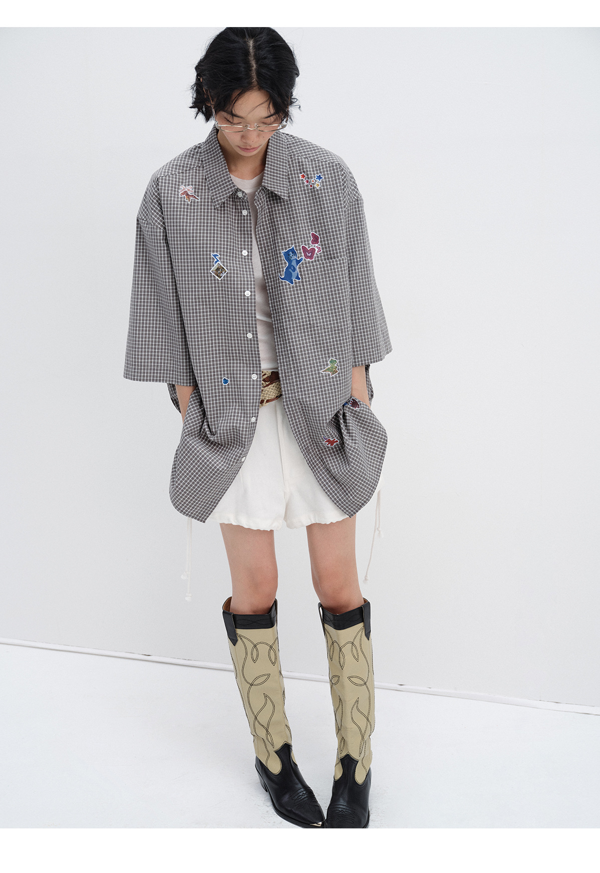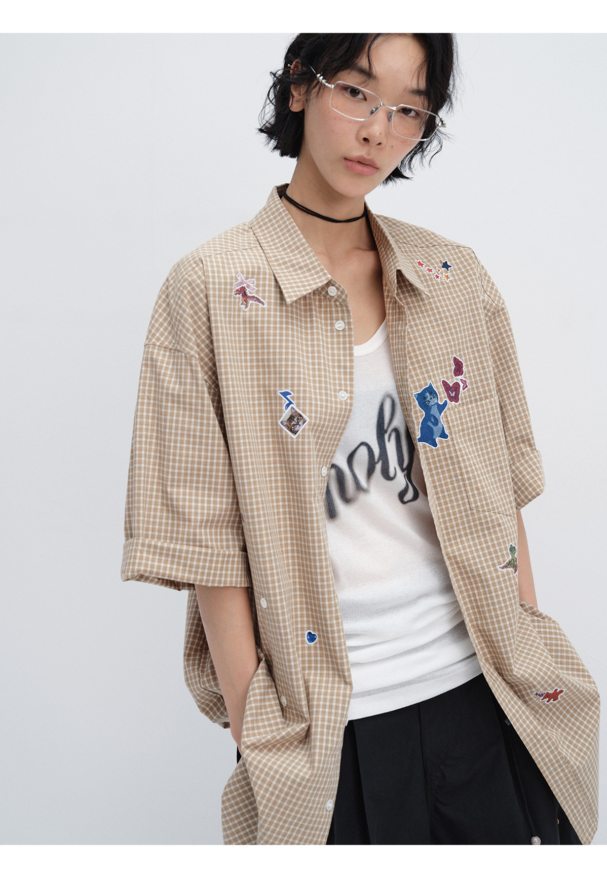 [시시] 신상품 순면 스티커 프린트 싱글 버튼 캐주얼 루즈핏 라펠 체크 셔츠 여성용 V8979