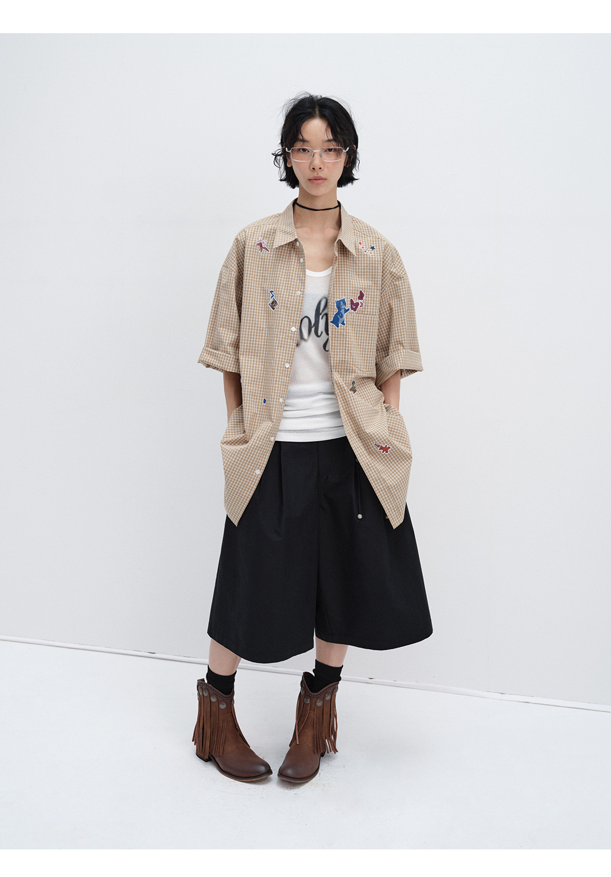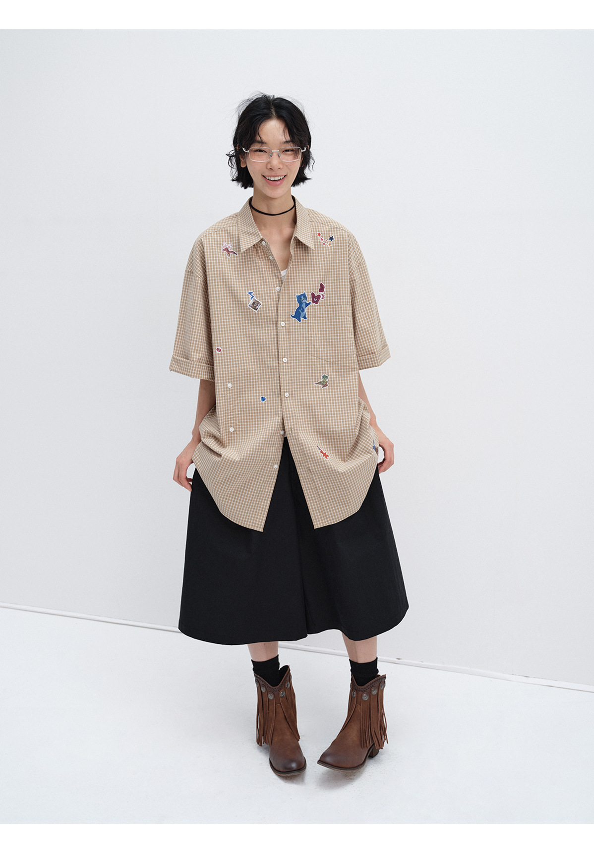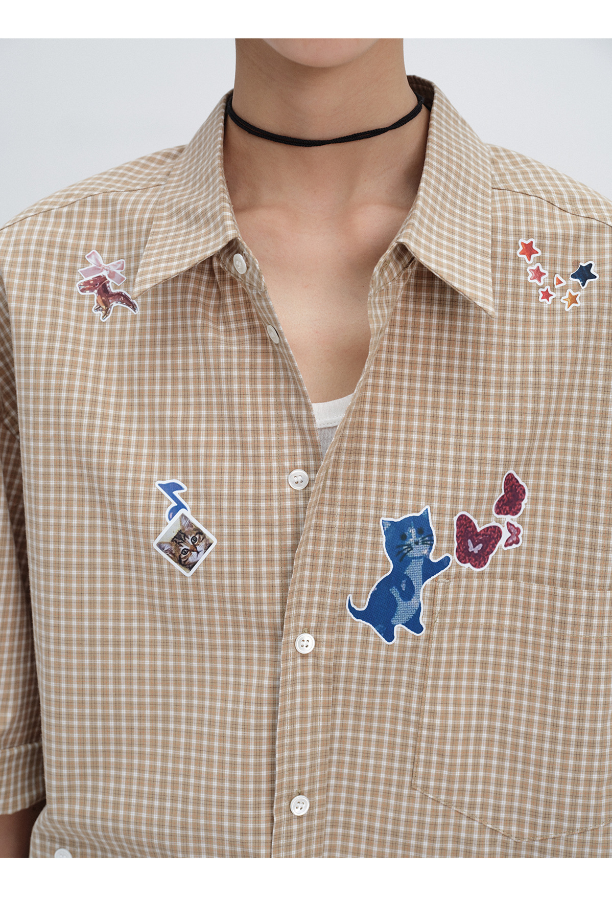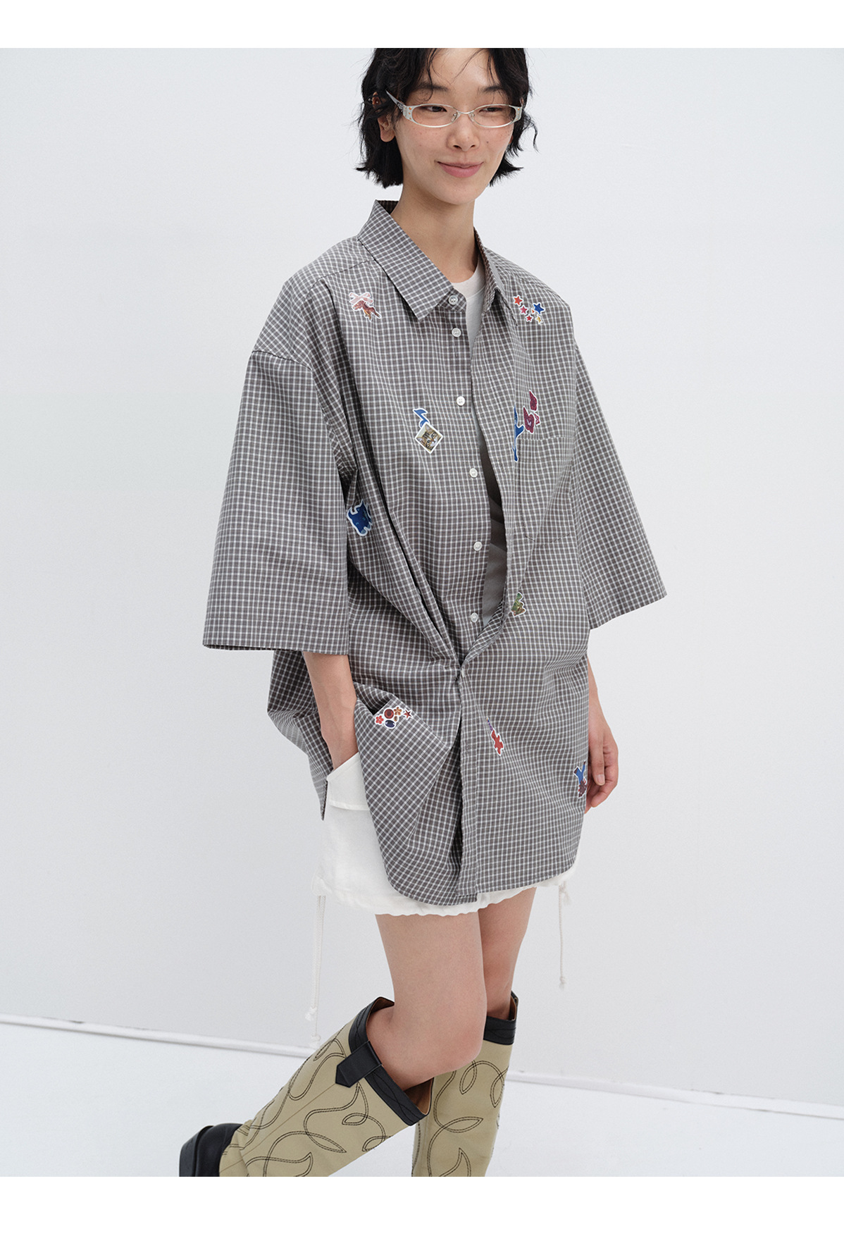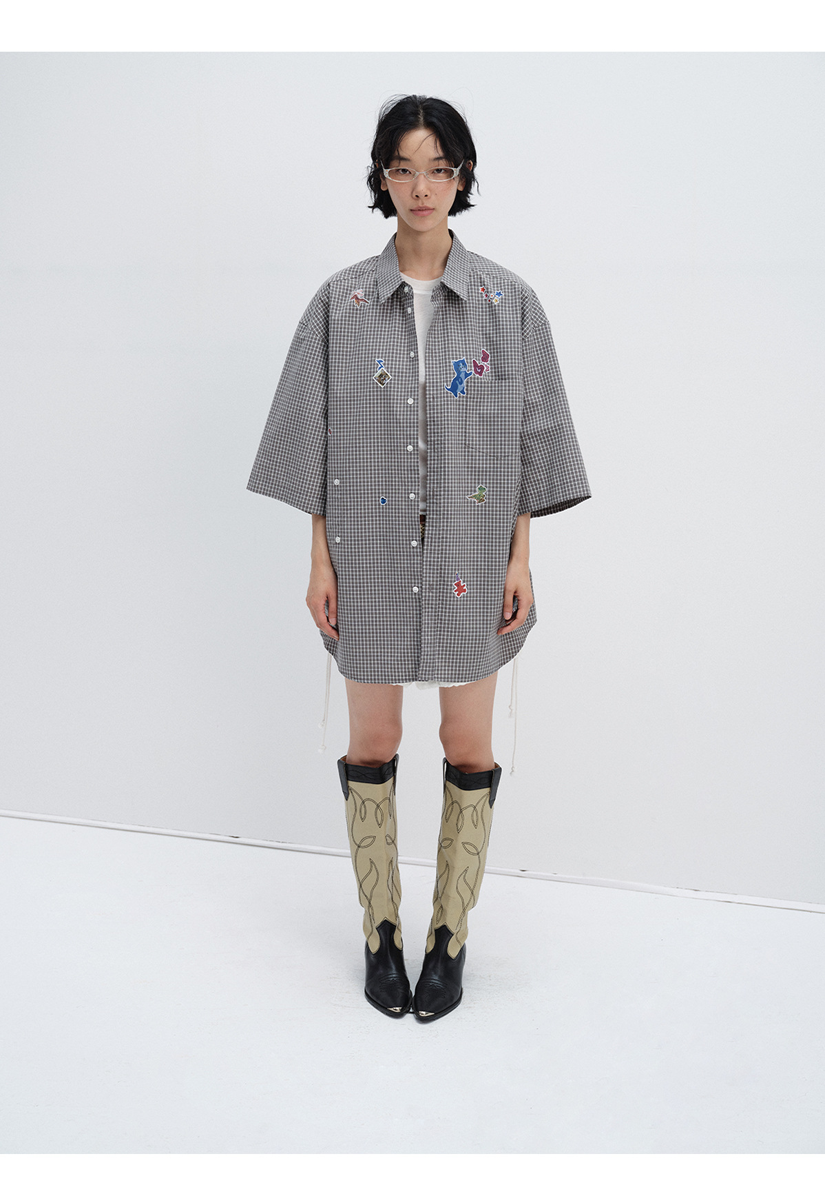 [시시] 신상품 순면 스티커 프린트 싱글 버튼 캐주얼 루즈핏 라펠 체크 셔츠 여성용 V8979