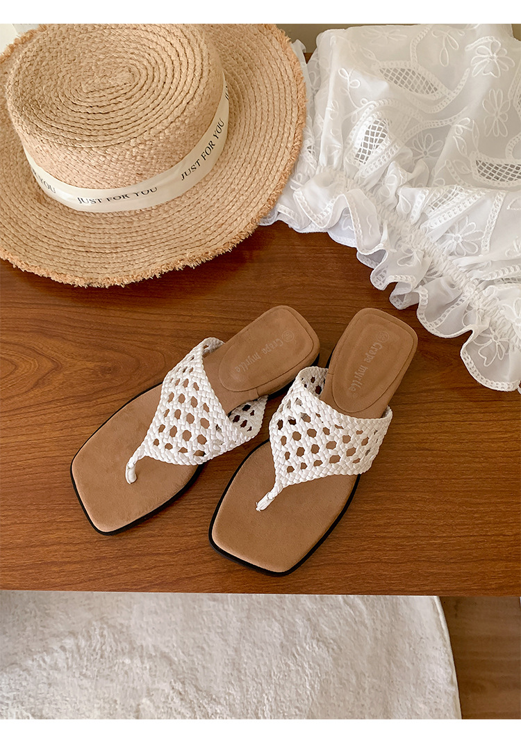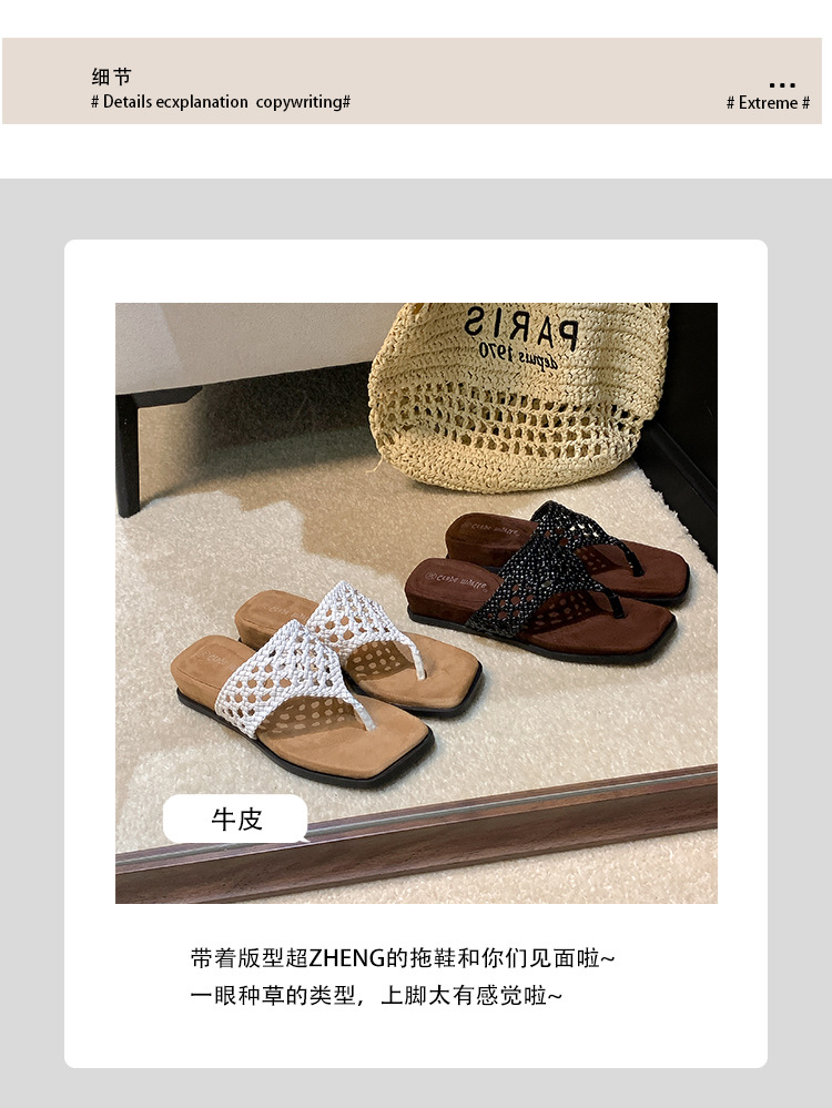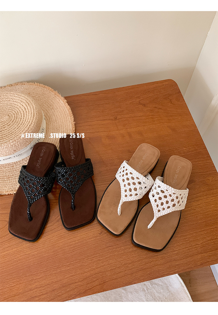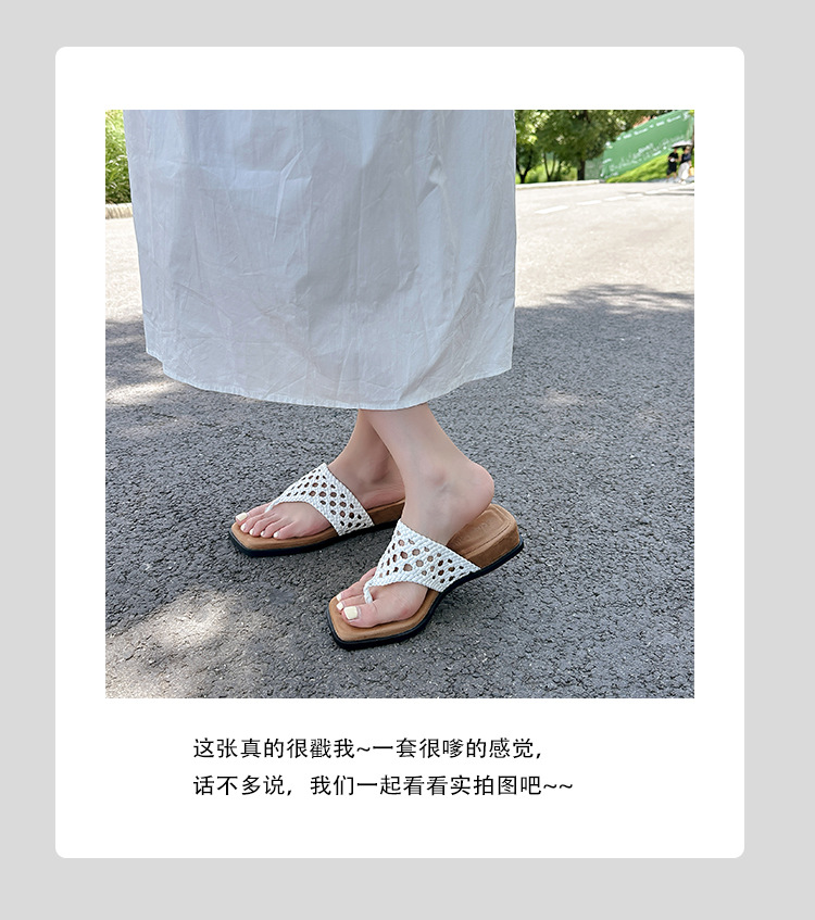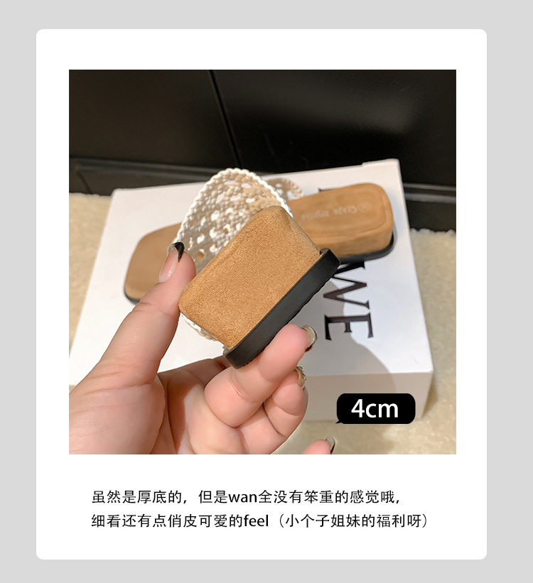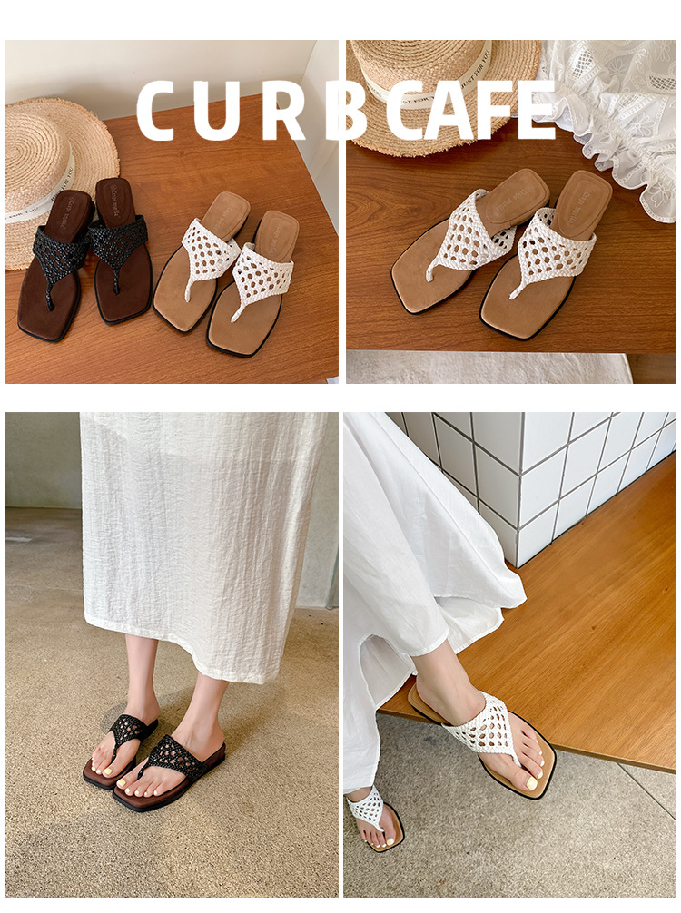 작은 사람~휴가 스타일 중공 뜨개질 플립플롭 여성용 스퀘어 토 샌들 여름 통기성 틈새 샌들