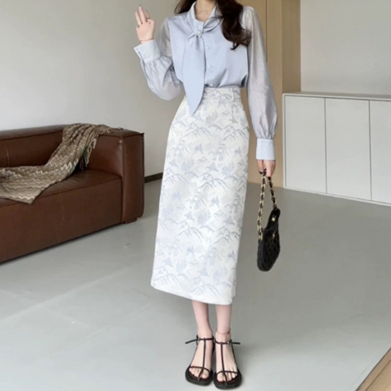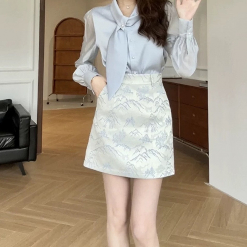 우아한 슈트 리본 프렌치 셔츠 여름 A라인 스커트 2025 신상 패션 투피스 세트 하이웨이스트 슬리밍스토어 가기