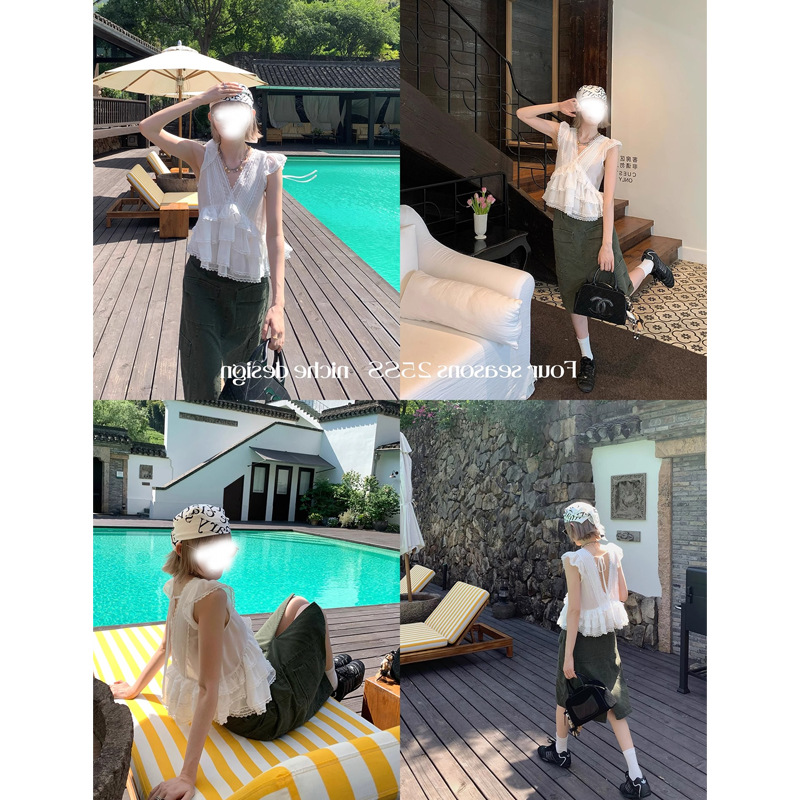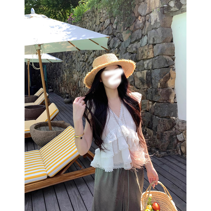 Ouyang V 넥 레이스 업 쉬폰 민소매 셔츠 여성 여름 디자인 틈새 프렌치 러플 탑스토어 가기