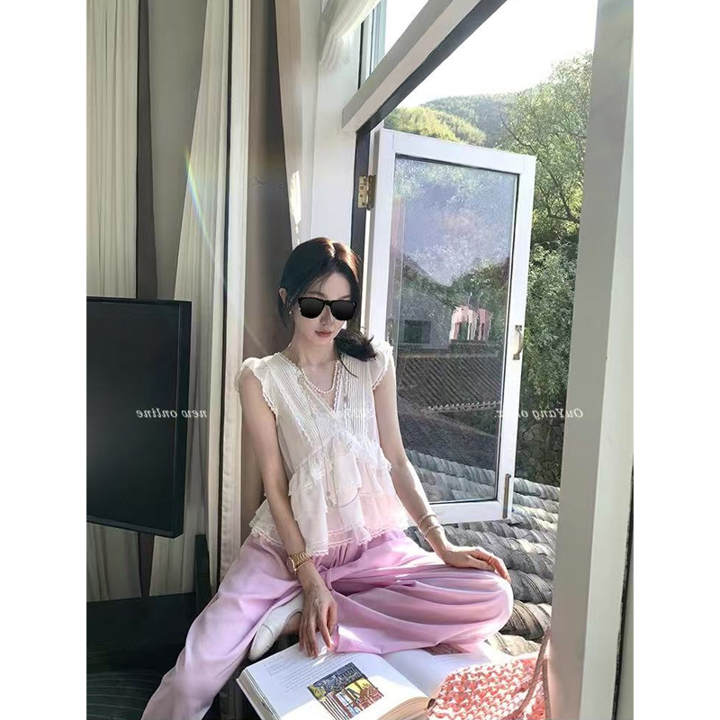 Ouyang V 넥 레이스 업 쉬폰 민소매 셔츠 여성 여름 디자인 틈새 프렌치 러플 탑