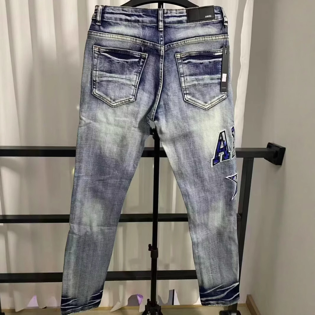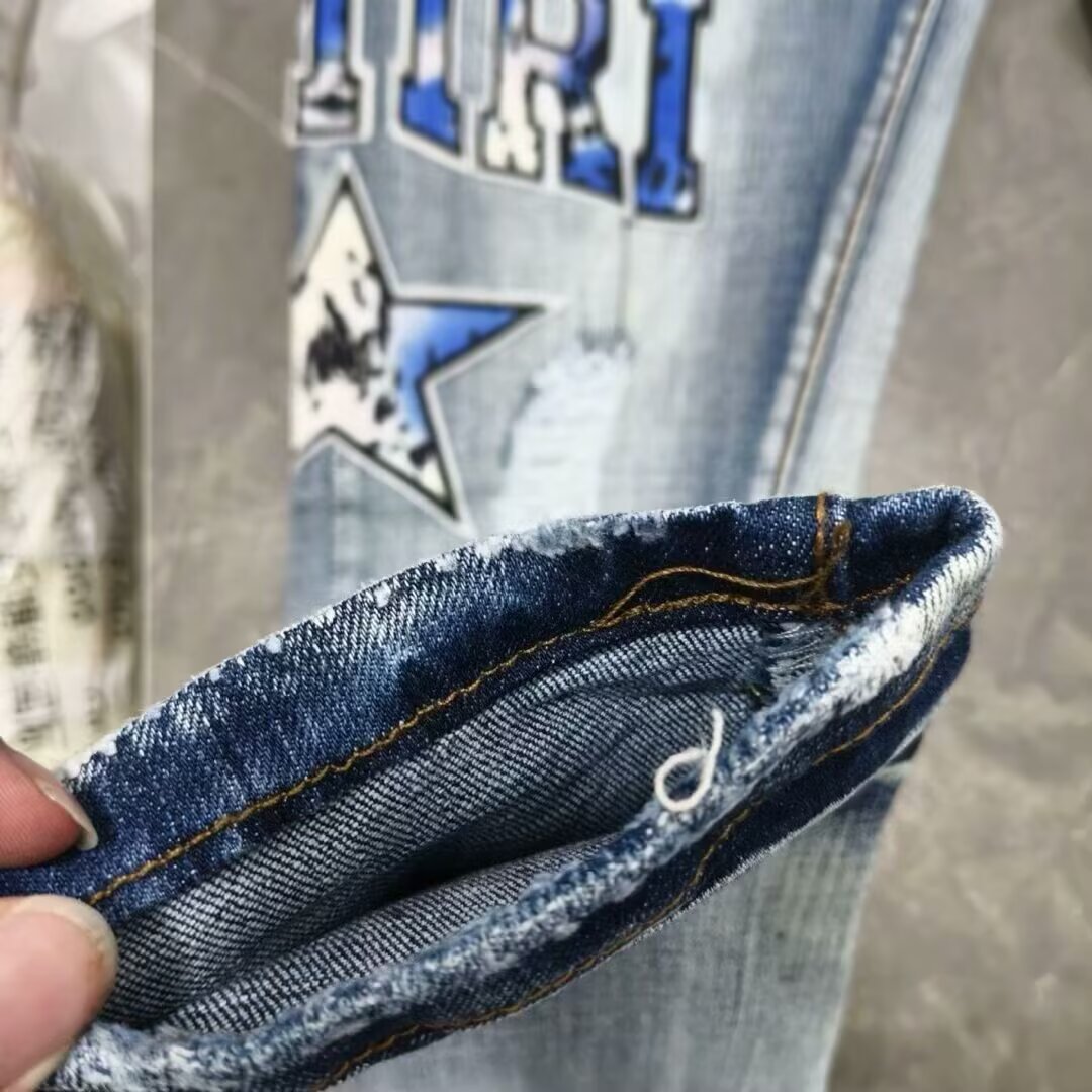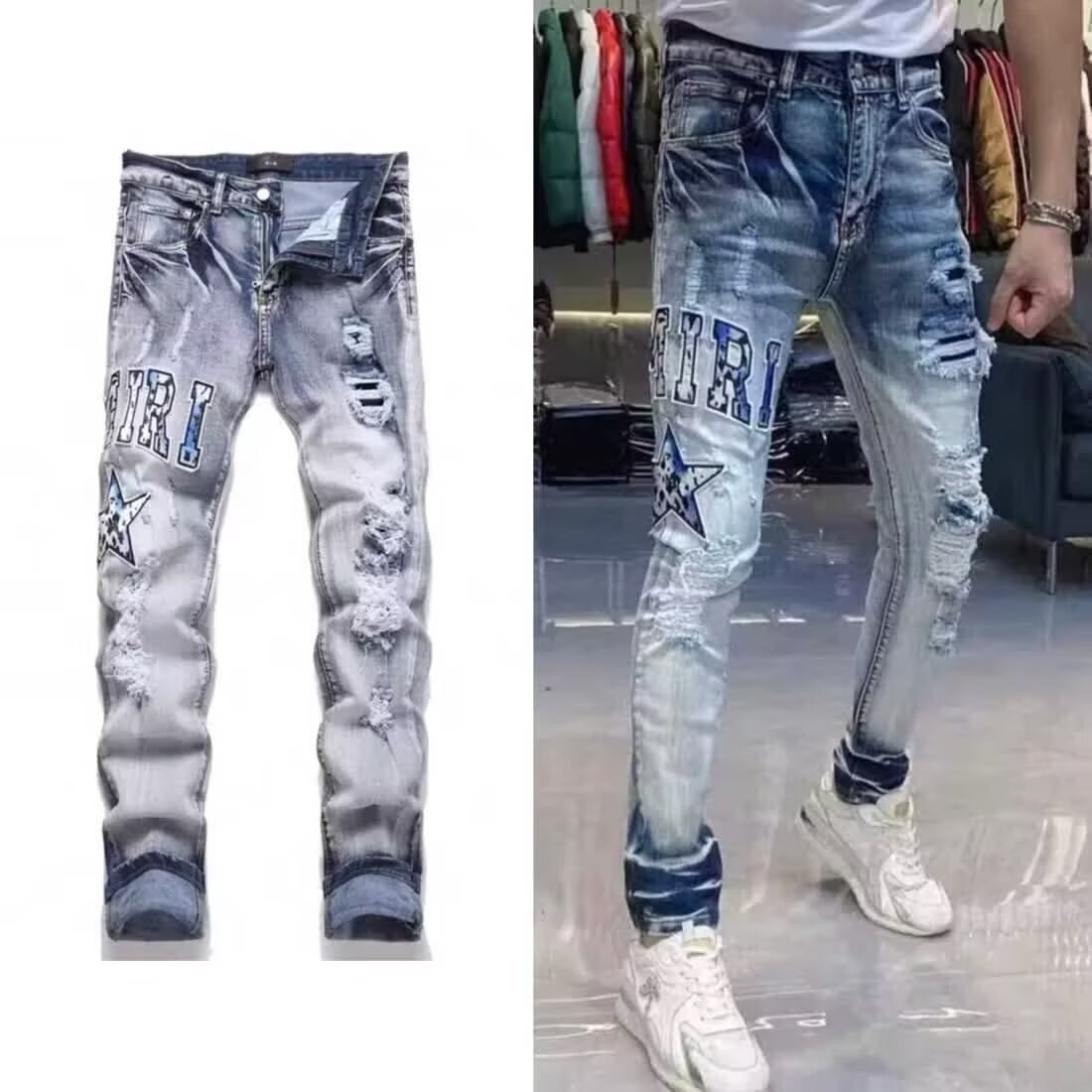 크로스보더 유럽 및 미국 하이스트리트 AMIRI 트렌디 브랜드 펑크 스타일 찢어진 패치 자수 슬림핏 신축성 있는 남성용 청바지스토어 가기