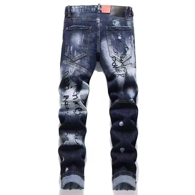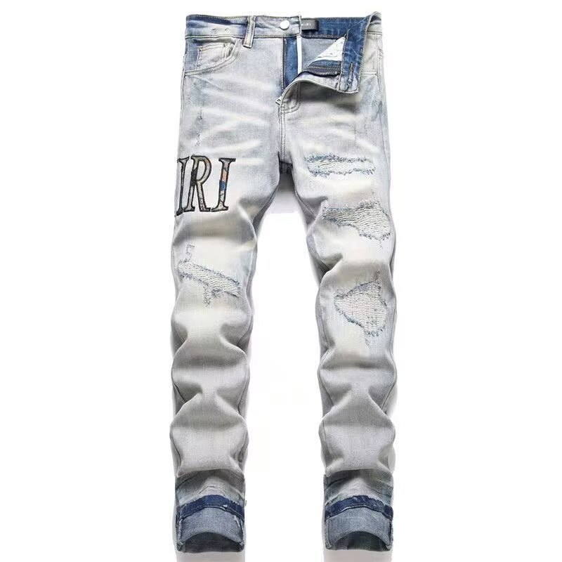 크로스보더 유럽 및 미국 하이스트리트 AMIRI 트렌디 브랜드 펑크 스타일 찢어진 패치 자수 슬림핏 신축성 있는 남성용 청바지