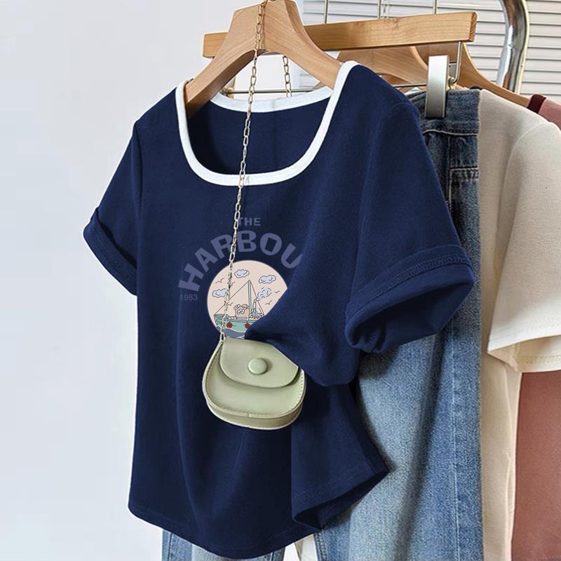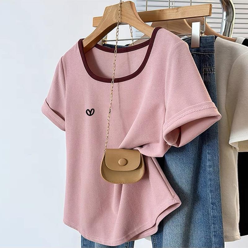 여름 2025년 새로운 스타일의 독특하고 시크한 디자인의 니치 반팔 오른쪽 어깨 티셔츠로 슬림해 보이는 여성용 대비 컬러 스퀘어 넥 탑스토어 가기