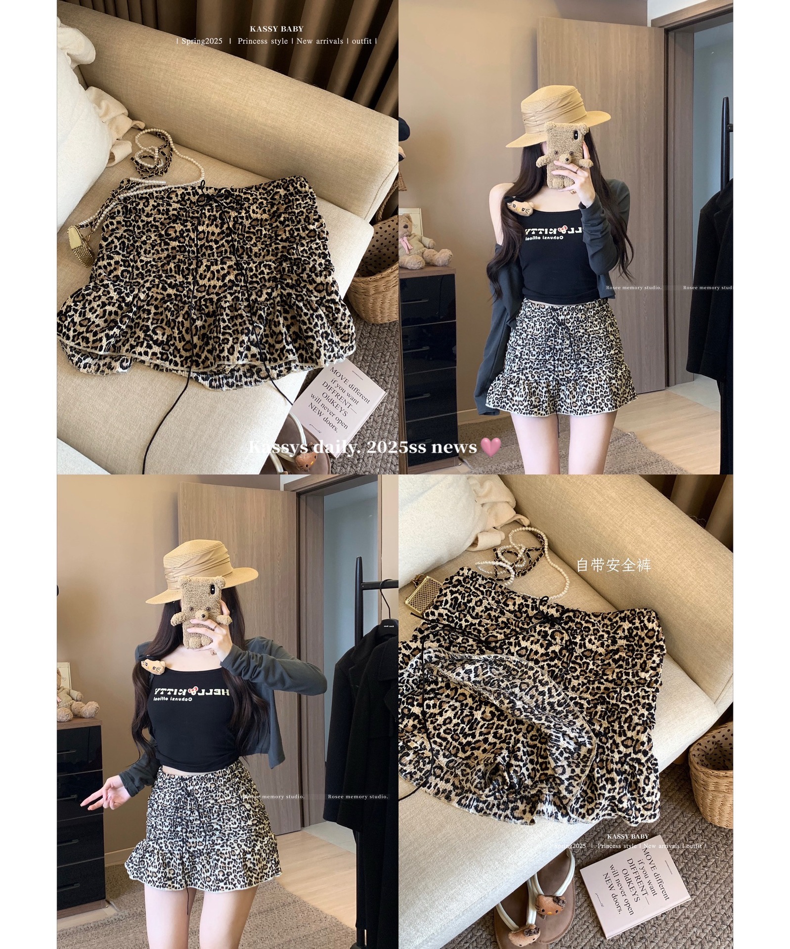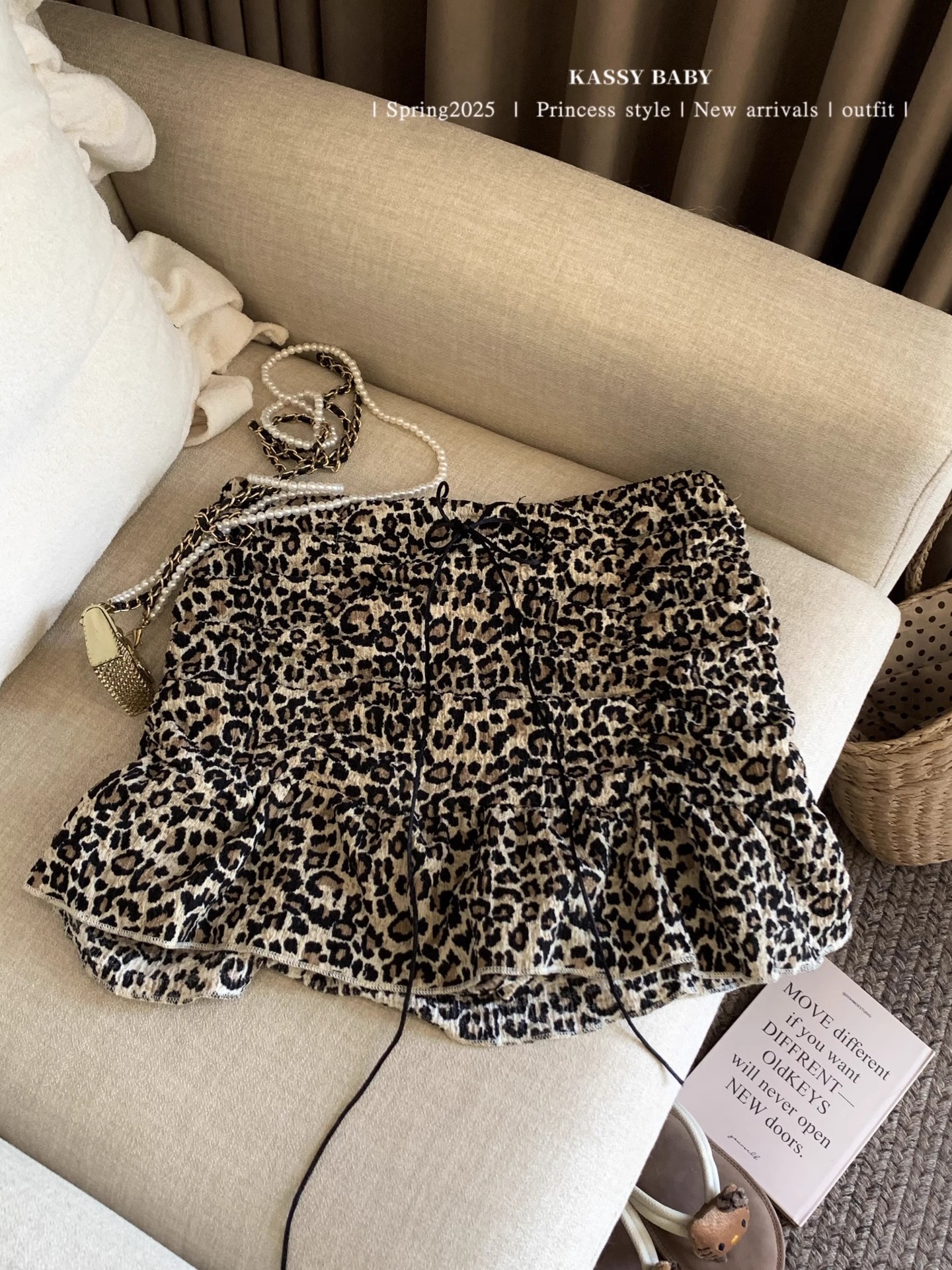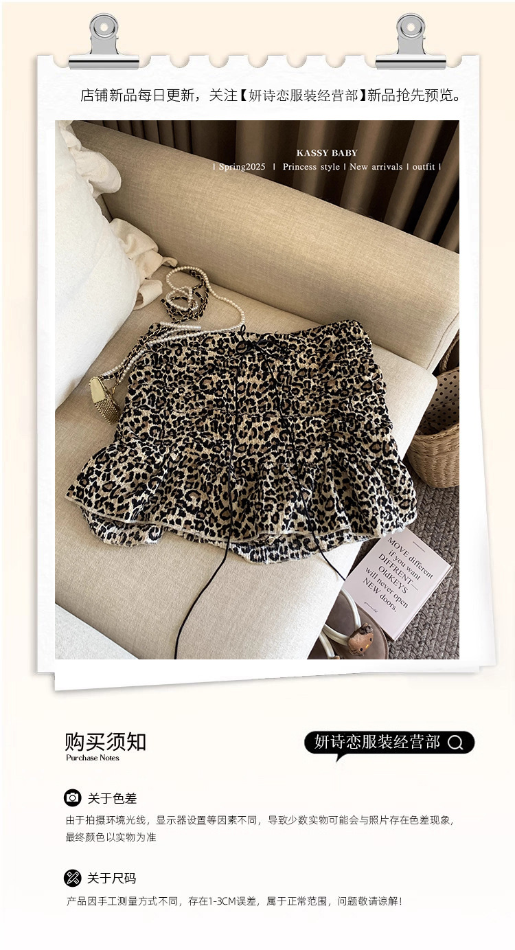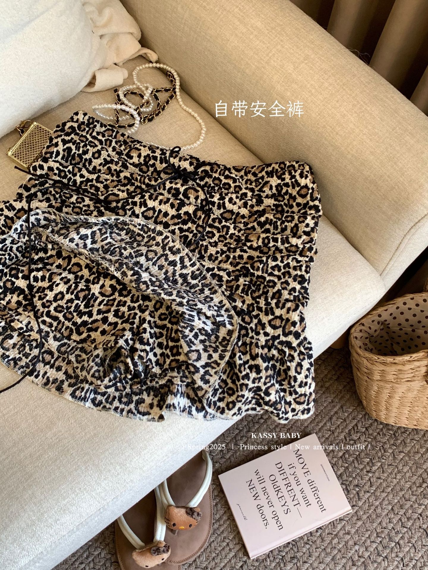 아메리칸 레트로 레오파드 프린트 레이스 업 러플 스커트 여성 여름 하이 웨이스트 슬리밍 노출 방지 A 라인 스커트 짧은 스커트스토어 가기