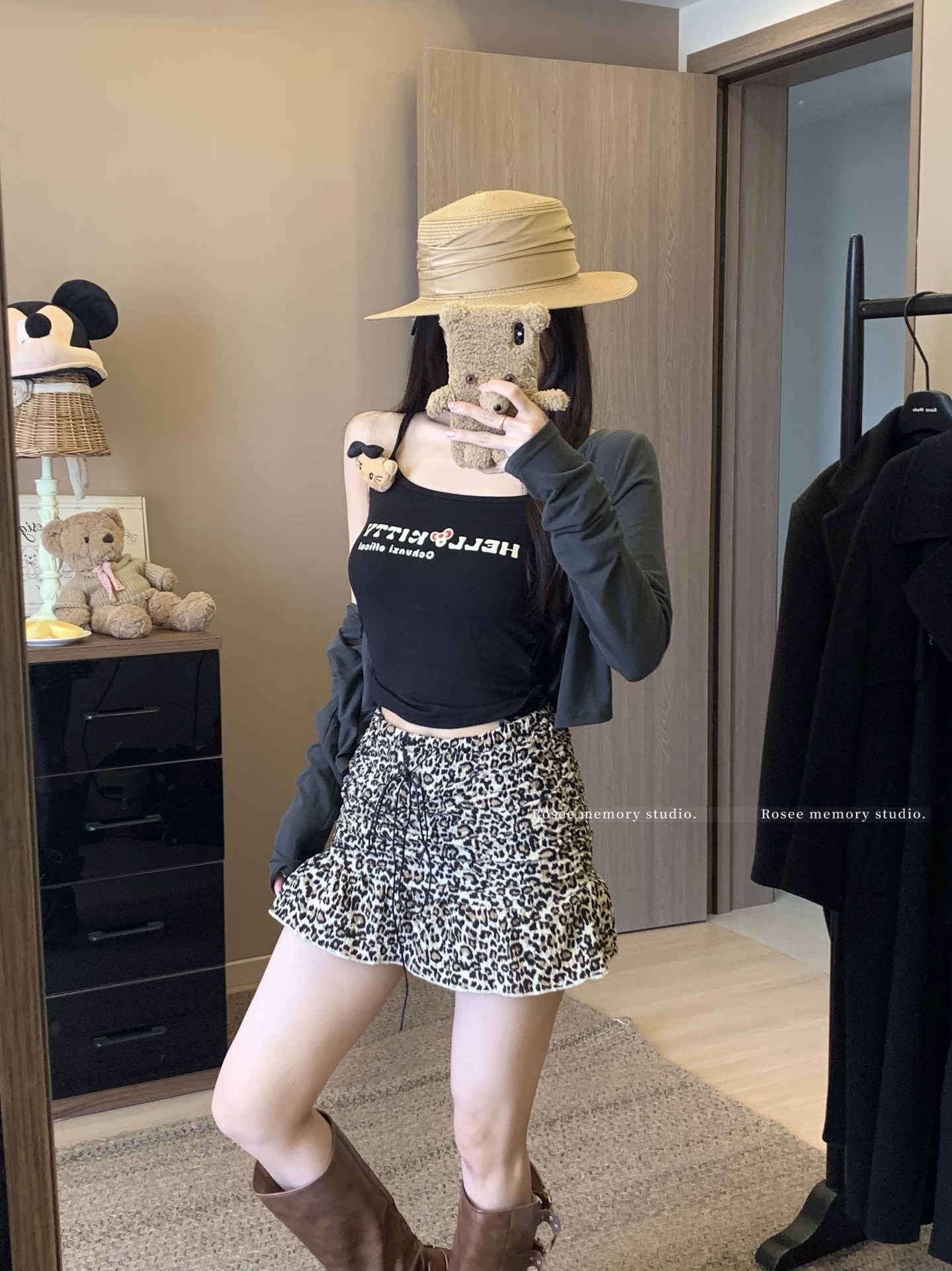 아메리칸 레트로 레오파드 프린트 레이스 업 러플 스커트 여성 여름 하이 웨이스트 슬리밍 노출 방지 A 라인 스커트 짧은 스커트