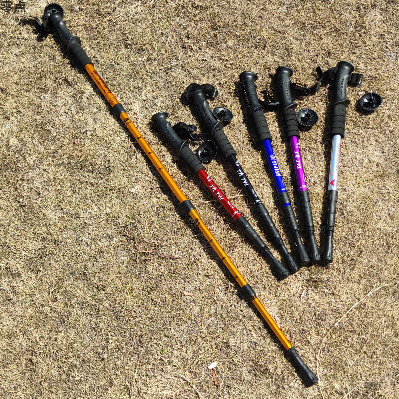 야외 트레킹 스틱 4 섹션 초경량 알루미늄 합금 T 핸들 곡선 핸들 스트레이트 핸들 텔레스코픽 하이킹 스틱 지팡이 다기능 및 경량스토어 가기
