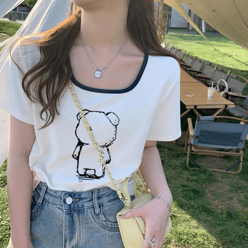 프렌치 스퀘어 넥 탑 여름 2025 새로운 스타일 독특하고 시크한 디자인 틈새 루즈 반팔 오른쪽 어깨 티셔츠 여성용스토어 가기