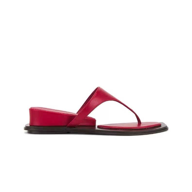 소가죽 버전 ~ 여성용 정품 가죽 웨지 레드 키높이 플립플롭 26 여름 신작 스퀘어 토 플립플롭 오픈토 샌들