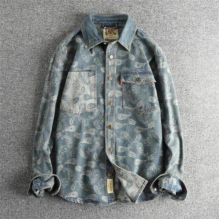 실염색 캐슈 플라워 패턴 라이트 럭셔리 레트로 아메리칸 데님 긴팔 셔츠 남성 작업복 스타일 청소년 셔츠 재킷 트렌디스토어 가기