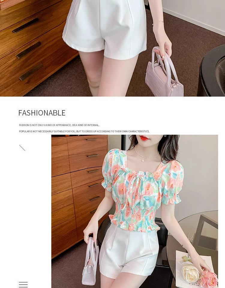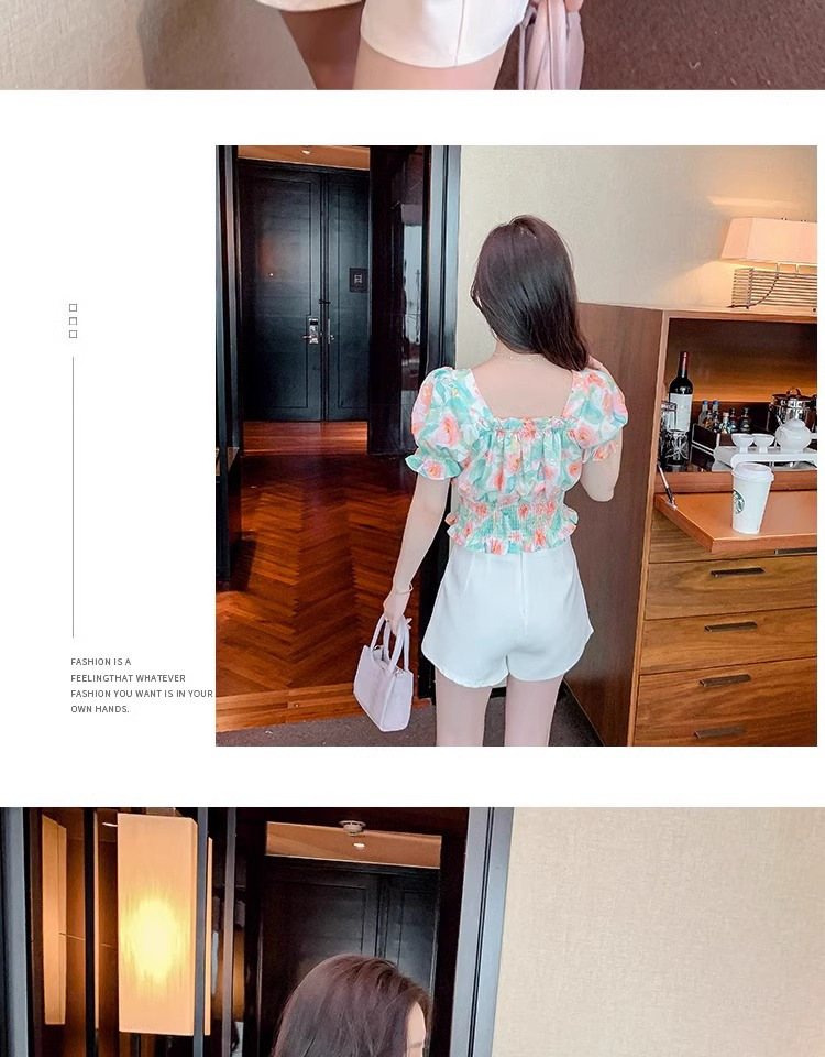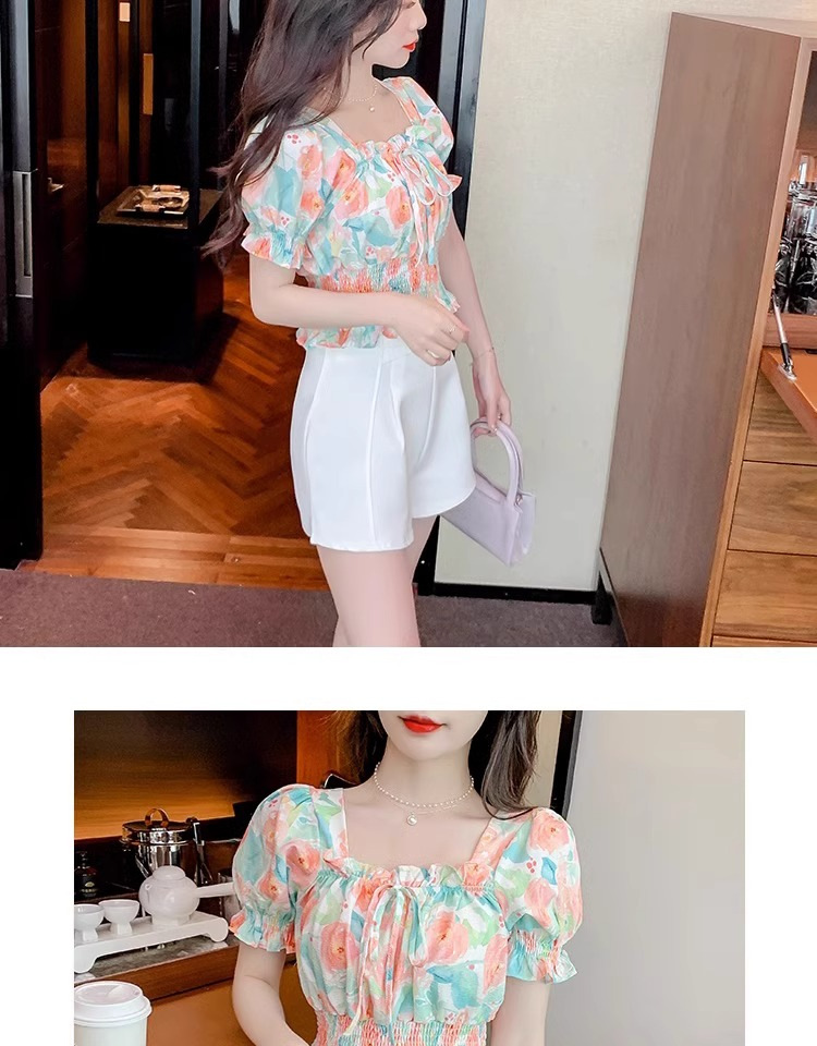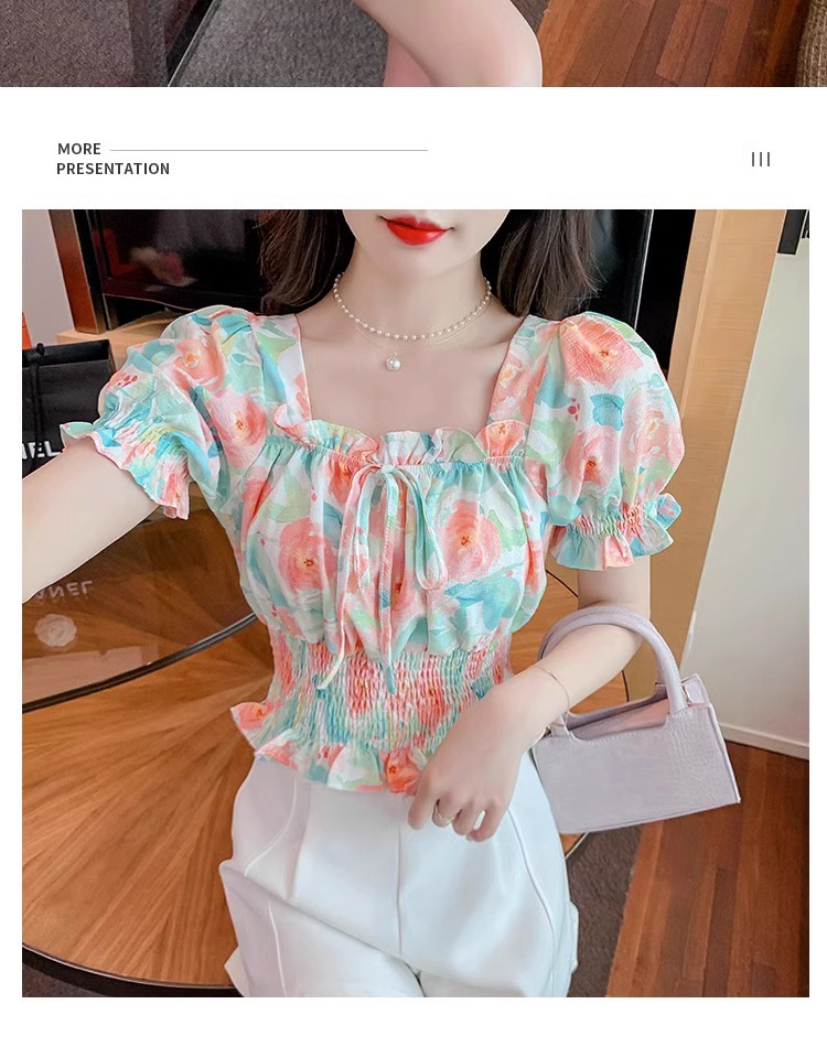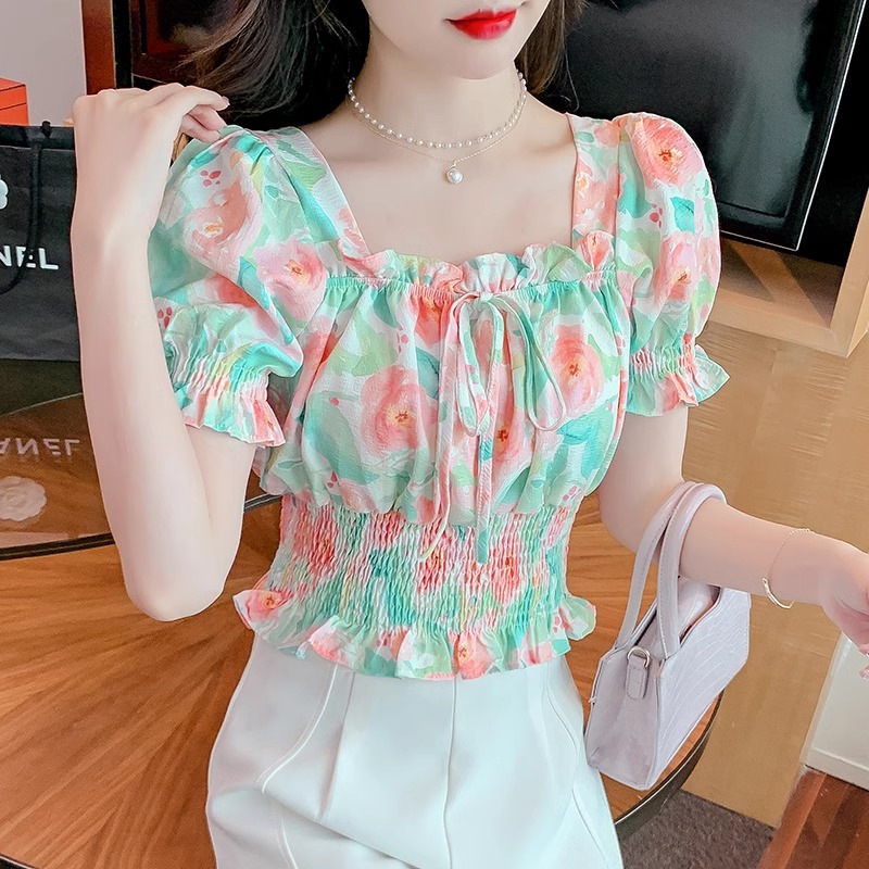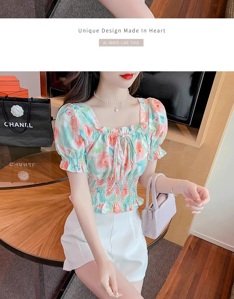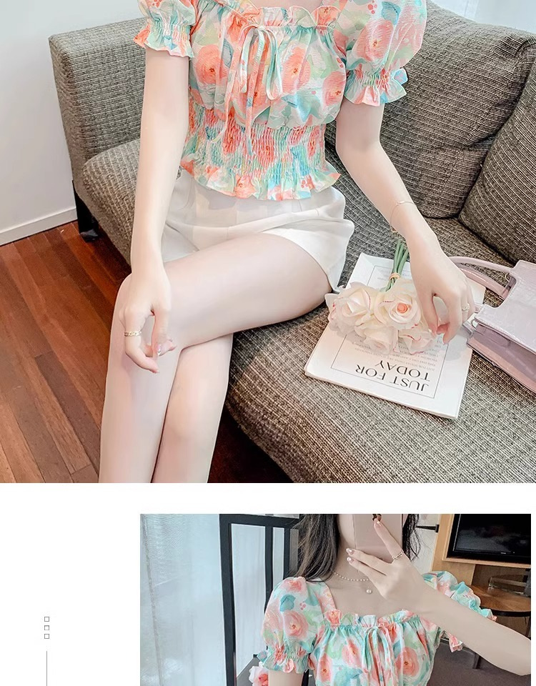 작고 상큼하고 달콤한 퍼프 슬리브 꽃무늬 쉬폰 쇼트 탑 여름 신작 원 숄더 허리 아름다운 셔츠 트렌디