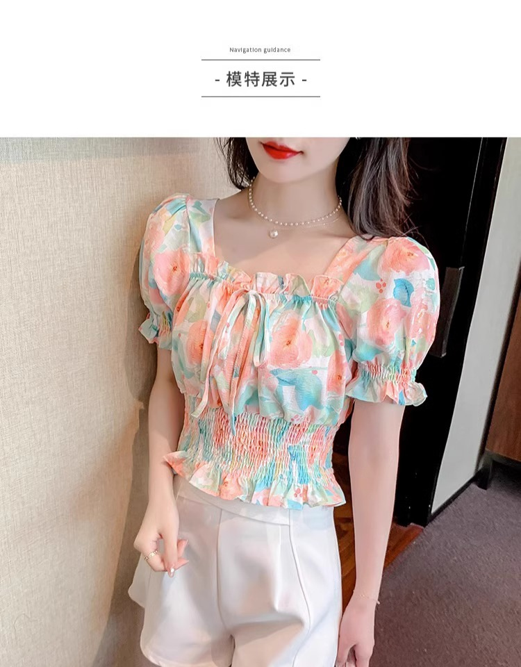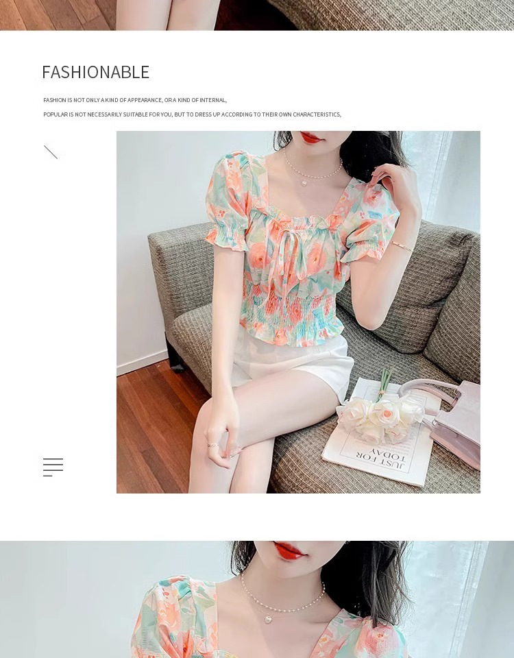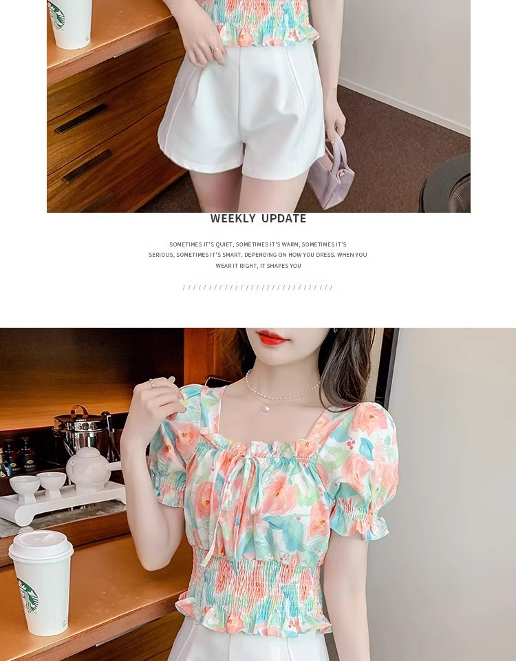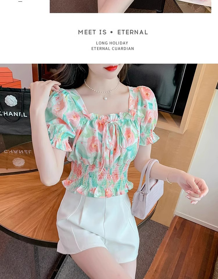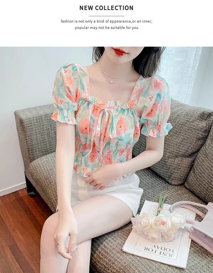 작고 상큼하고 달콤한 퍼프 슬리브 꽃무늬 쉬폰 쇼트 탑 여름 신작 원 숄더 허리 아름다운 셔츠 트렌디스토어 가기