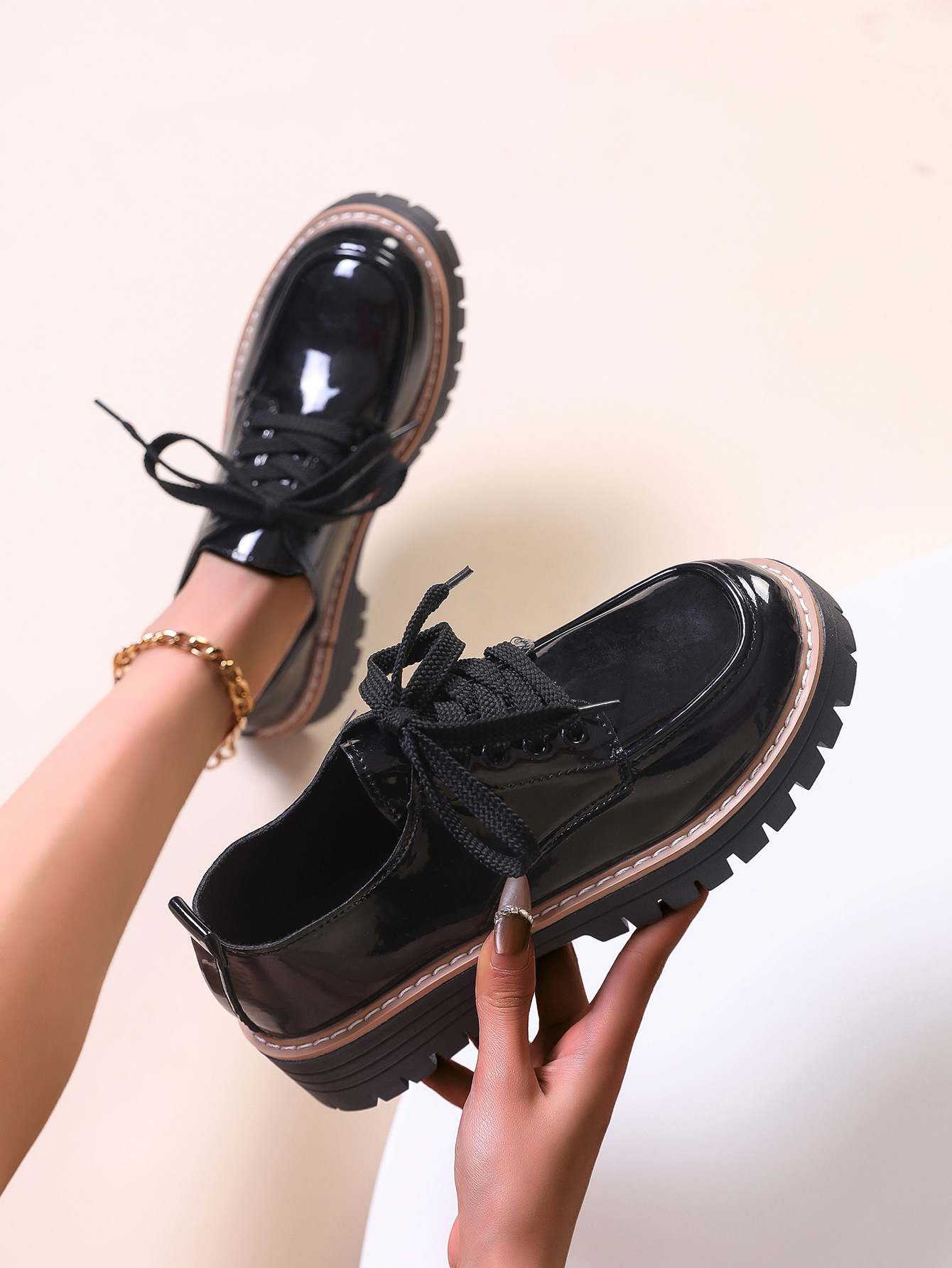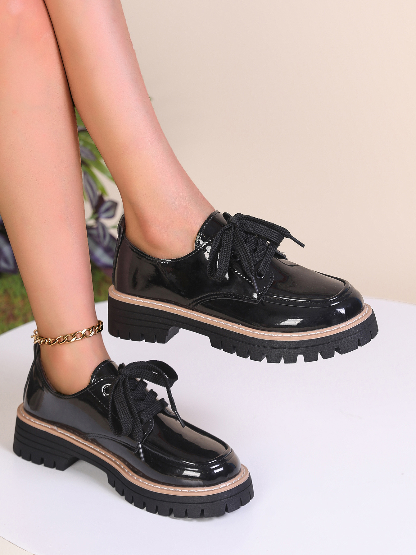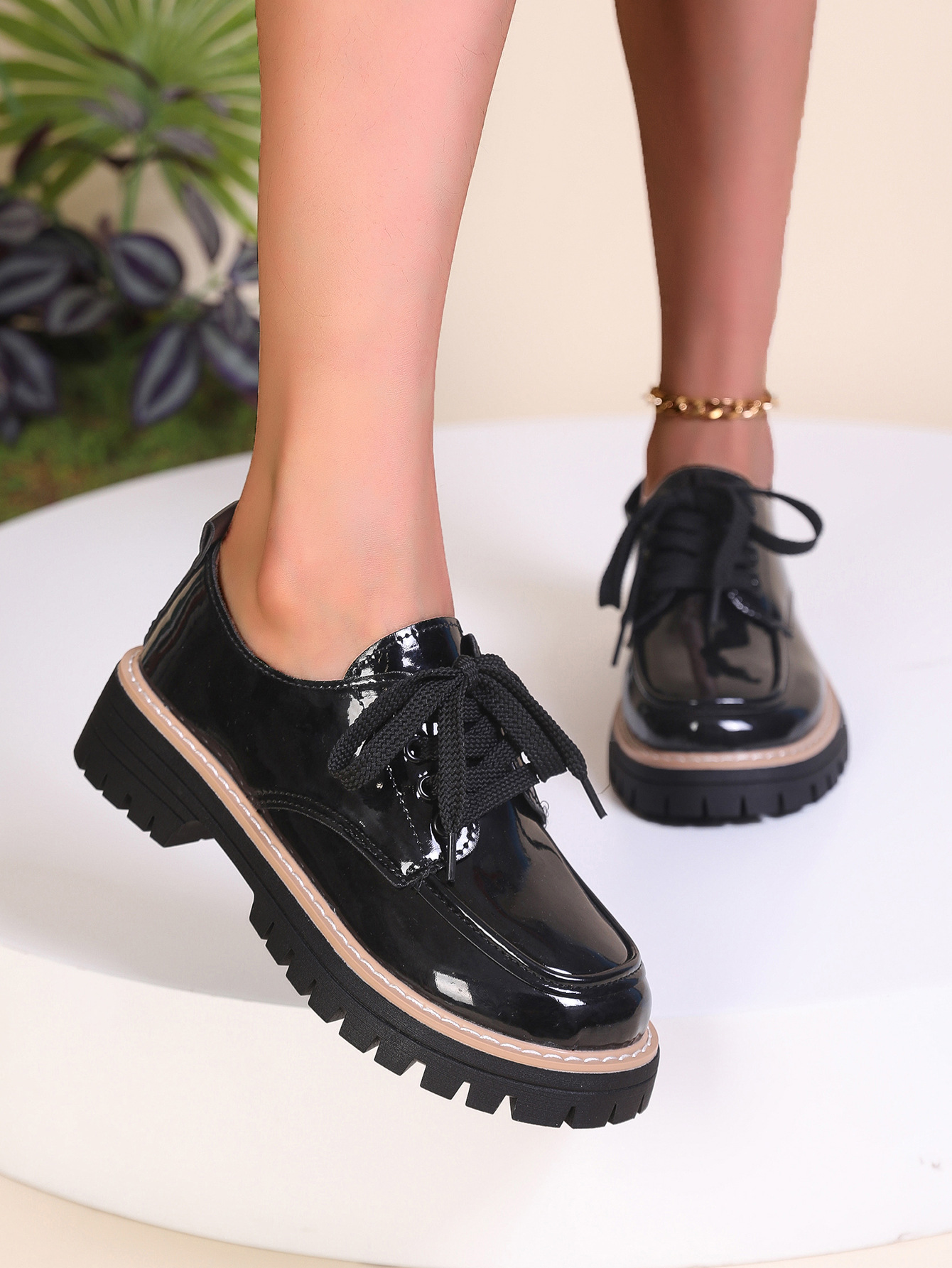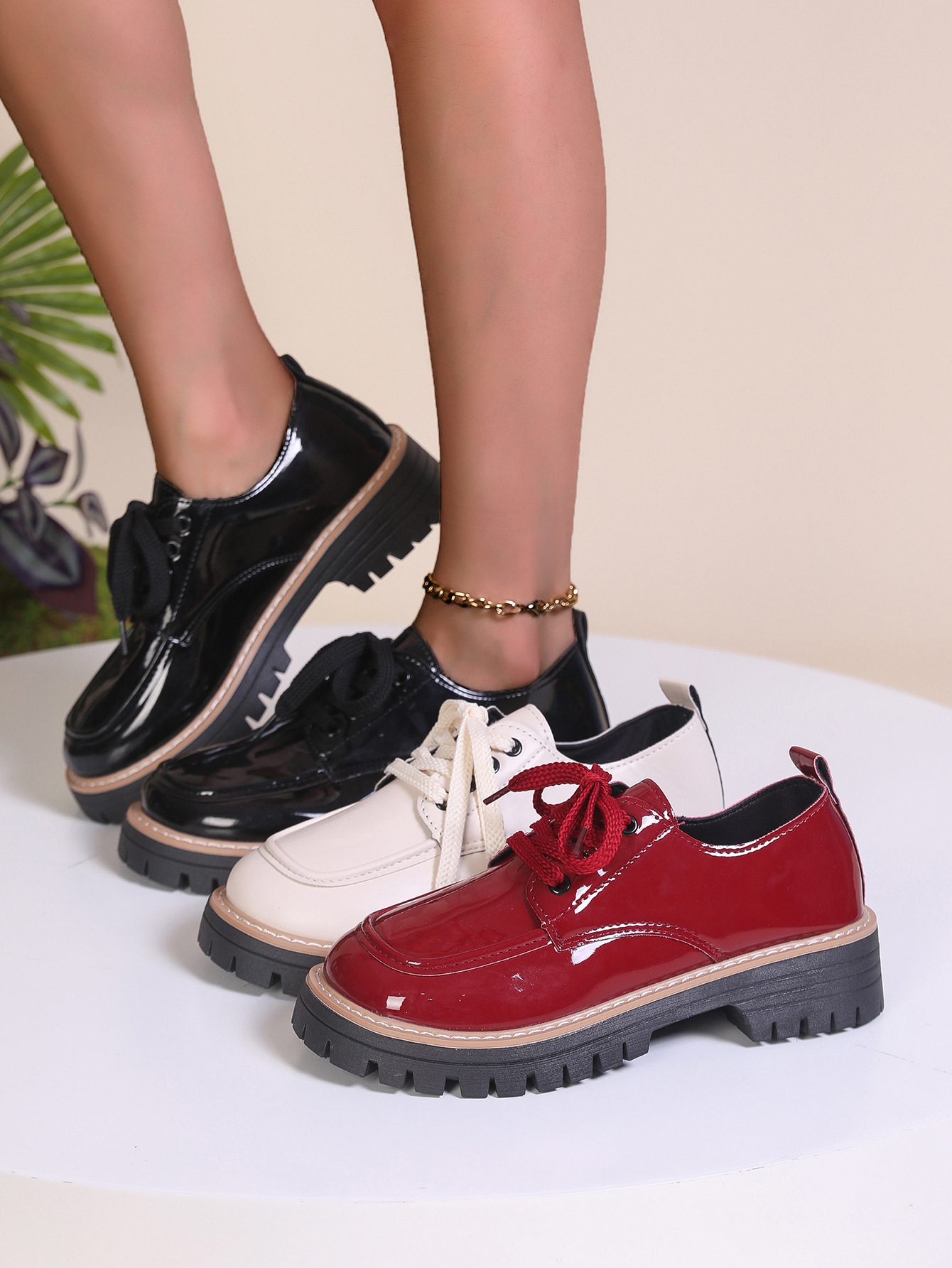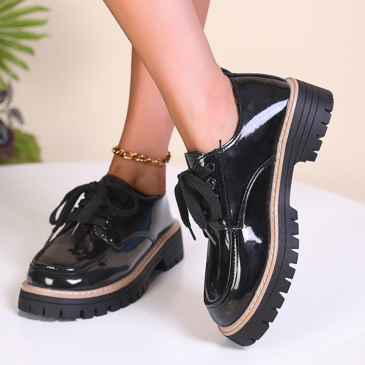 여성을위한 영국 스타일 작은 가죽 신발 2025 봄과 가을 새로운 스타일 라운드 발가락 레이스 업 대형 트렌디 캐주얼 신발 로퍼 도매스토어 가기