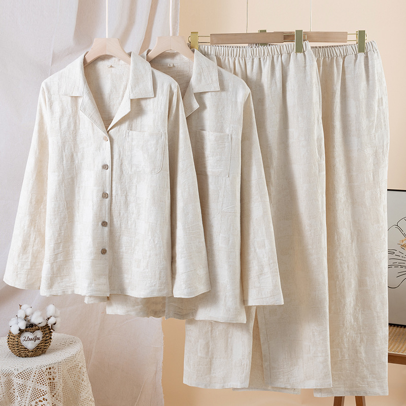 심플한 단색 면 및 린넨 잠옷, 커플 스타일, 봄, 가을, 여름 얇은 남성 및 여성 홈웨어 세트, 긴 소매로 착용 가능스토어 가기