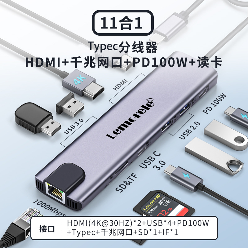 • 【11-in-1】2*HDMI+기가비트 이더넷 포트+PD100W+2*3.0USB+2*USB+카드 리더기