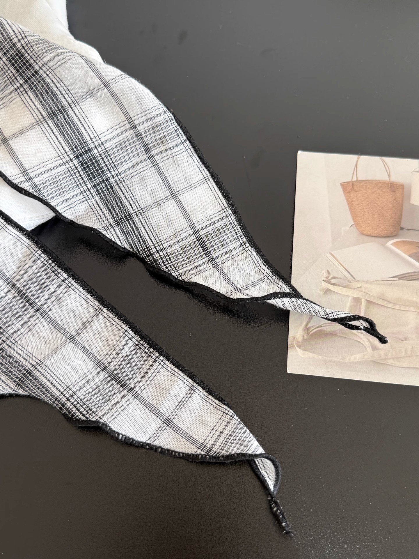 니치 스타일 한국 문학 격자 무늬 라인 삼각 스카프 여성 봄 여름 다용도 얇은 액세서리 실크 스카프 터번