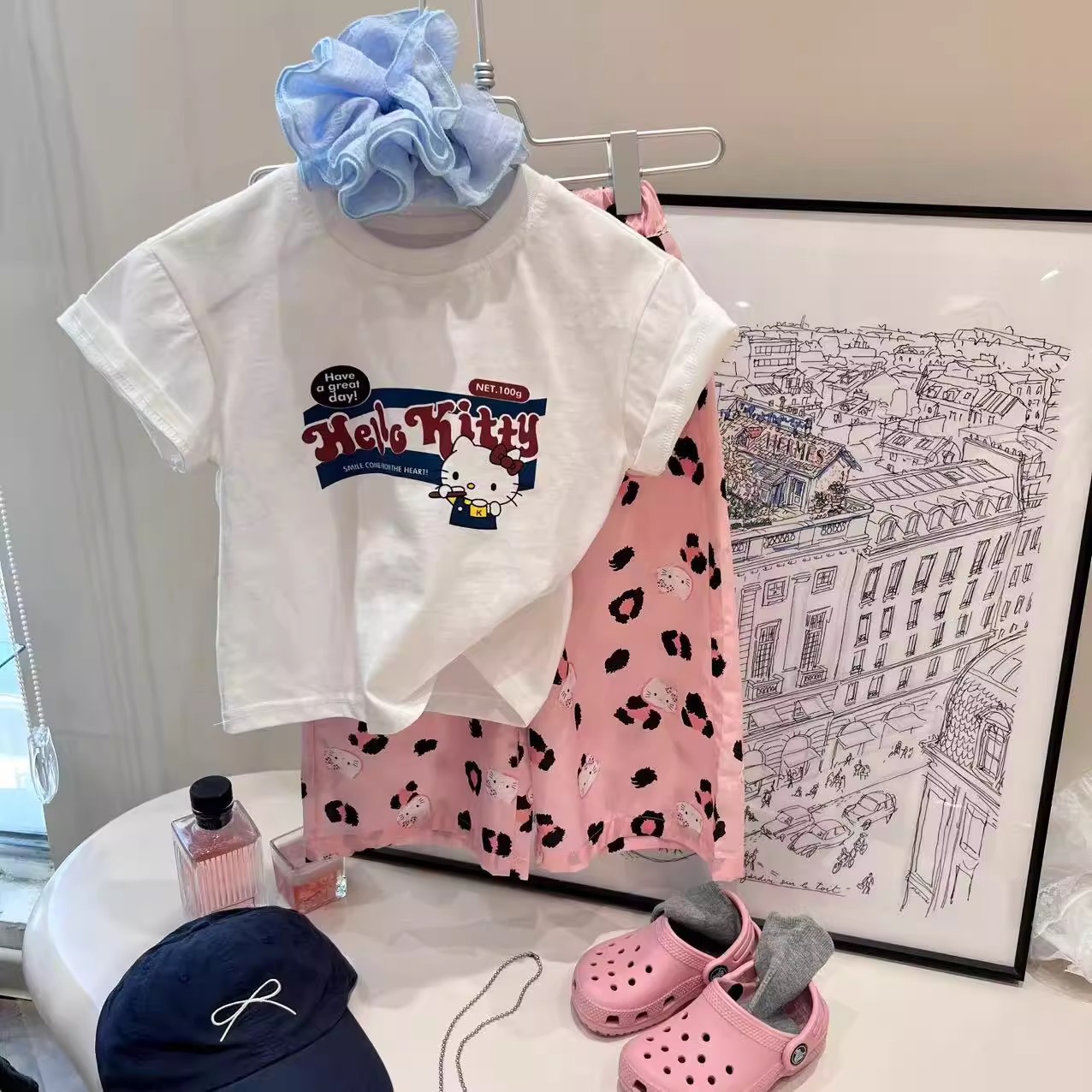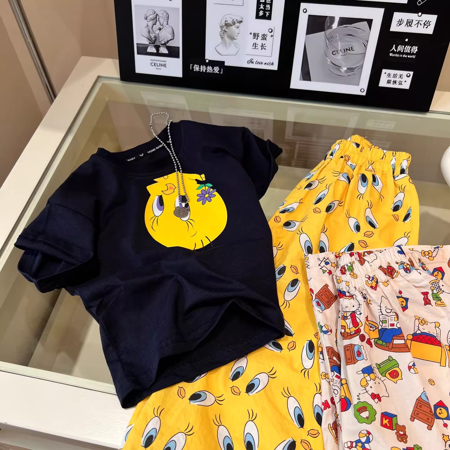 어린이 티셔츠 세트 2025 소녀 여름 새로운 한국 스타일 캐주얼 반팔 만화 인쇄 느슨한 스트레이트 바지