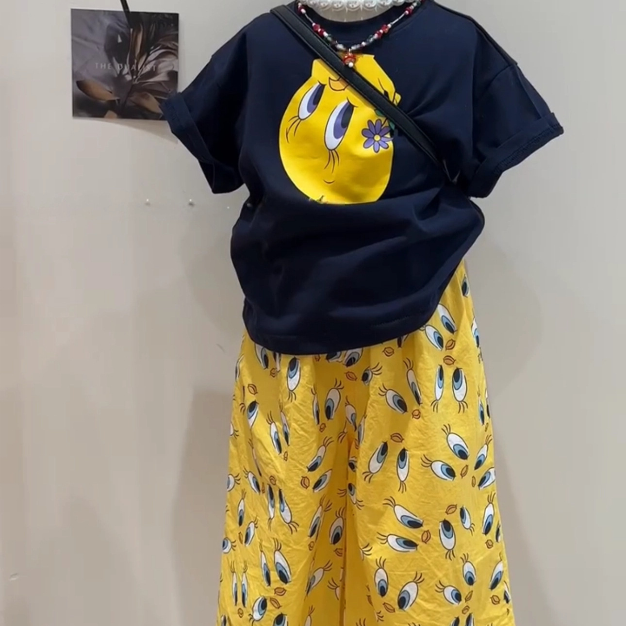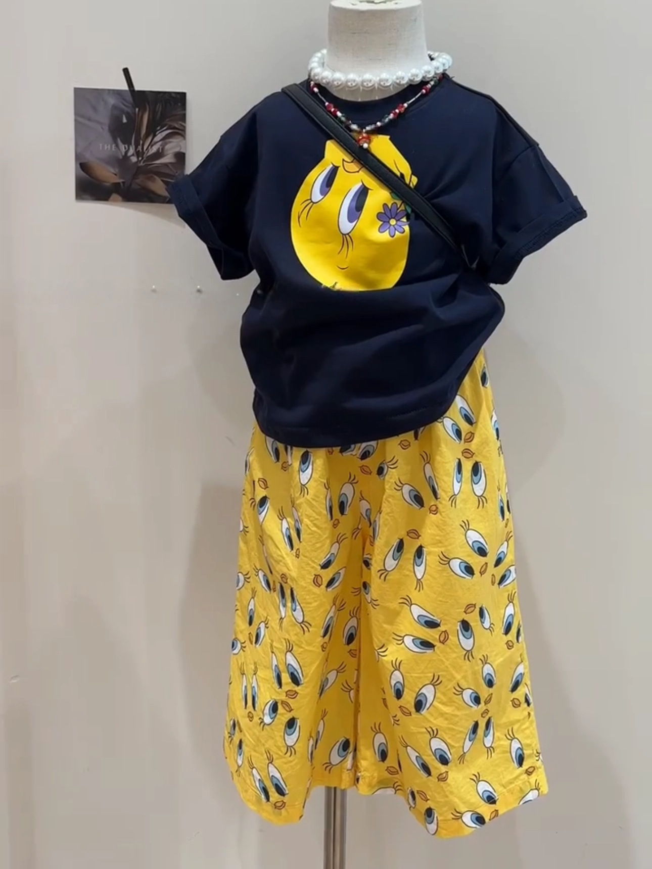 어린이 티셔츠 세트 2025 소녀 여름 새로운 한국 스타일 캐주얼 반팔 만화 인쇄 느슨한 스트레이트 바지스토어 가기