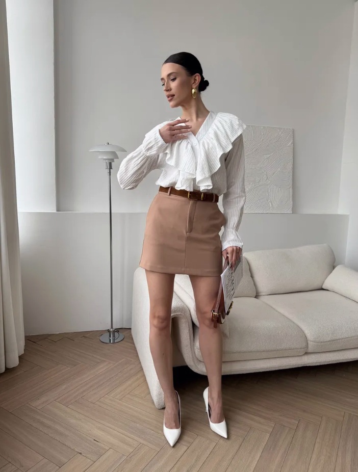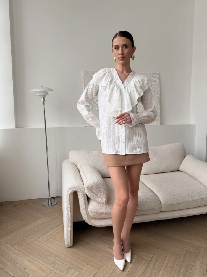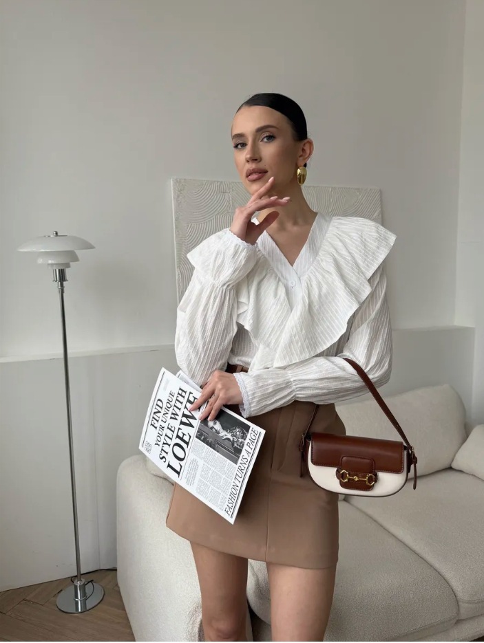 대외 무역 세련된 봄 프렌치 스타일 브이넥 러플 벨 슬리브 솔리드 컬러 디자인 여성용 다용도 셔츠 탑