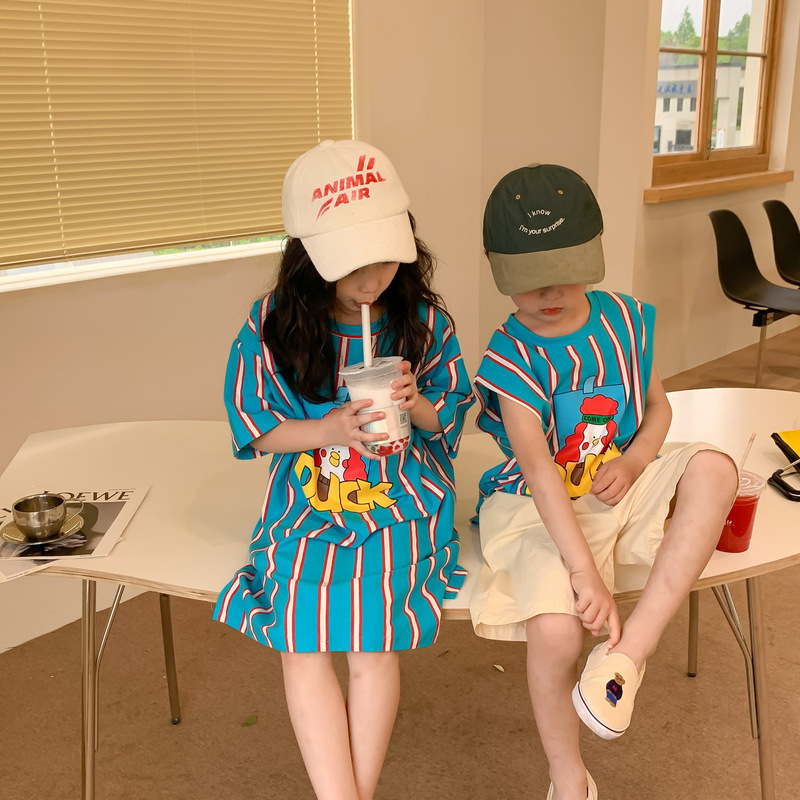 형제와 자매 의류 아동 티셔츠 2025 여름 스타일 소년과 소녀 한국어 버전 스트라이프 프린트 반팔 티셔츠 아동 캐주얼 드레스
